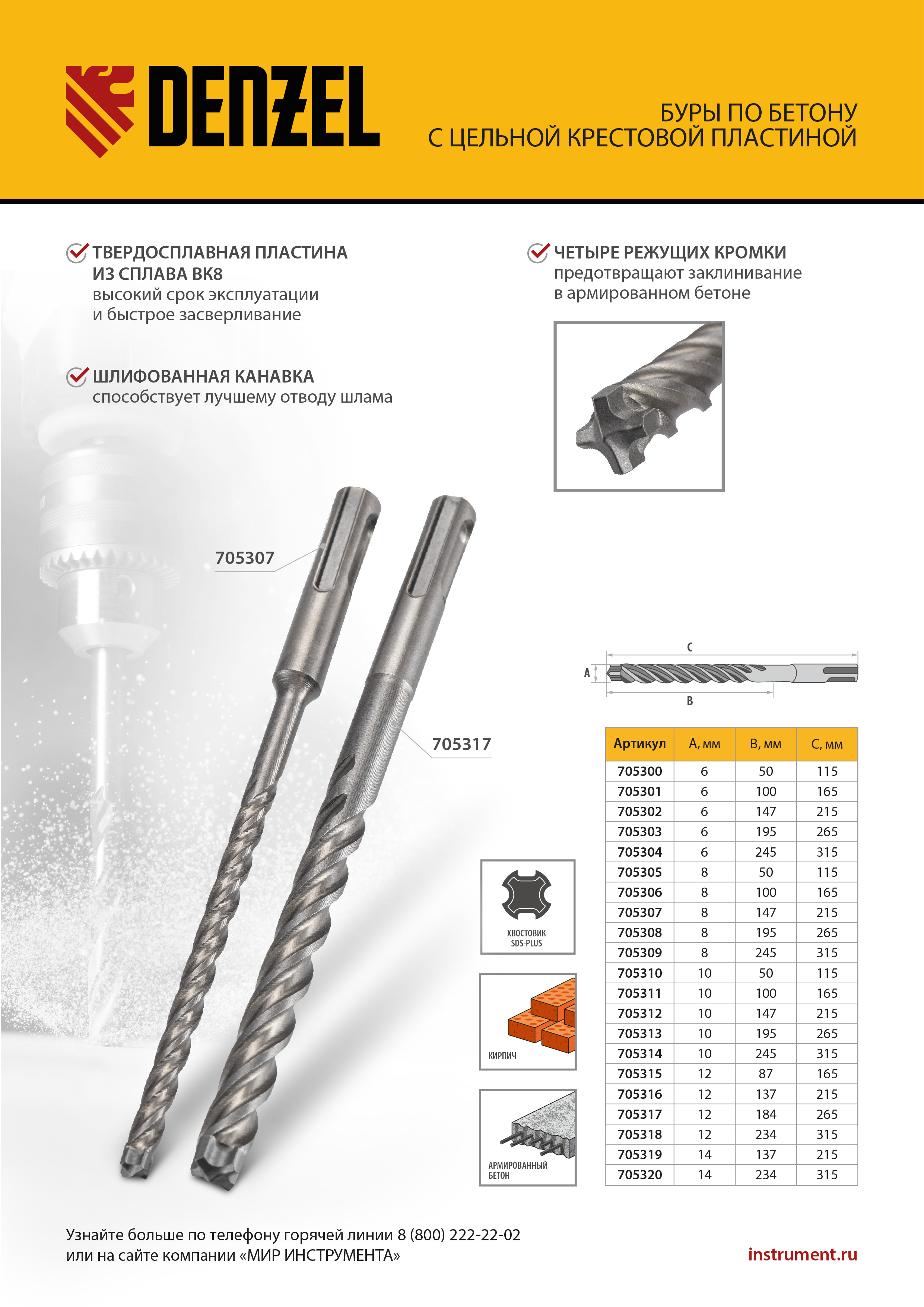 Бур по бетону Denzel 705318 длиной 315 мм, с цельной крестовой пластиной и хвостовиком SDS-plus — оснастка для перфораторов, предназначенная для получения отверстий диаметром 12 мм в бетоне, кирпиче, камне. Благодаря цельному карбидному наконечнику с 4 режущими кромками бур оптимален для работы с материалами высокой твердости, в том числе с армированным бетоном. Оснастка превосходит большинство аналогов по своим рабочим качествам и подходит для профессионального использования.