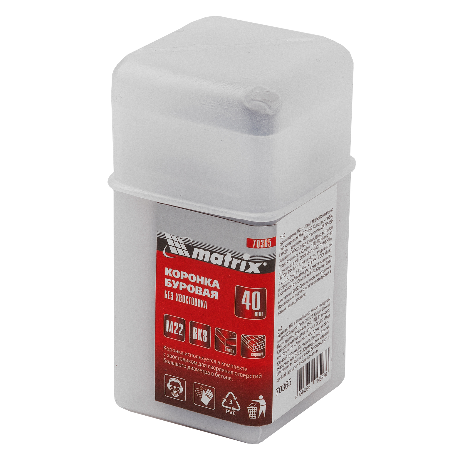 Буровая коронка M22 х 40 мм Matrix 70365 рассчитана на сверление отверстий в бетоне, кирпиче, граните, природном и искусственном камне. Устанавливается на ударные дрели или перфораторы с патронами под хвостовик SDS-Plus или SDS-Max. Коронка позволяет получить большие отверстия, поэтому пригодится для монтажа розеток, выключателей и прокладки труб.