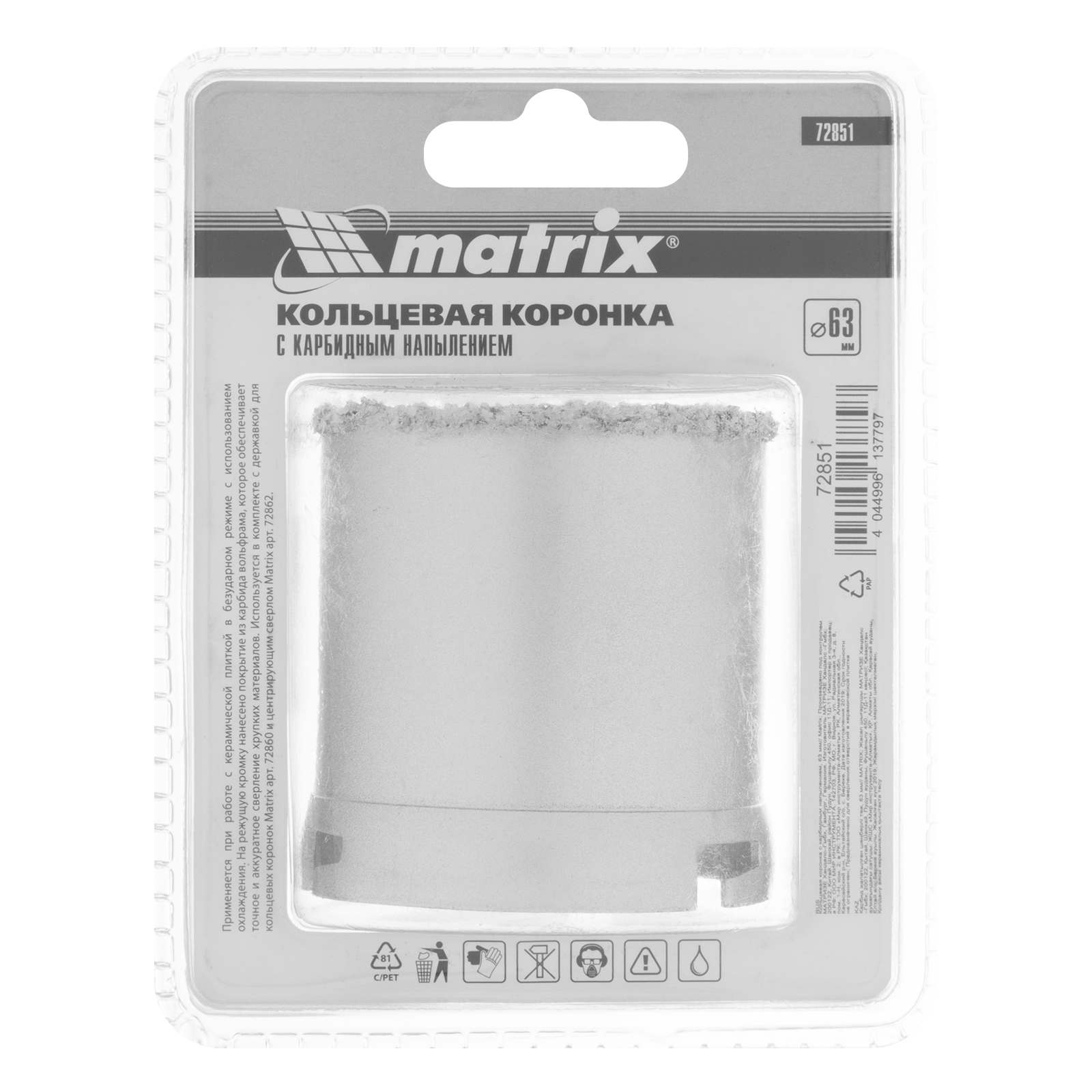 Кольцевая коронка с карбидным напылением Matrix 72851 диаметром 63 мм — сменный режущий элемент для дрелей и перфораторов. Предназначена для сверления отверстий в керамической плитке, ячеистом бетоне, пенобетоне, газосиликате, кирпиче. Пригодится для монтажа проводки в доме. Используется совместно с державкой Matrix 72860 и центрирующим сверлом Matrix 72862 (не входят в комплект поставки).