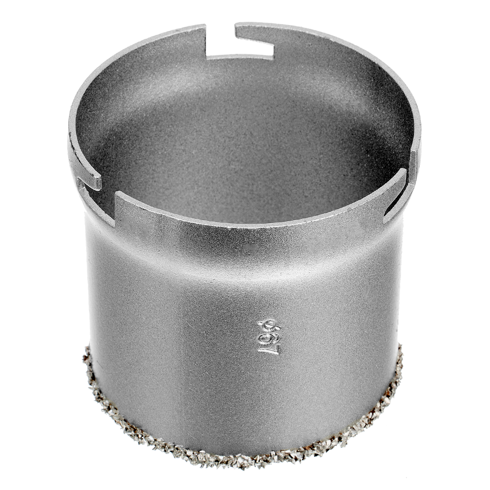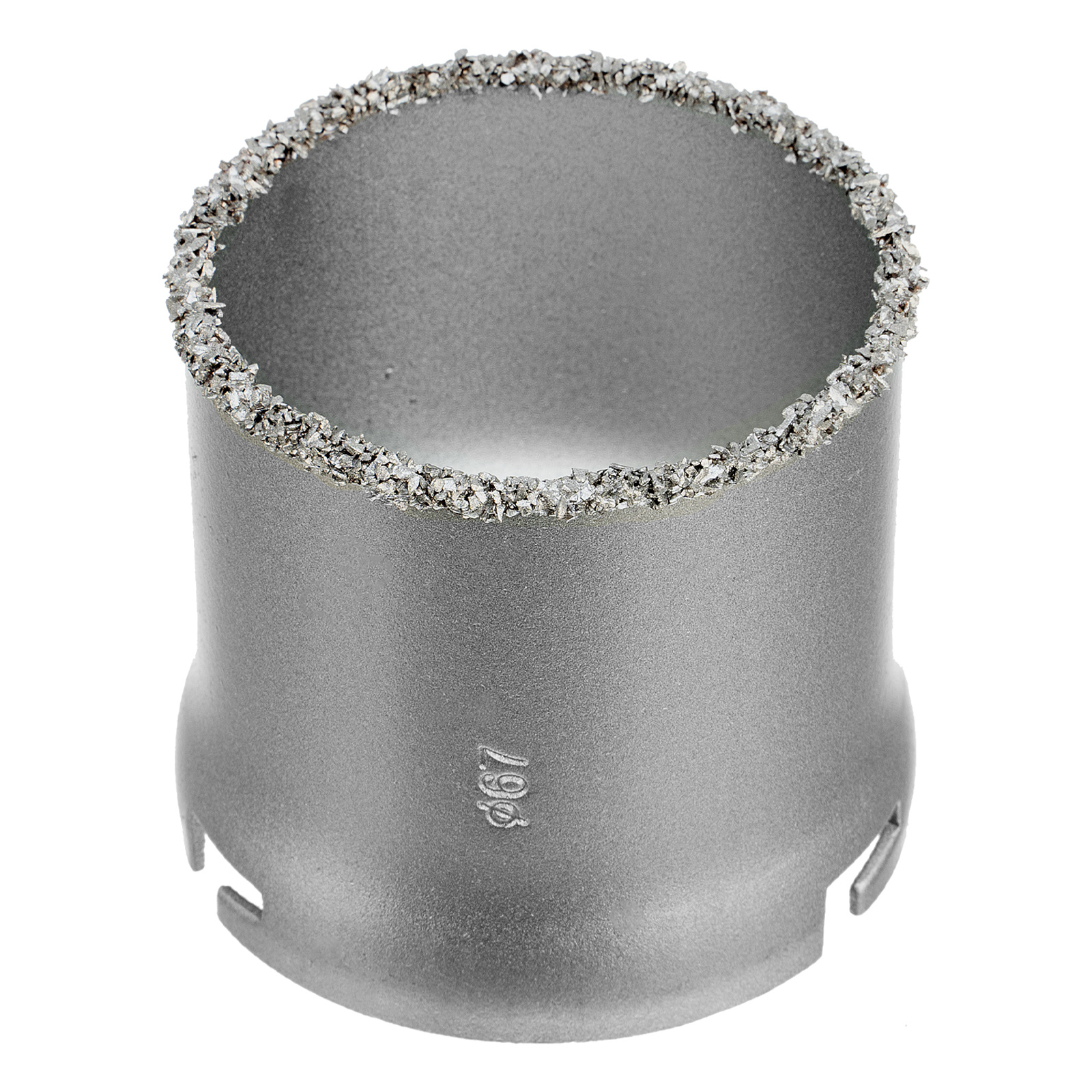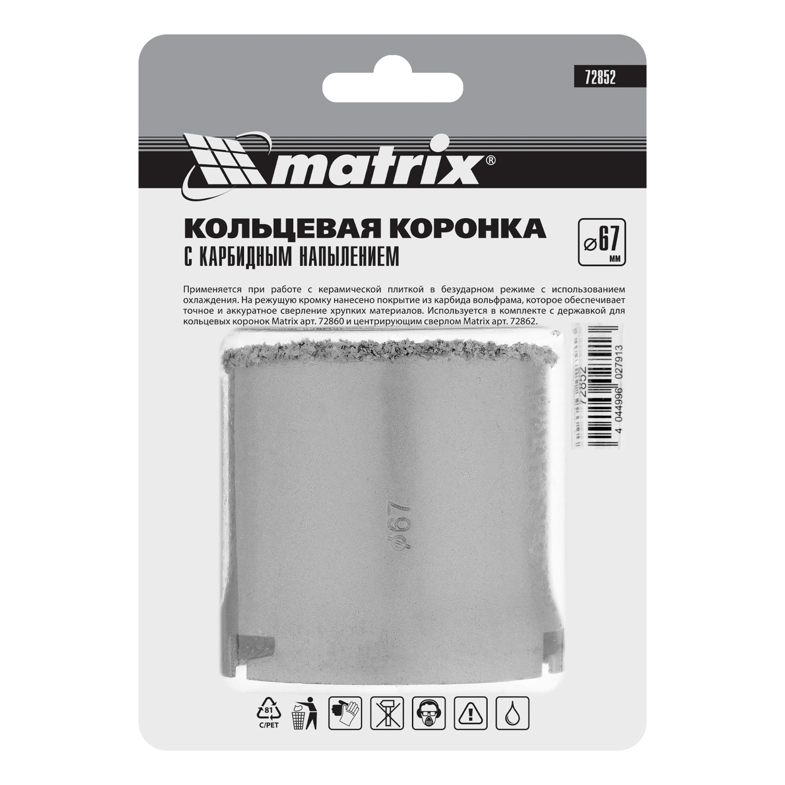 Кольцевая коронка с карбидным напылением Matrix 72852 диаметром 67 мм — сменный режущий элемент для дрелей и перфораторов. Предназначена для сверления отверстий в керамической плитке, ячеистом бетоне, пенобетоне, газосиликате, кирпиче. Пригодится для монтажа проводки в доме. Используется совместно с державкой Matrix 72860 и центрирующим сверлом Matrix 72862 (не входят в комплект поставки).