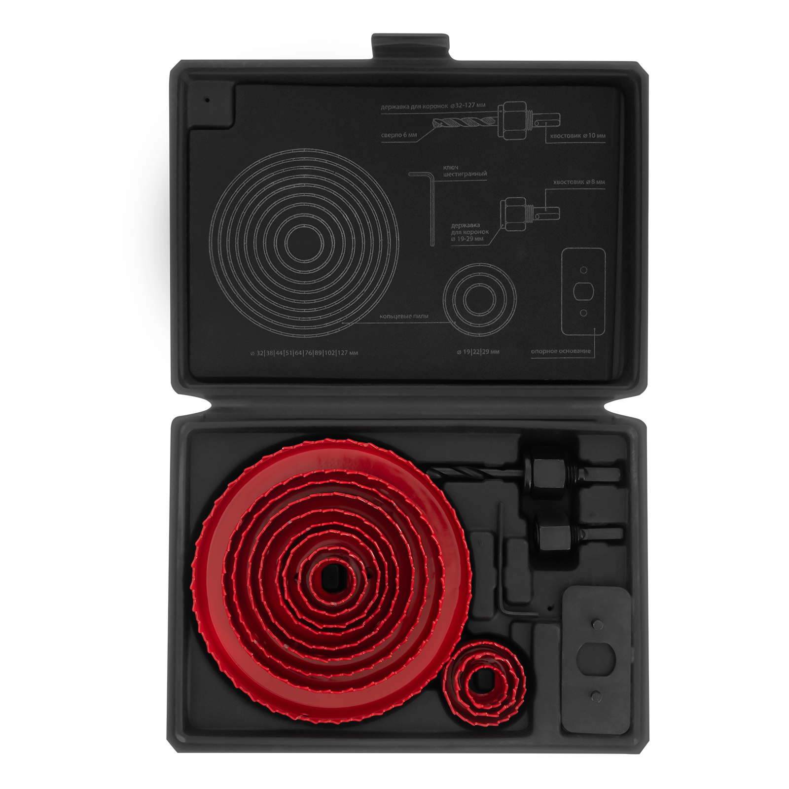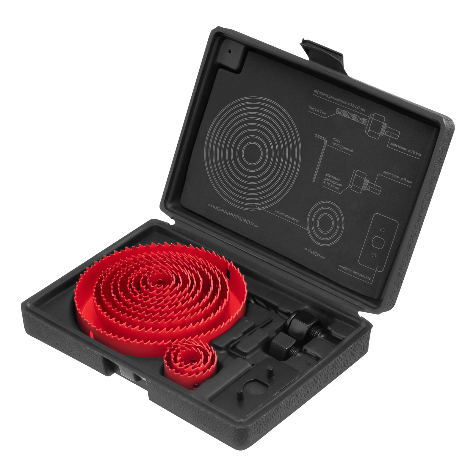 Набор кольцевых пил Matrix 70472 из 12 предметов предназначен для работы по дереву и включает в себя коронки диаметром 19-127 мм. Они устанавливаются на электродрель и служат для выпиливания круглых отверстий глубиной до 27 мм в древесине, фанере, гипсокартоне, ДСП, ДВП и пластике. Малая и большая державки облегчают установку пил разного диаметра. Набор пригодится во время ремонта — с его помощью можно прорезать отверстия под розетки, выключатели, светильники и трубы.