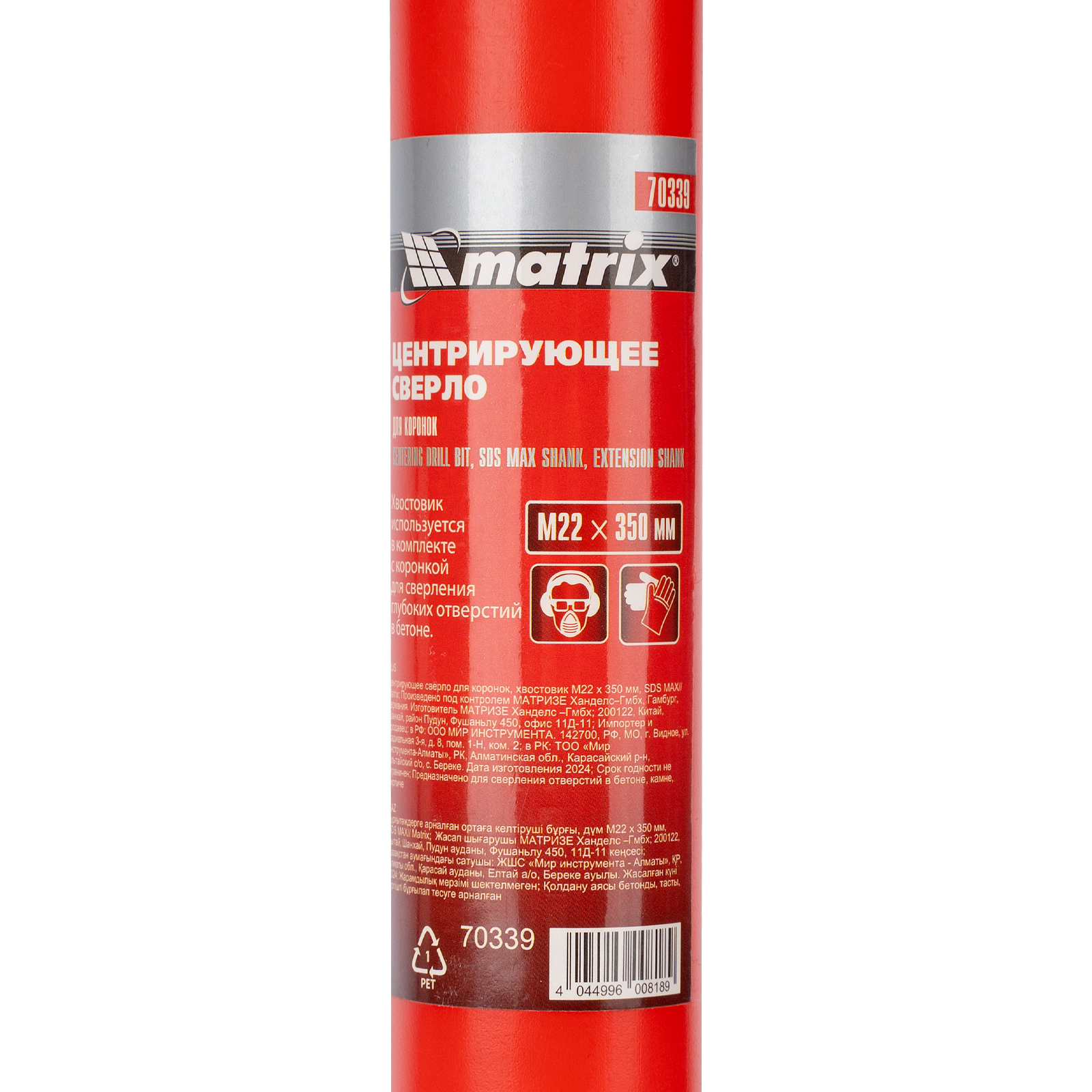 Центрирующее сверло для коронок Matrix 70339 с хвостовиком SDS MAX длиной 350 мм, с посадкой М22, используется для получения отверстий в бетоне. Позволяет выполнять глубокое засверливание, предотвращает смещение коронки и повышает точность работы. Хвостовик SDS MAX совместим с патронами тяжелых перфораторов.