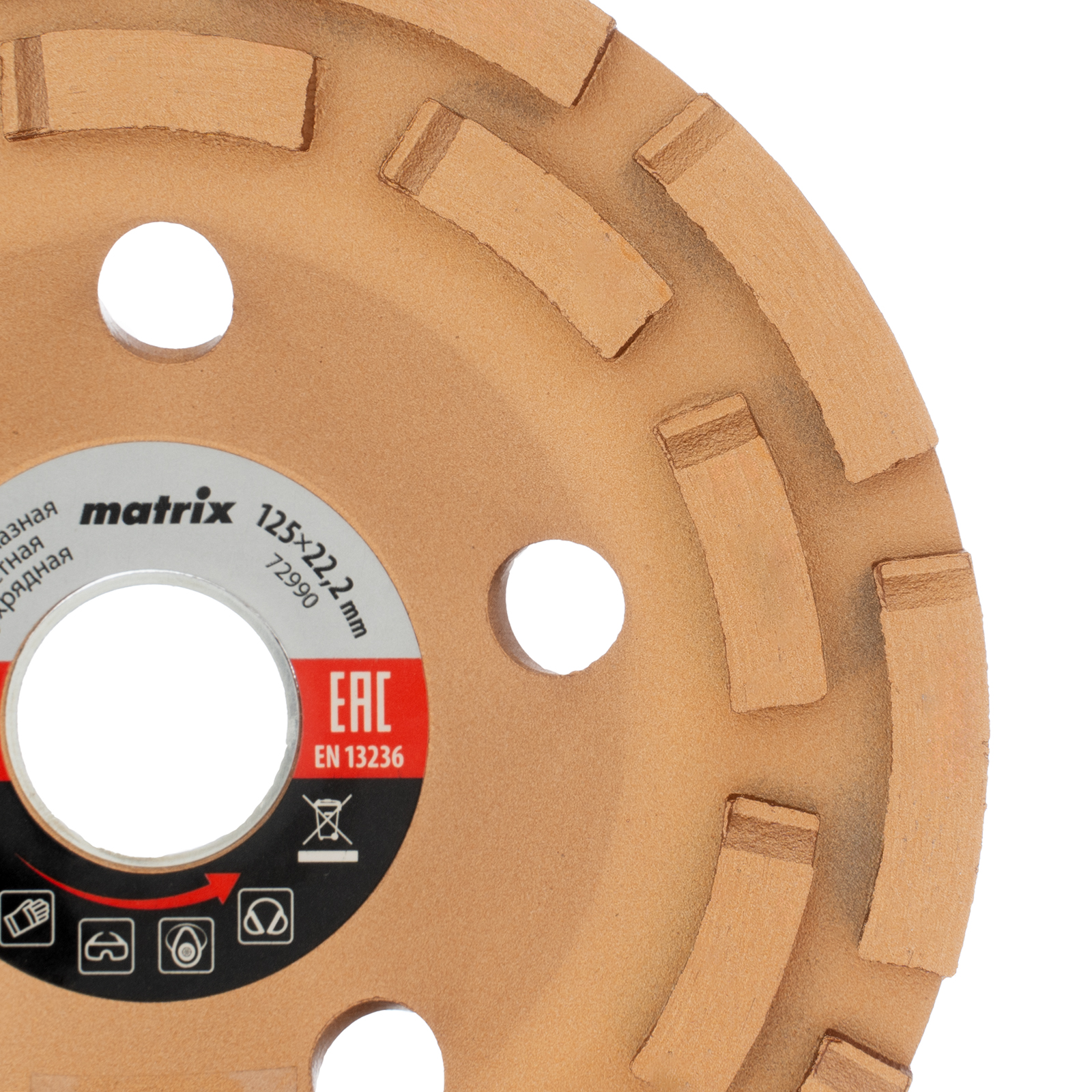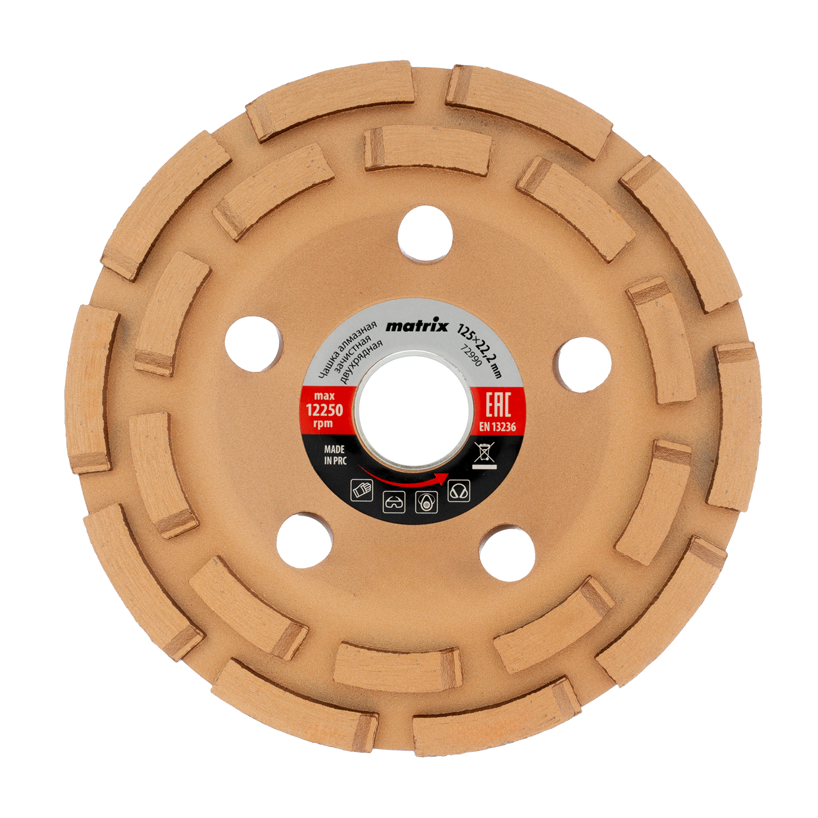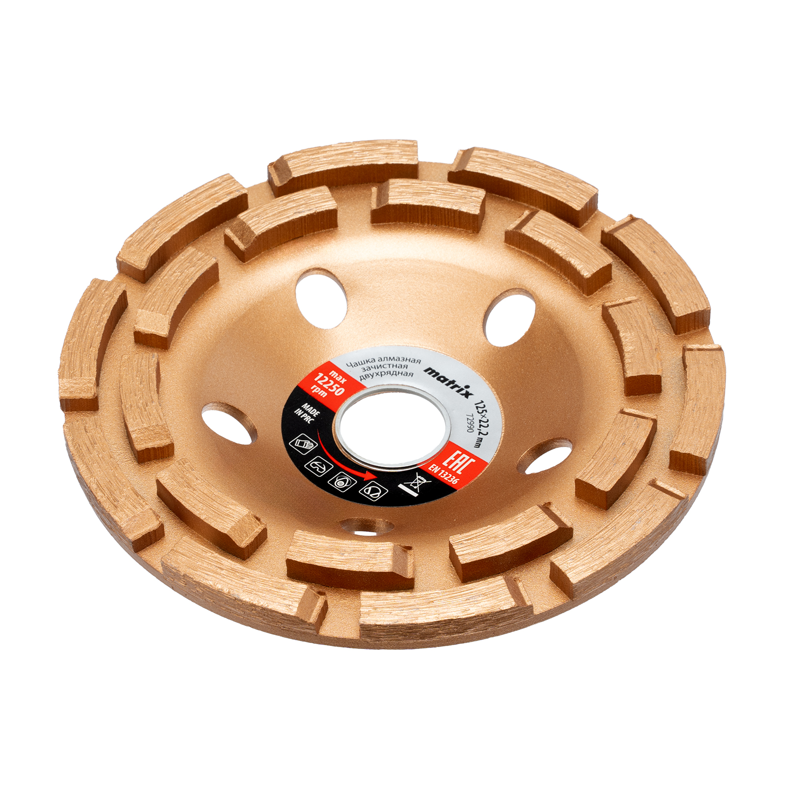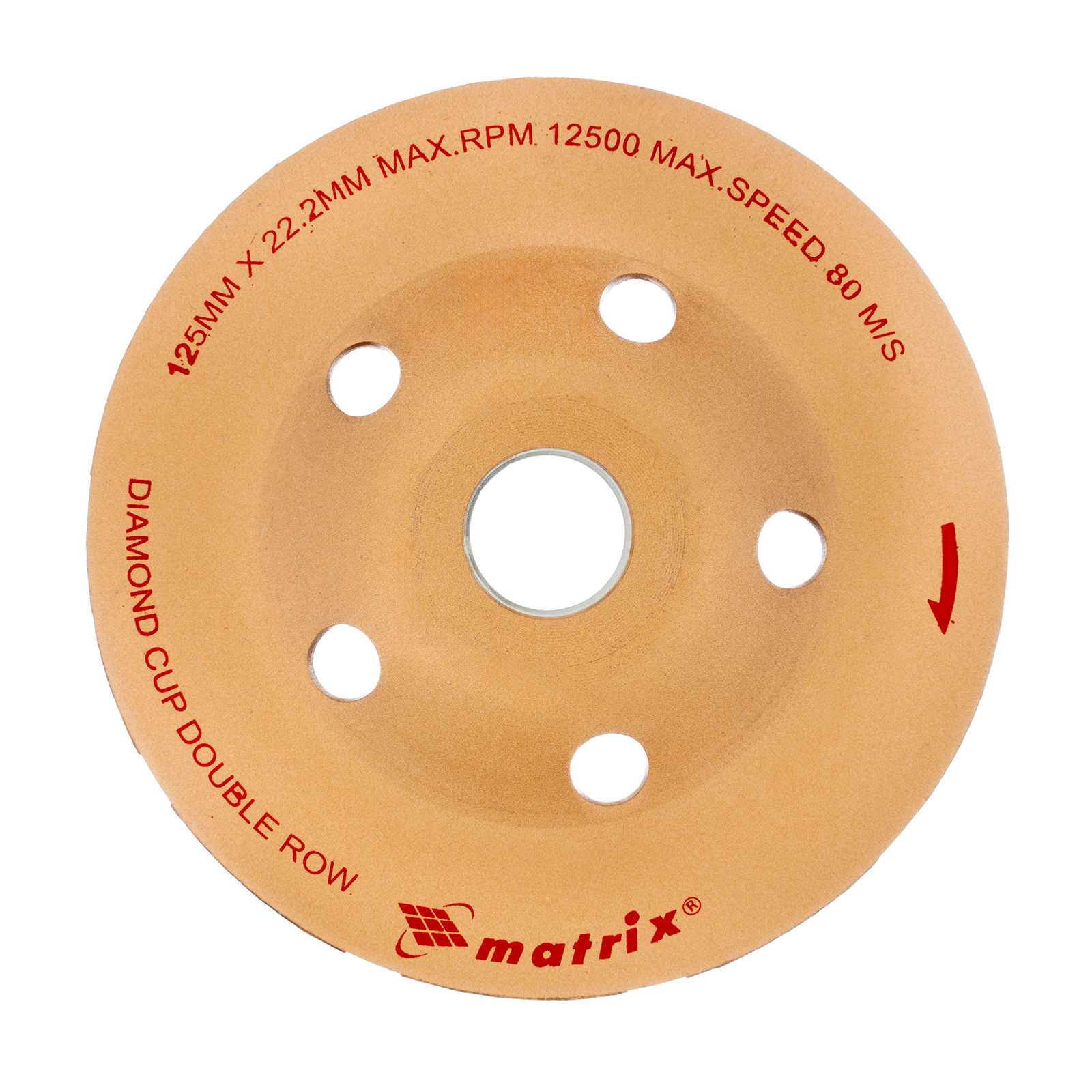 Двухрядная алмазная зачистная чашка Matrix 72990 диаметром 125 мм, с посадочным отверстием 22,2 мм, — оснастка для углошлифовальных машин, предназначенная для грубой обработки бетонных, каменных, кирпичных, мраморных и гранитных поверхностей. Позволяет проводить зачистку швов, стыков, неровностей, удаление наплывов. Придает поверхности шероховатость для улучшения ее адгезивной способности перед нанесением строительных растворов. Чашка предназначена для профессионального применения.