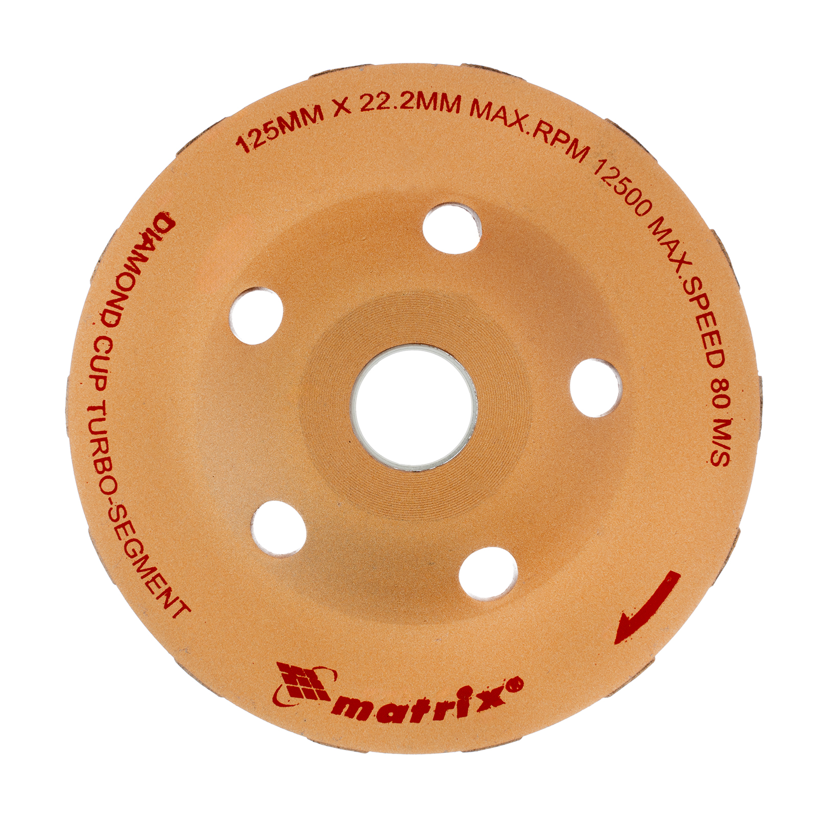 Алмазная зачистная чашка Matrix Турбо-сегмент 72988 диаметром 125 мм имеет посадочное отверстие 22,2 мм и устанавливается на вал углошлифовальной машины. Используется для шлифования бетона, камня, кирпича, мрамора и гранита с целью устранения неровностей, зачистки швов, а также придания гладкости поверхности. Зачистная чашка рекомендована для профессионального использования.