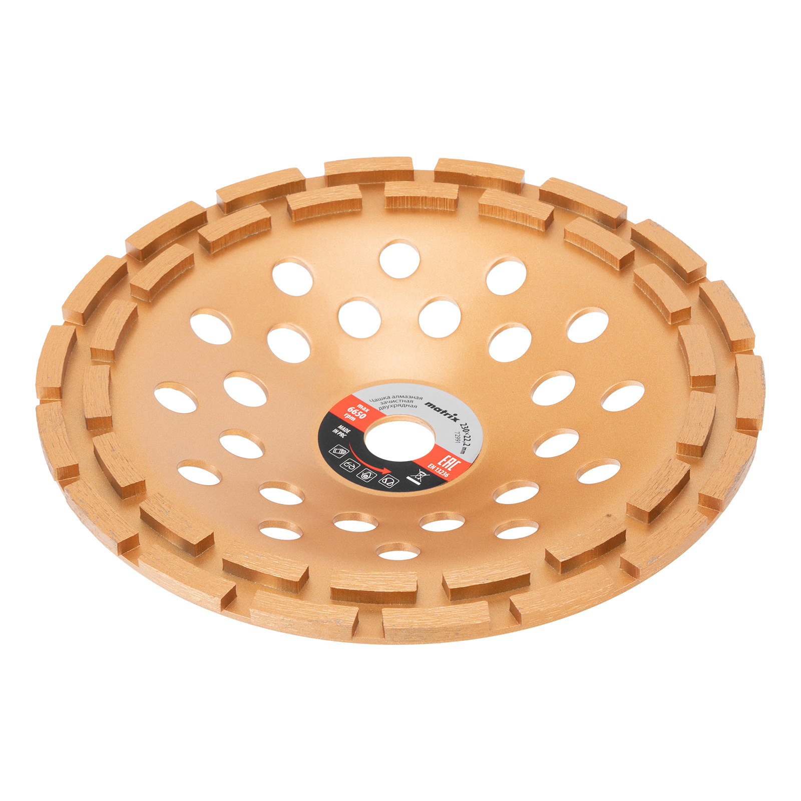 Двухрядная алмазная зачистная чашка Matrix 72991 диаметром 230 мм, с посадочным отверстием 22,2 мм, — оснастка для углошлифовальных машин, предназначенная для грубой обработки бетонных, каменных, кирпичных, мраморных и гранитных поверхностей. Позволяет проводить зачистку швов, стыков, неровностей, удаление наплывов. Придает поверхности шероховатость для улучшения ее адгезивной способности перед нанесением строительных растворов. Чашка предназначена для профессионального применения.