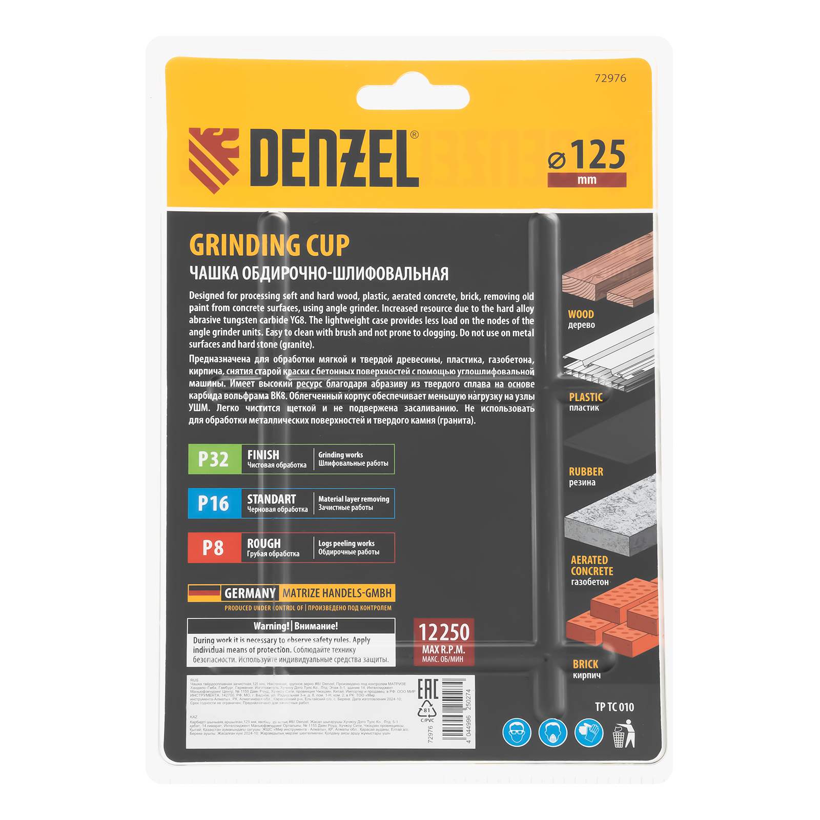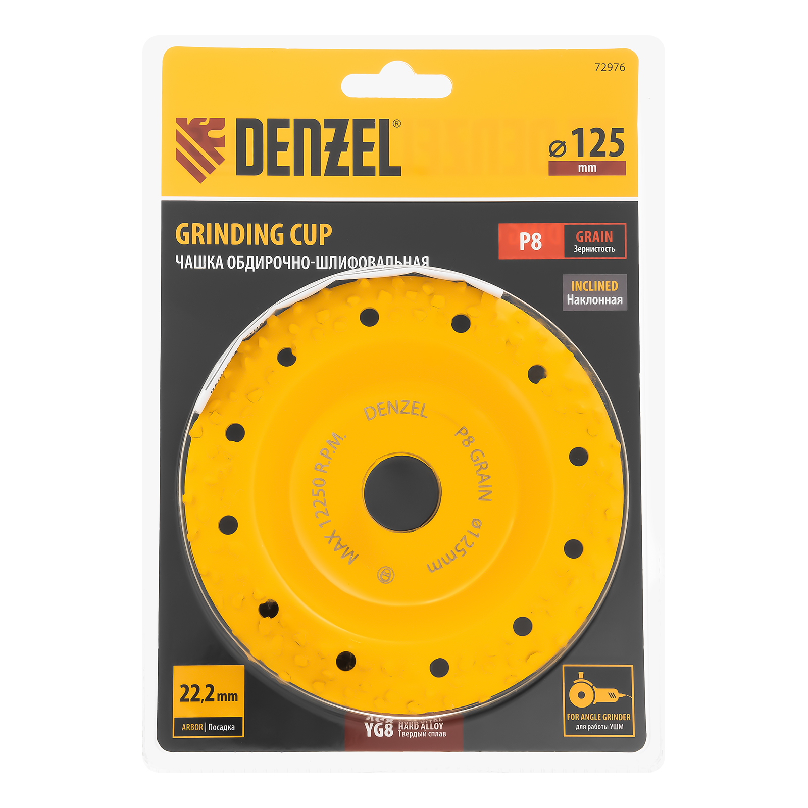 Твердосплавная зачистная чашка Denzel 72976 диаметром 125 мм, с крупным зерном P8 и наклонной рабочей частью, устанавливается на углошлифовальную машину (УШМ) и используется для грубой обработки деревянных, пластиковых, резиновых, газобетонных и кирпичных поверхностей. Позволяет устранить неровности, снять слой старой краски, клея, цемента. В ходе обдирочных работ не образуется абразивная пыль, что снижает вредное воздействие на здоровье пользователя. Наклонная рабочая часть упрощает обработку деталей сложной формы. Облегченный корпус позволяет избежать излишней нагрузки на УШМ и преждевременного выхода инструмента из строя.