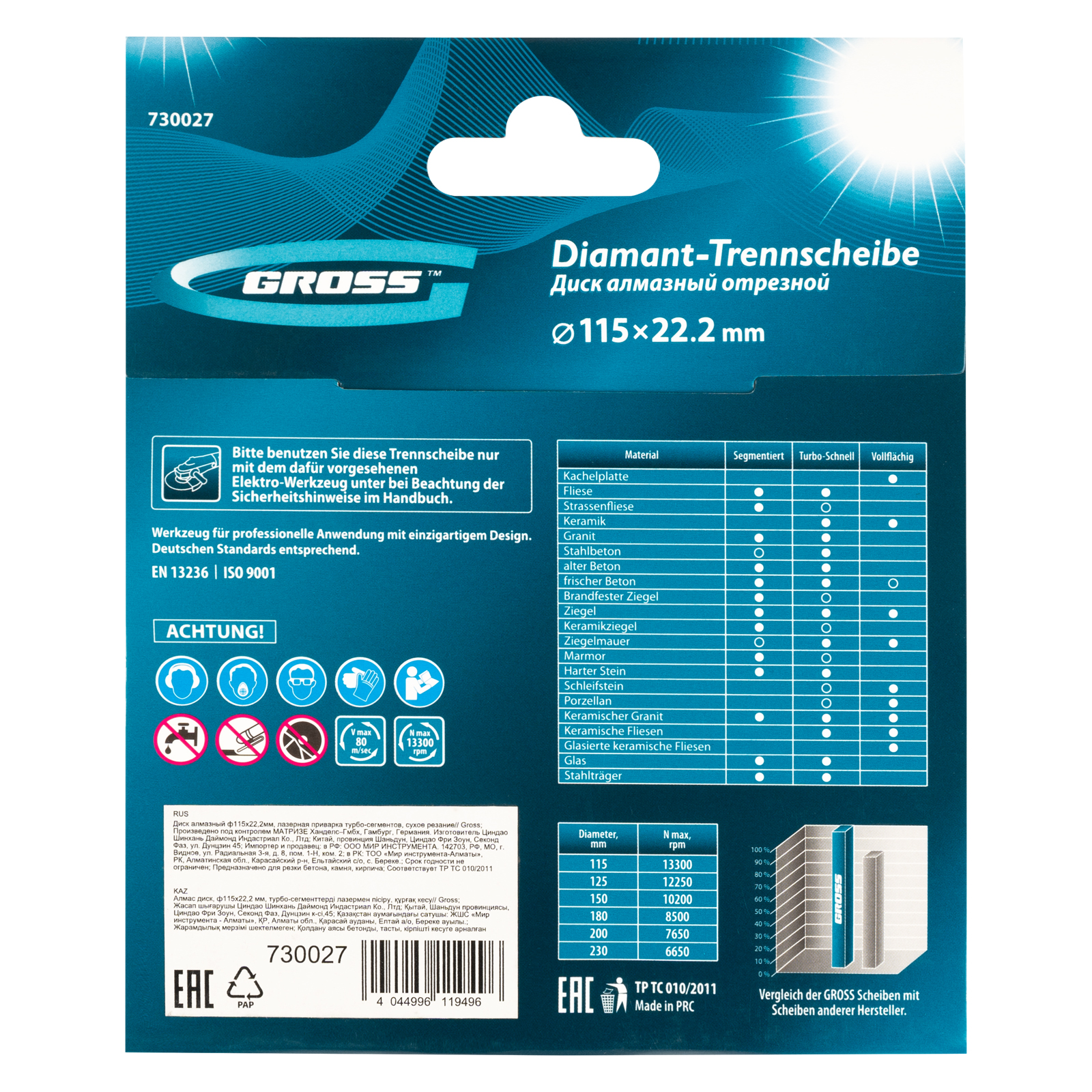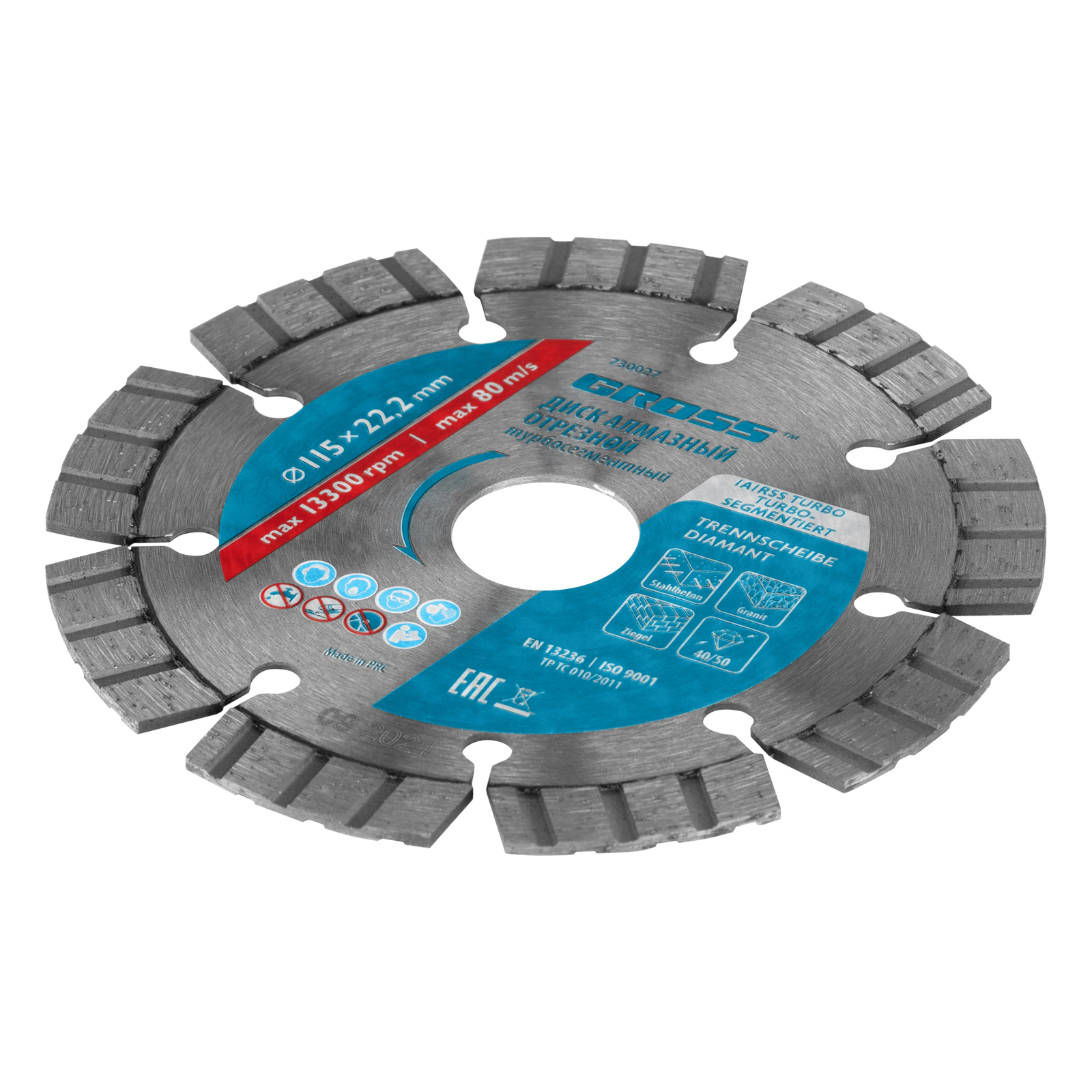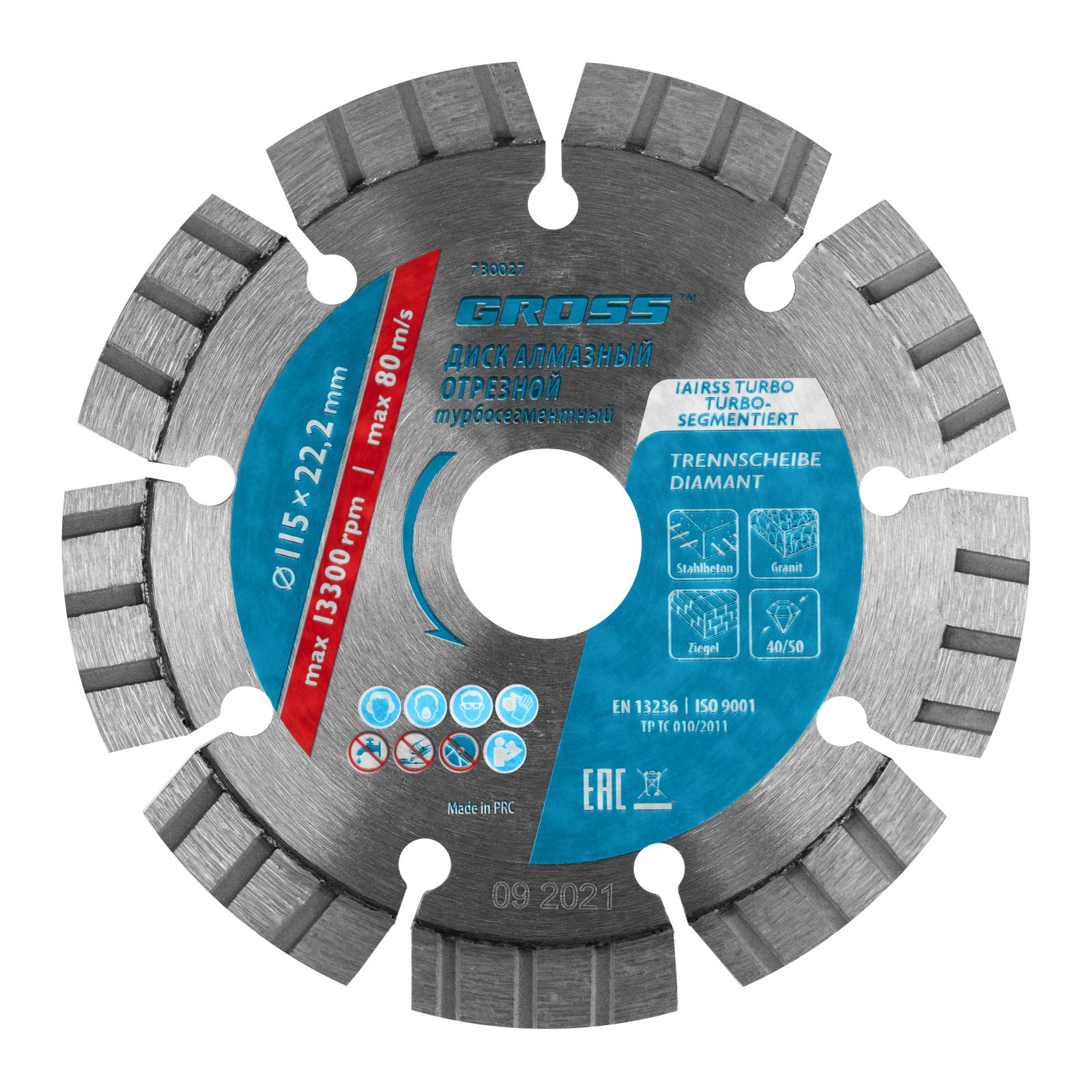Алмазный диск Gross 730027 диаметром 115 х 22,2 мм, с лазерной приваркой турбо-сегментов, предназначен для сухой резки бетона, в том числе свежего, слабоармированного железобетона, кирпича, песчаника и гранита. Посадочный диаметр 22,2 мм позволяет использовать диск в качестве оснастки для УШМ. Турбо-сегментное строение обеспечивает быстрое сухое резание без необходимости водяного охлаждения. Благодаря оптимально подобранной связке диск выдерживает высокие нагрузки при выполнении большого объема работ. Подходит как для интенсивного бытового, так и для профессионального применения.