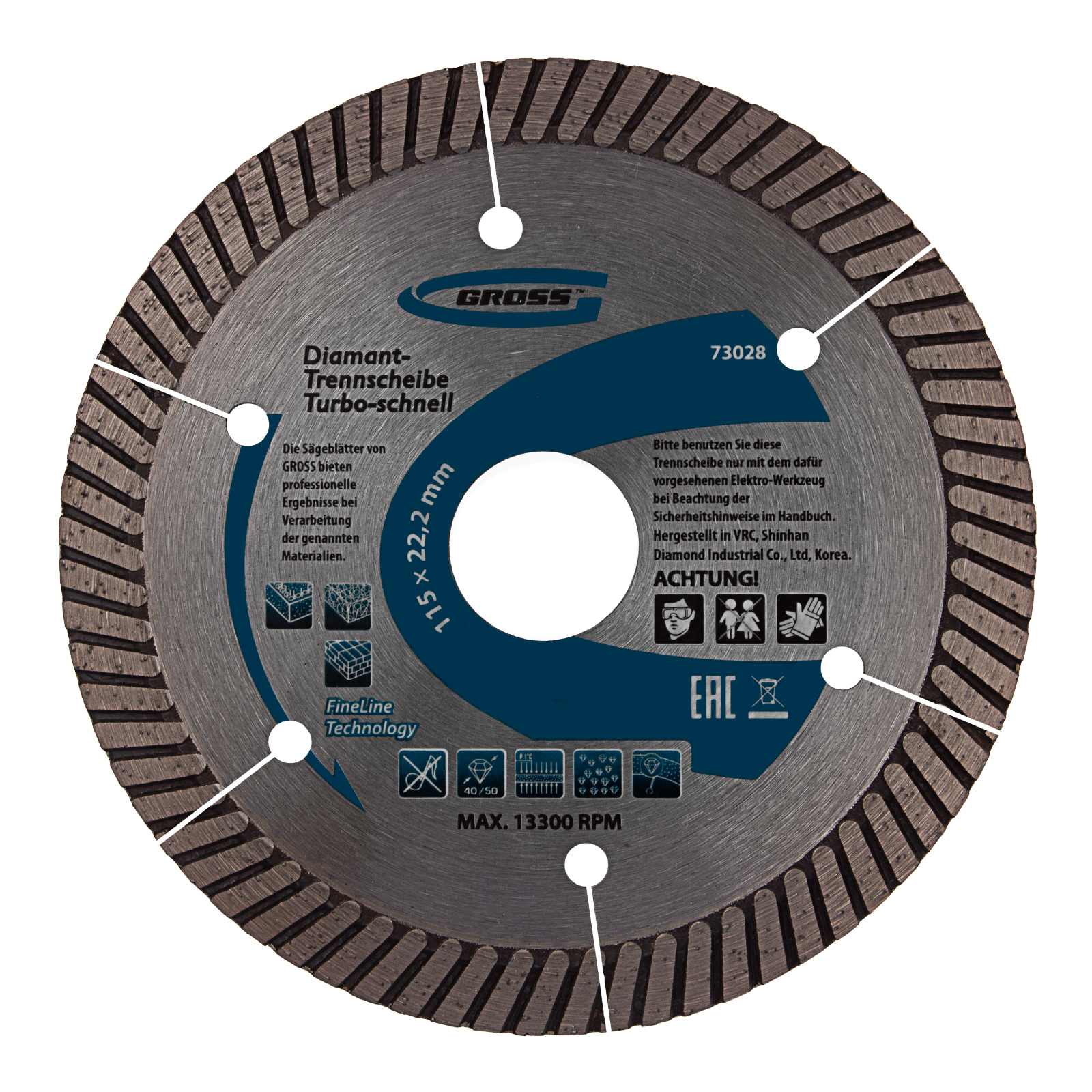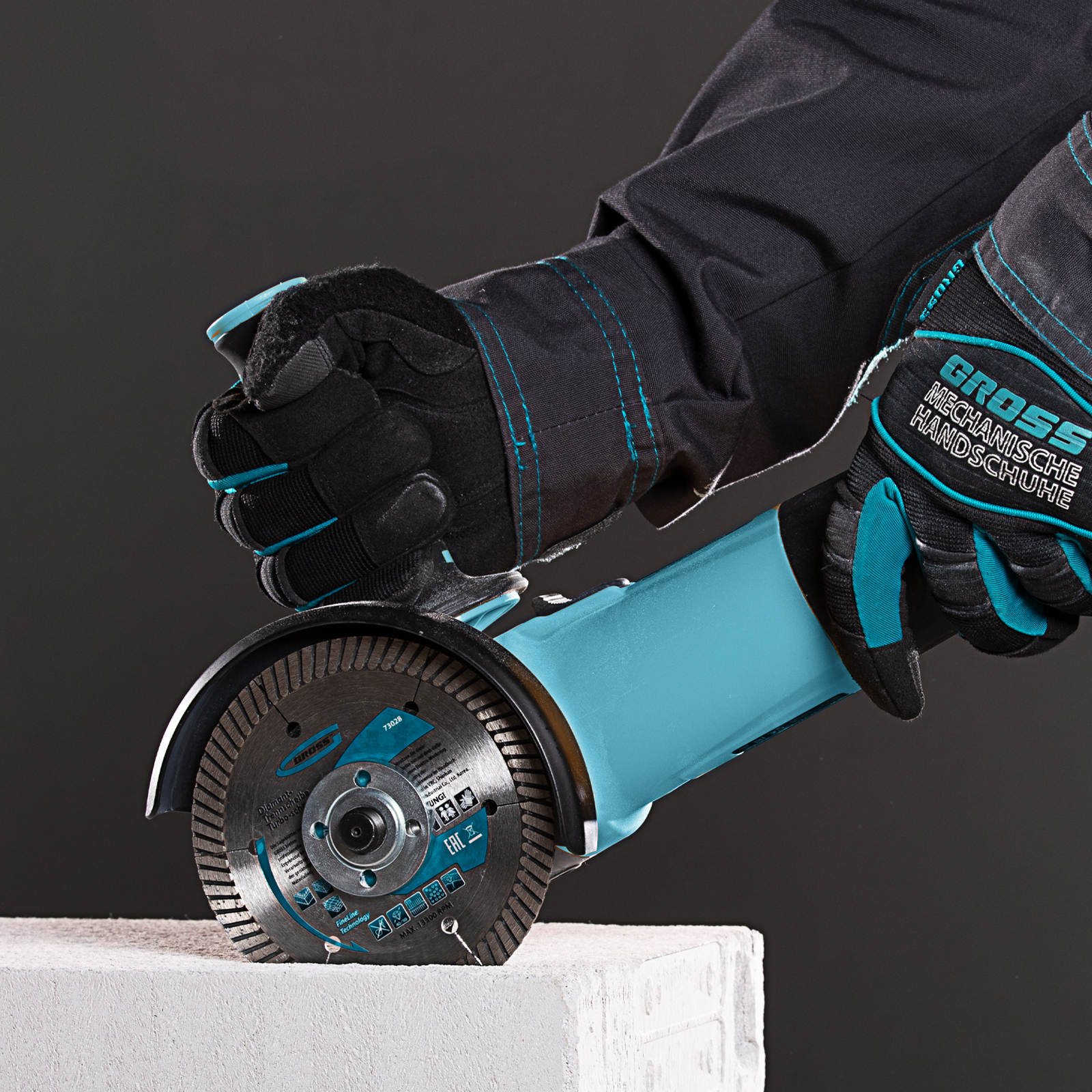 Алмазный диск Gross ф115 х 22,2 мм 73028 турбо с лазерной перфорацией применяется для сухого резания твердых материалов: бетона, в том числе свежего, железобетона, кирпича, гранита, камня и песчаника. Возможность работы с разными типами материалов обусловлена оптимально подобранной металлической связкой. Инструмент используется в качестве расходника на профессиональных УШМ. Лазерная перфорация обеспечивает усиленное охлаждение диска, поэтому он оптимален для интенсивной эксплуатации.