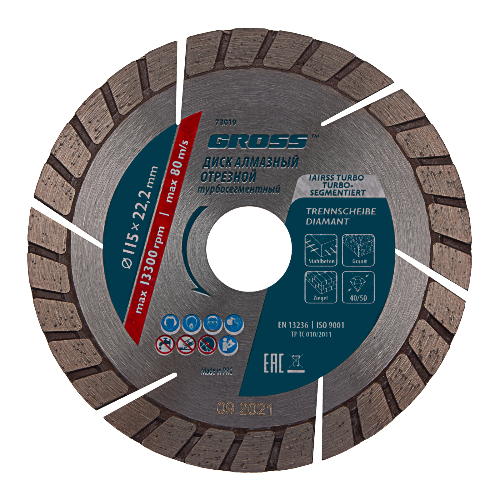 Алмазный турбо-сегментный диск Gross 73019 диаметром 115 х 22,2 мм, для сухой резки, — оснастка для УШМ со скоростью вращения до 13300 об/мин, предназначенная для отрезных работ. Универсальный диск с турбированной рабочей частью можно использовать для резки камня, гранита и кирпича, свежего бетона, а также слабоармированного железобетона. Он подходит для профессионального использования.