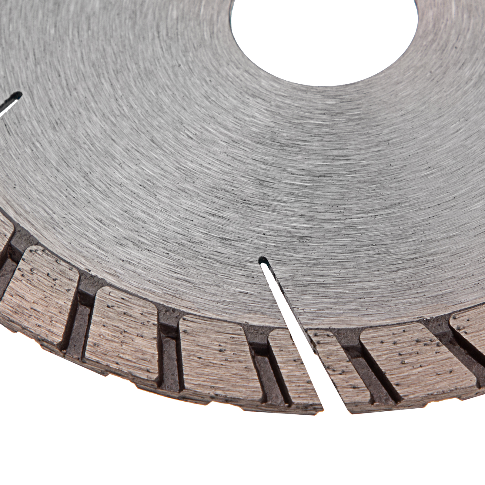 - Эффективная работа — благодаря турбо-сегментной форме диск быстро режет материалы, в т.ч. армированный бетон, водяное охлаждение не требуется.