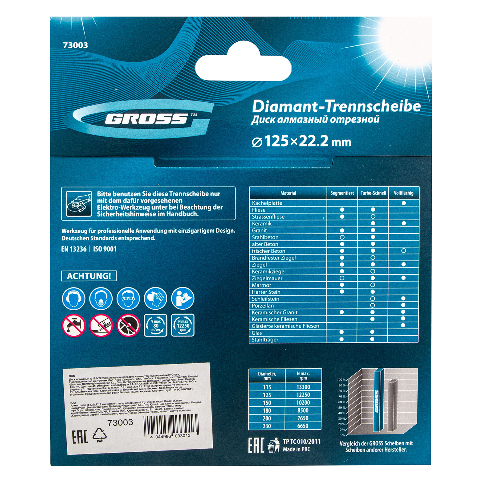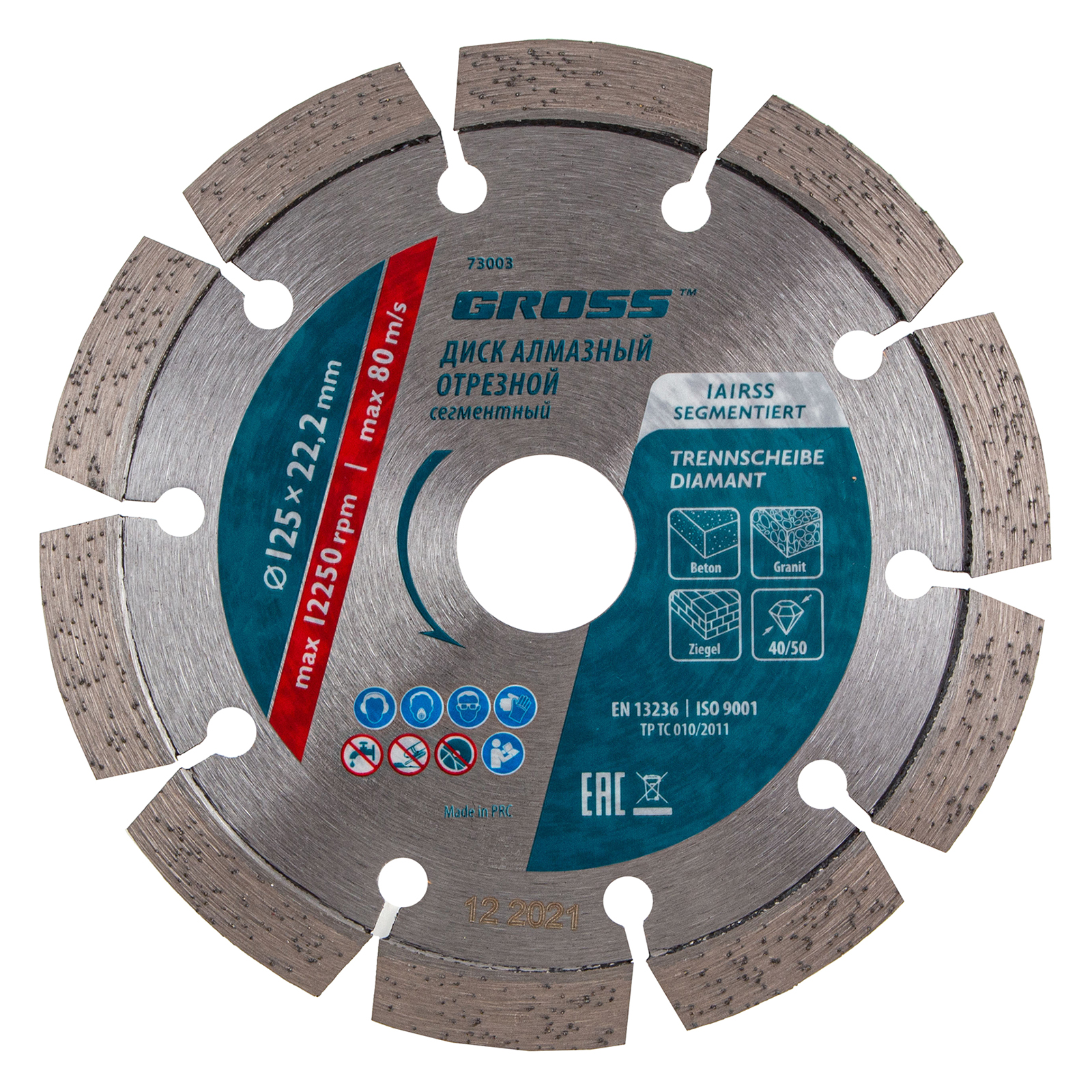 Алмазный диск Gross 73003 диаметром 125 х 22,2 мм, с лазерной приваркой сегментов, предназначен для сухой резки бетона, в том числе свежего, кирпича, песчаника и гранита. Посадочный диаметр 22,2 мм позволяет использовать диск в качестве оснастки для УШМ. Сегментное строение снижает риск деформации и обеспечивает быстрое сухое резание без необходимости водяного охлаждения. Благодаря оптимально подобранной связке диск выдерживает высокие нагрузки при выполнении большого объема работ. Подходит как для интенсивного бытового, так и для профессионального применения.
