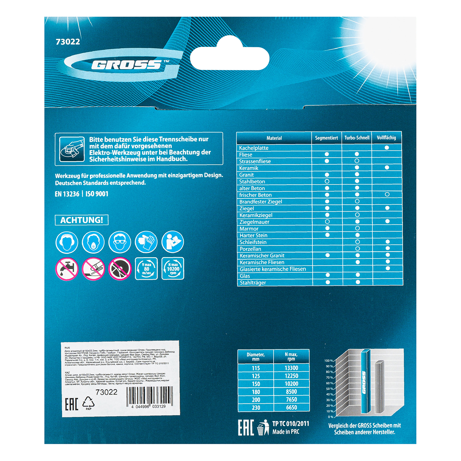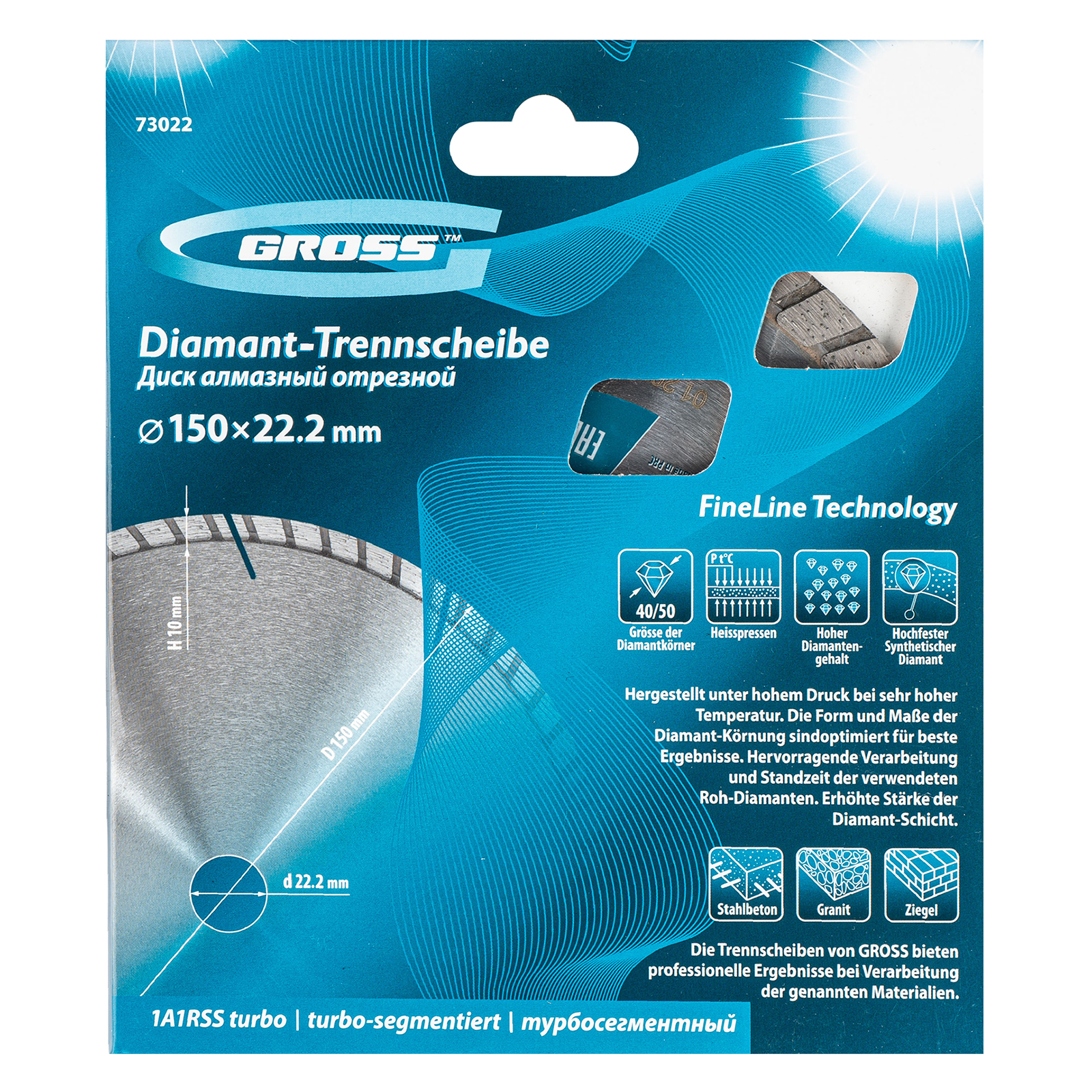 Алмазный турбо-сегментный диск Gross 73022 диаметром 150 х 22,2 мм, для сухой резки, — оснастка для УШМ со скоростью вращения до 10200 об/мин, предназначенная для отрезных работ. Универсальный диск с турбированной рабочей частью можно использовать для резки камня, гранита и кирпича, свежего бетона, а также слабоармированного железобетона. Он подходит для профессионального использования.