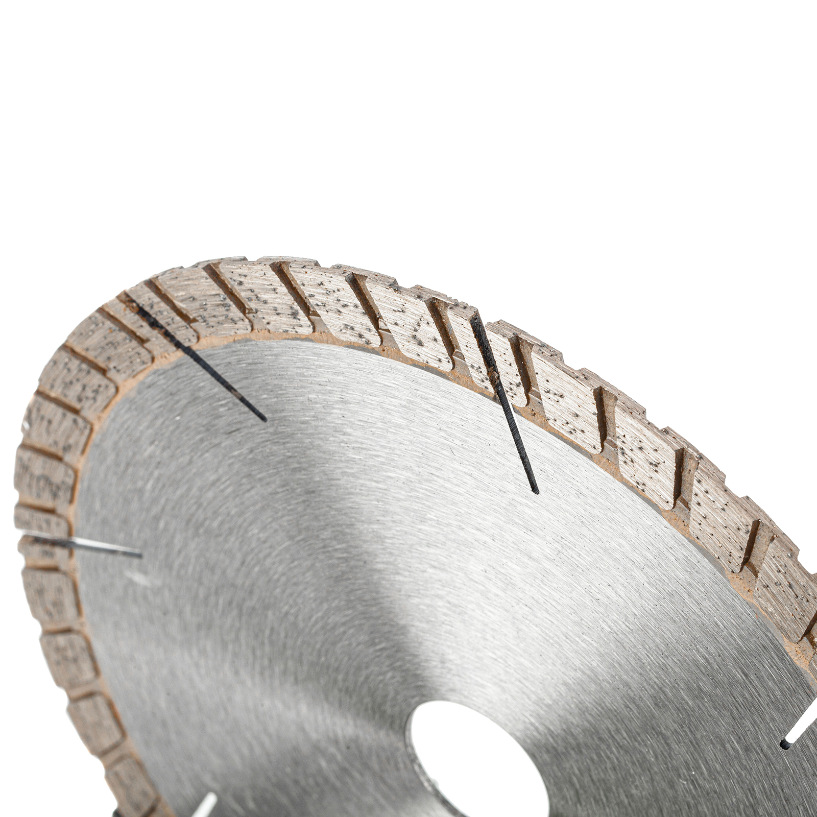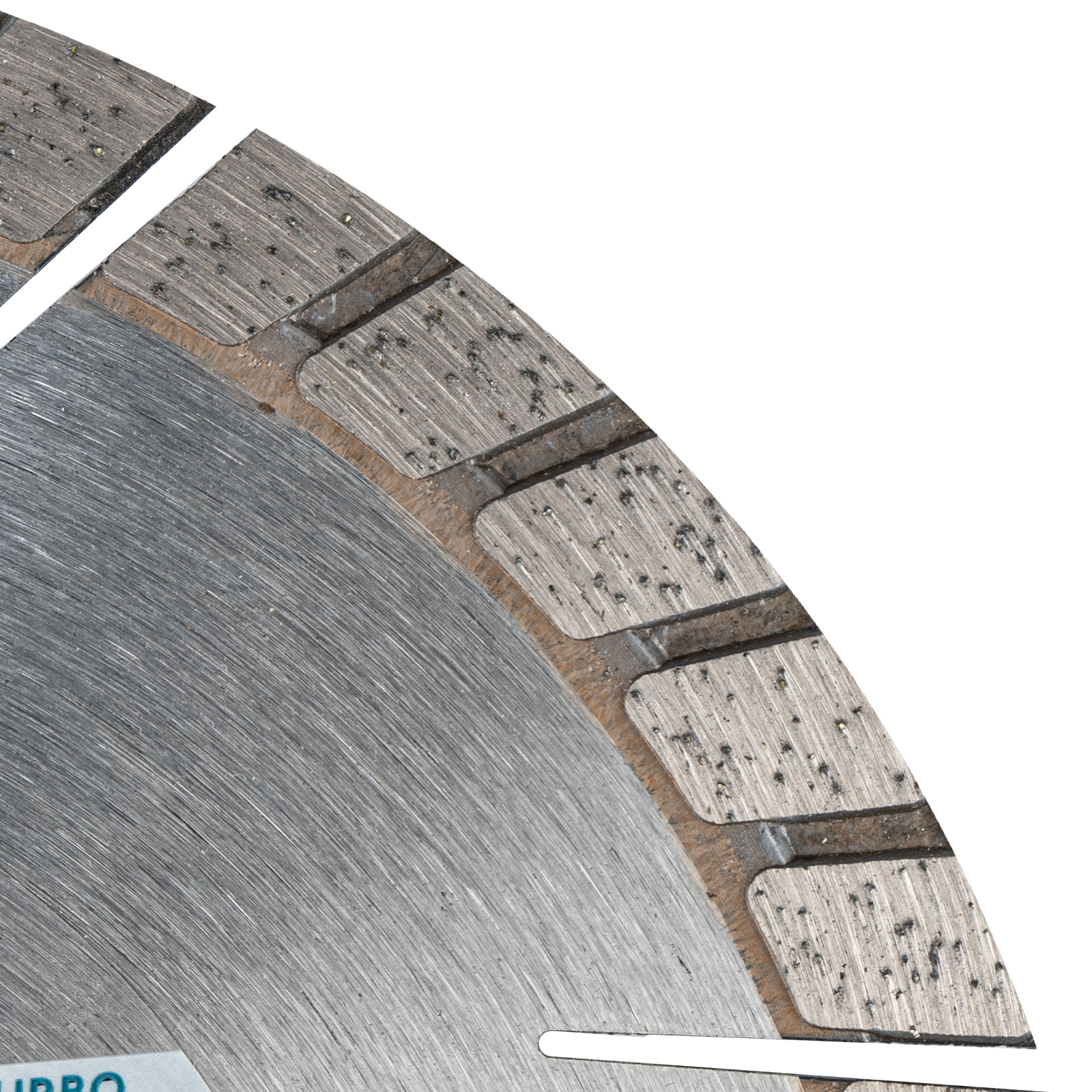 - Эффективная работа — благодаря турбо-сегментной форме диск быстро режет материалы, в т.ч. армированный бетон, водяное охлаждение не требуется.
