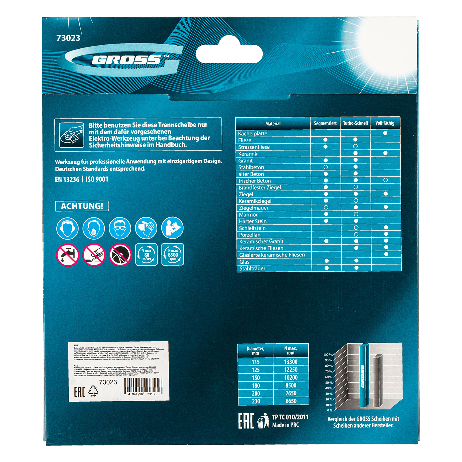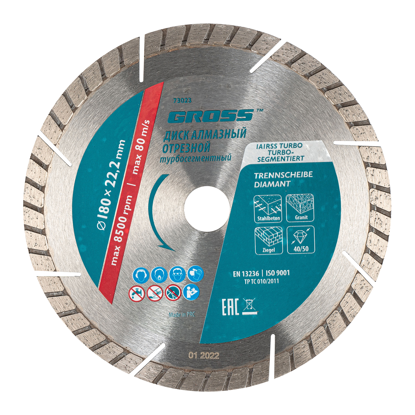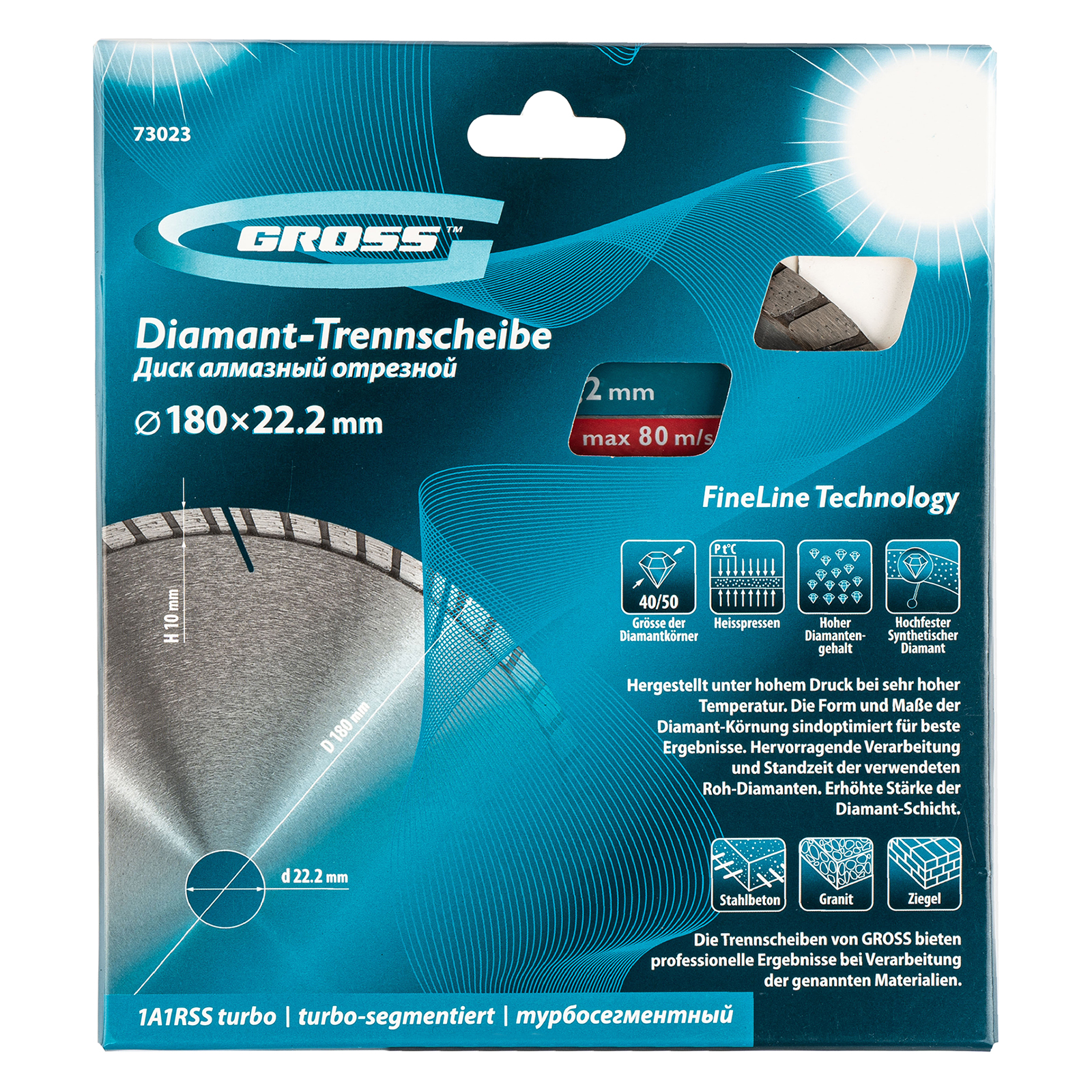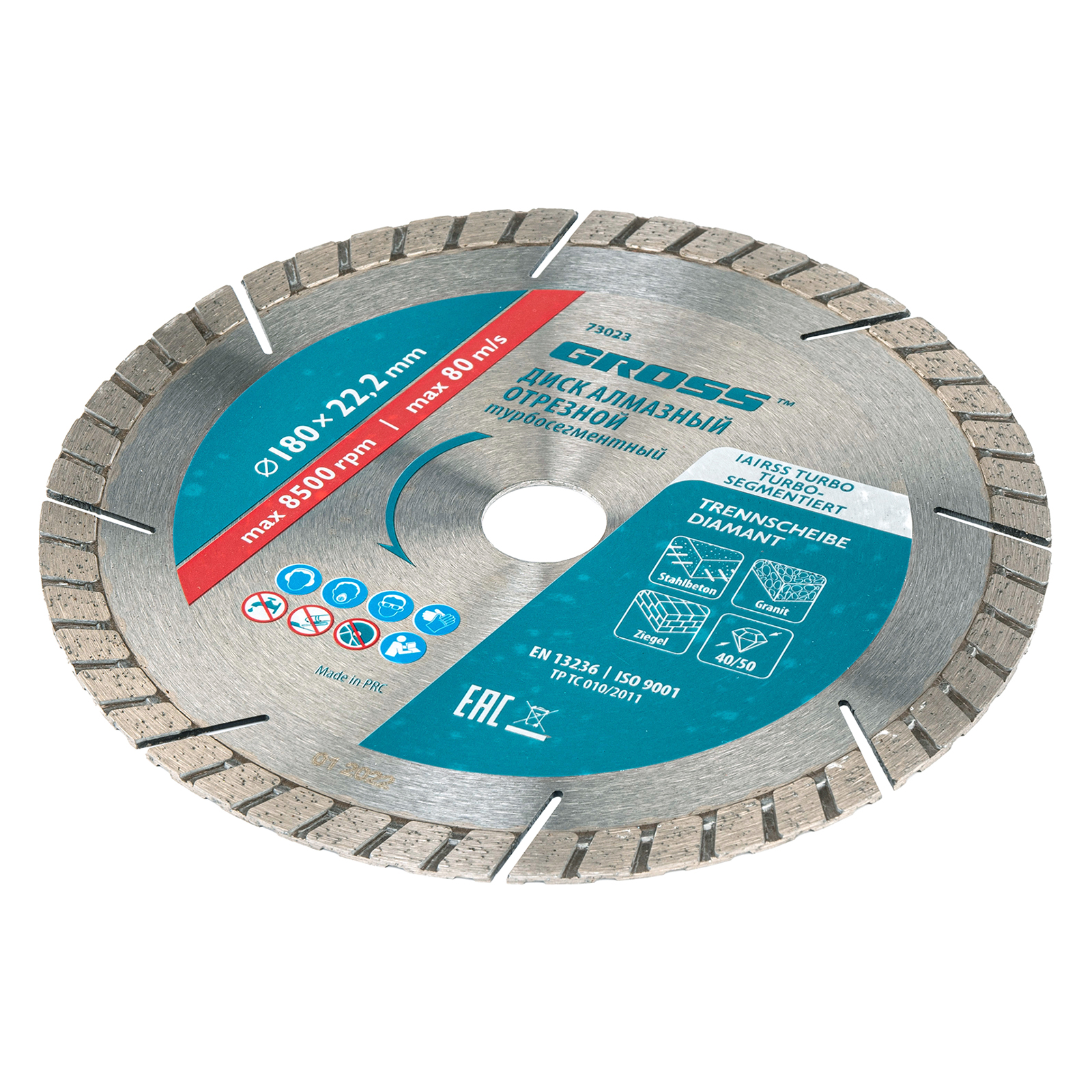 Алмазный турбо-сегментный диск Gross 73023 диаметром 180 х 22,2 мм, для сухой резки, — оснастка для УШМ со скоростью вращения до 8500 об/мин, предназначенная для отрезных работ. Универсальный диск с турбированной рабочей частью можно использовать для резки камня, гранита и кирпича, свежего бетона, а также слабоармированного железобетона. Он подходит для профессионального использования.
