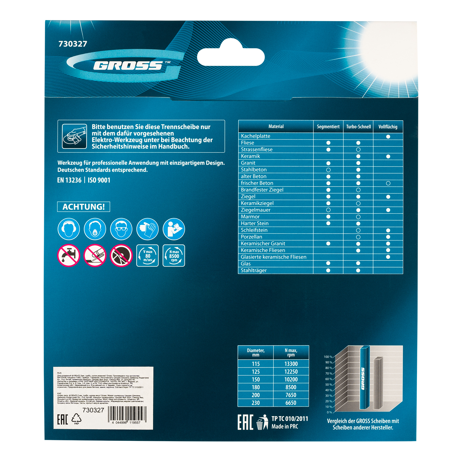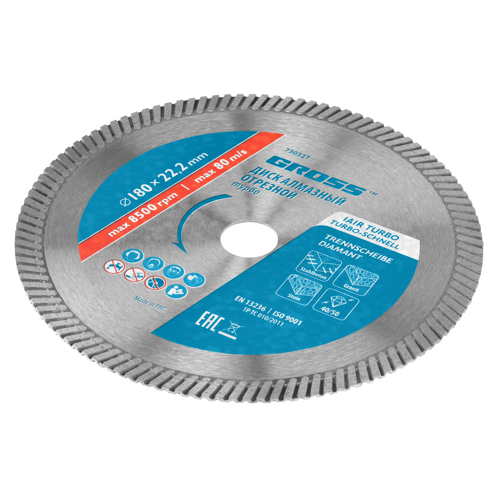 Алмазный диск Gross 730327 диаметром 180 х 22,2 мм, с рабочей частью «турбо», применяется для сухой резки твердых материалов: бетона, в том числе свежего, среднеармированного железобетона, кирпича, гранита, камня и песчаника. Работа с разными типами материалов возможна благодаря оптимально подобранной металлической связке. Инструмент используется в качестве расходника на профессиональных УШМ.