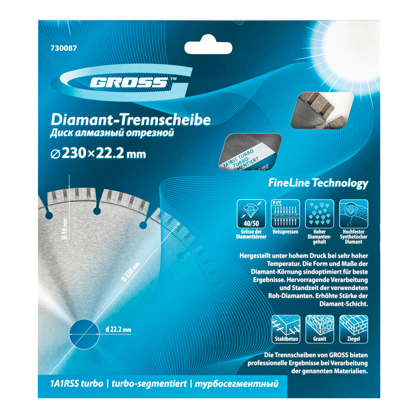 Алмазный диск Gross 730087 диаметром 230 х 22,2 мм с лазерной приваркой турбо-сегментов предназначен для сухого резания бетона, в том числе свежего, слабоармированного железобетона, кирпича, песчаника и гранита. Посадочный диаметр 22,2 мм позволяет использовать диск в качестве оснастки для УШМ. Турбо-сегментное строение обеспечивает быстрое сухое резание без необходимости водяного охлаждения. Благодаря оптимально подобранной связке диск выдерживает высокие нагрузки при выполнении большого объема работ. Подходит как для интенсивного бытового, так и для профессионального применения.