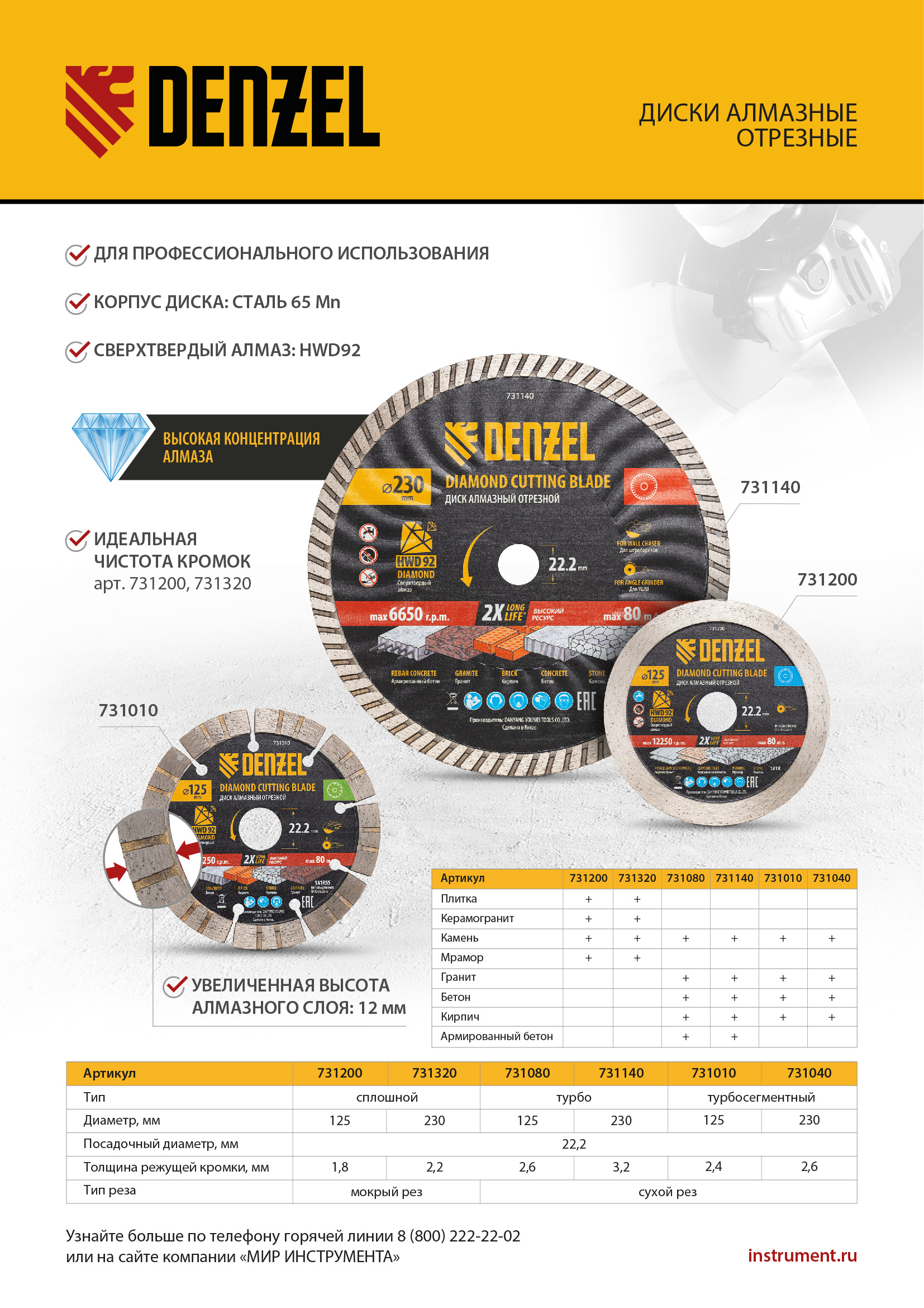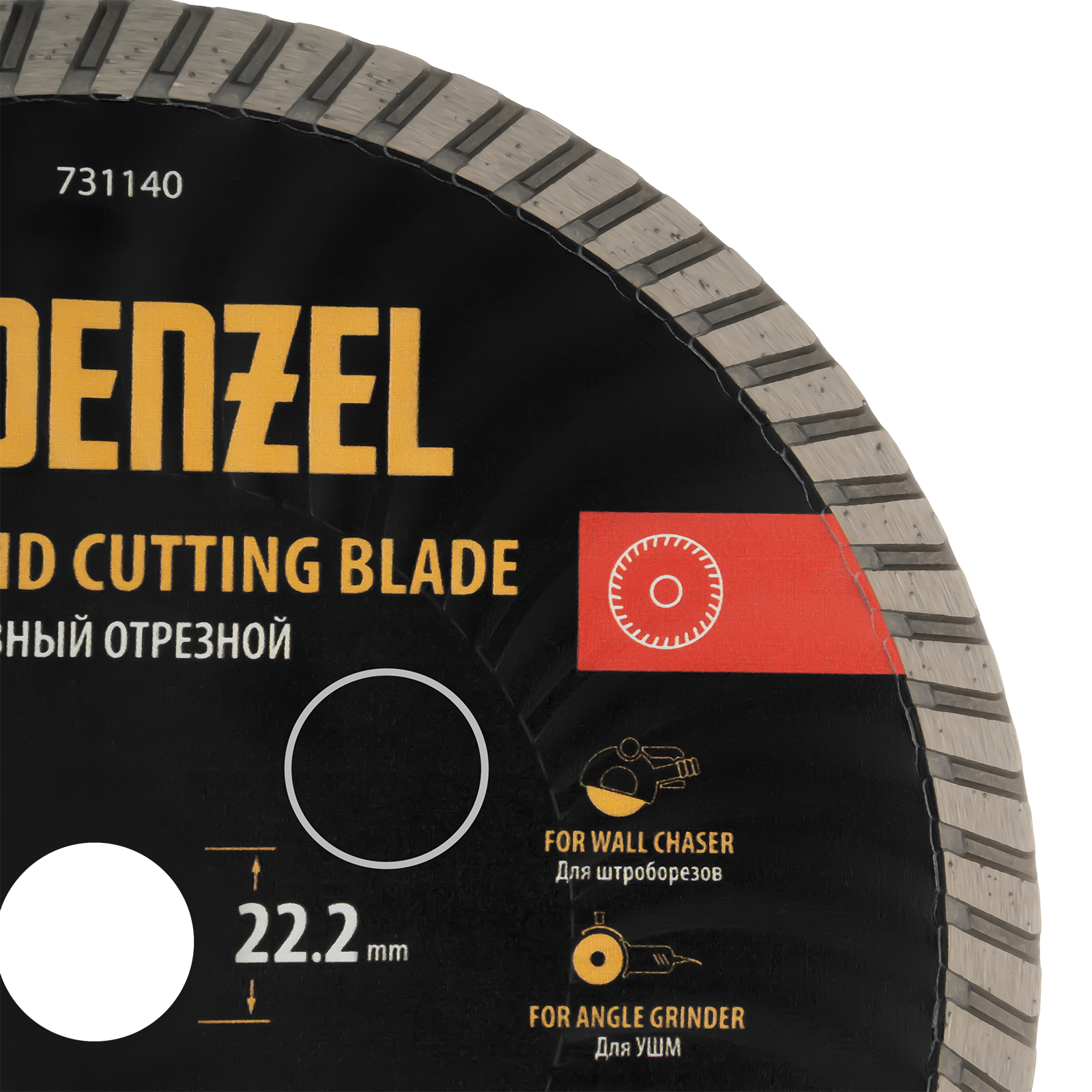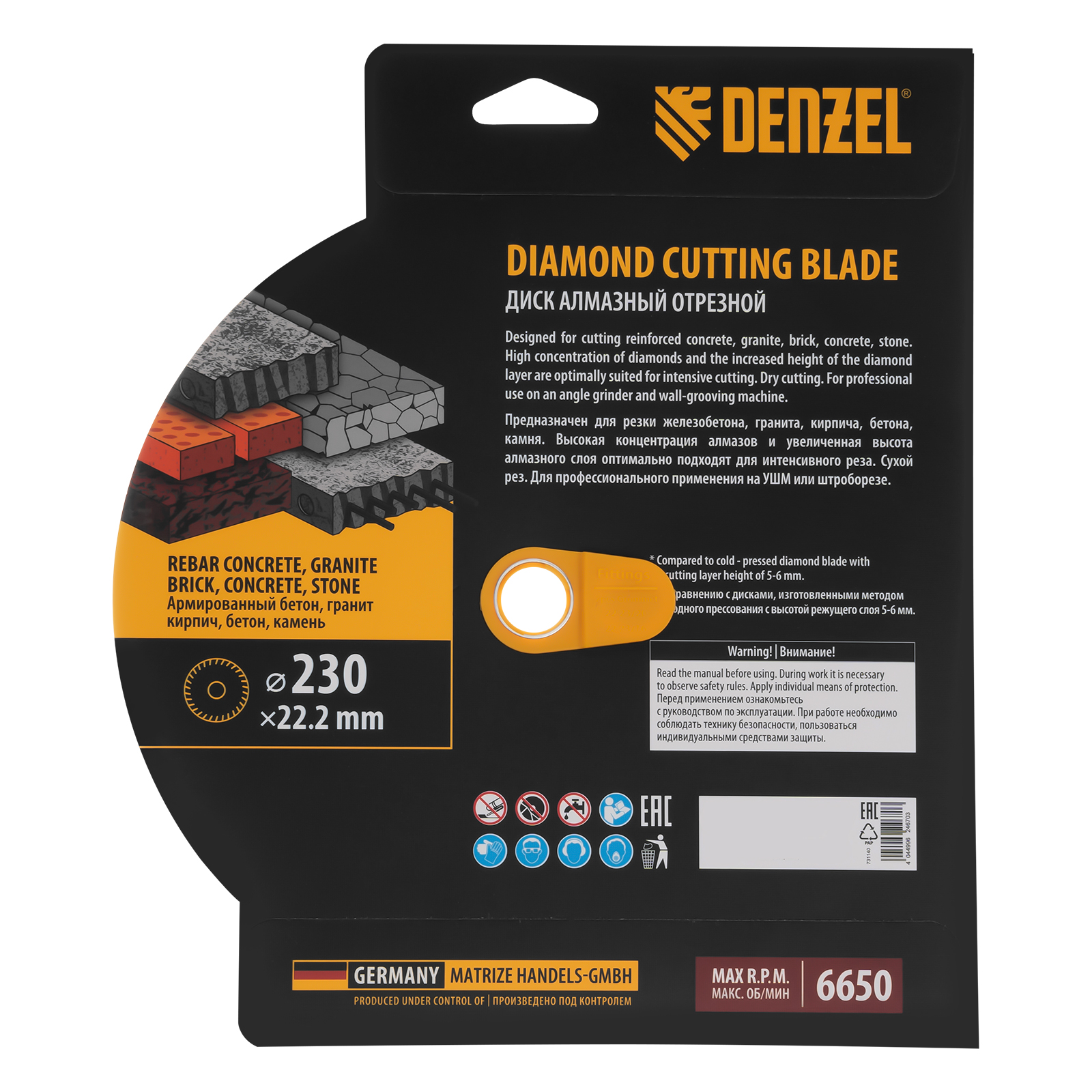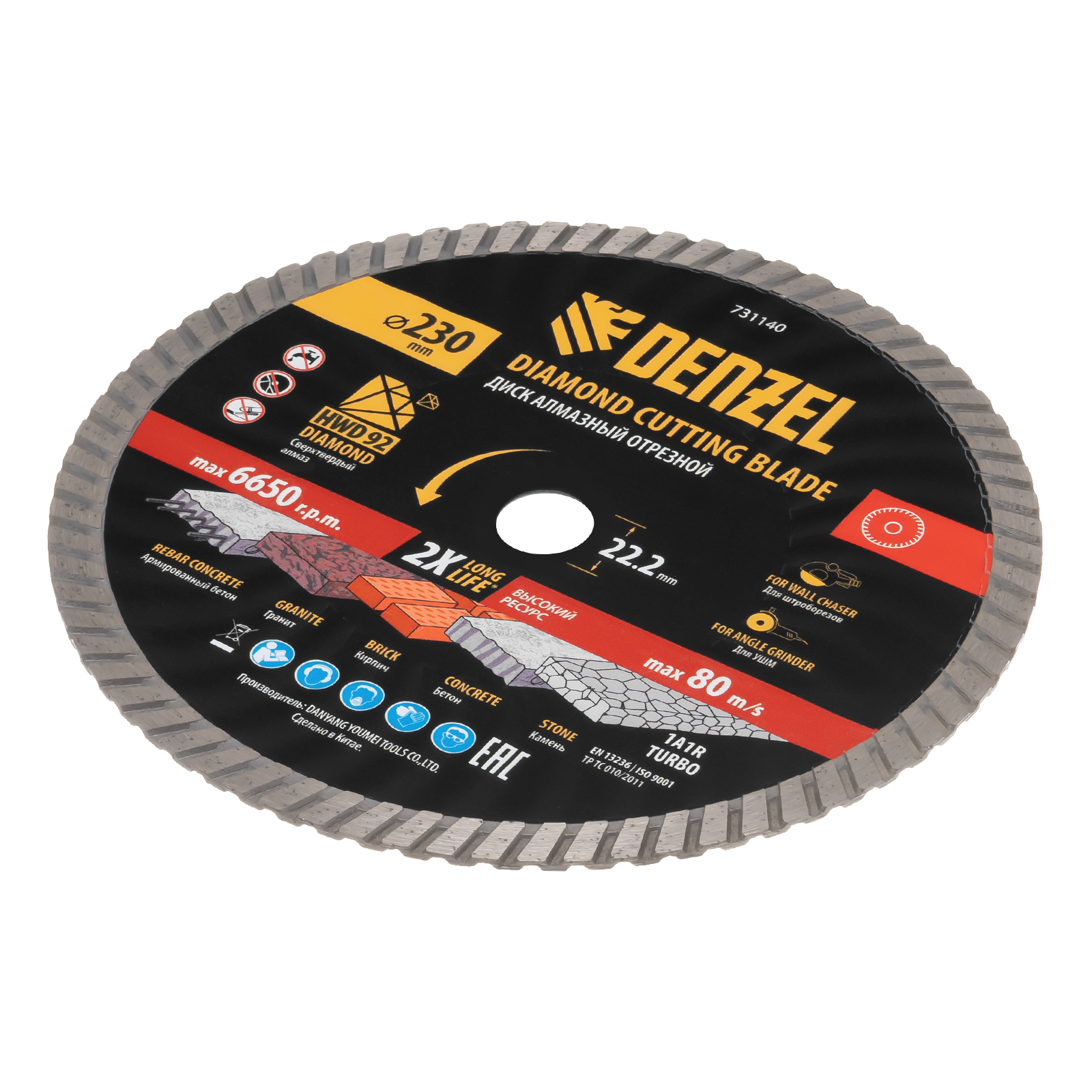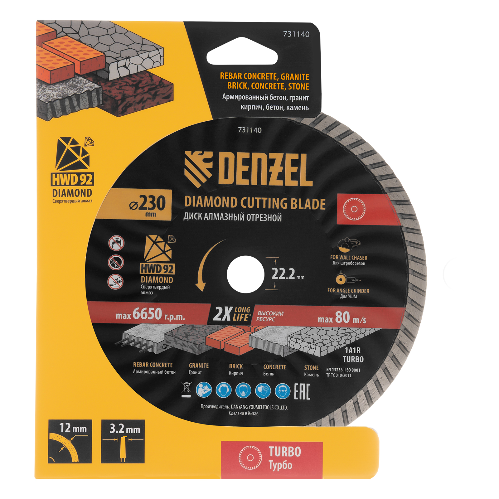 Алмазный отрезной диск Турбо Denzel HWD92 731140 диаметром 230 мм, с посадочным размером 22,2 мм и слоем сверхтвердых алмазов HWD92, устанавливается на углошлифовальную машину (УШМ) или штроборез. Используется для сухого резания камня, бетона (в том числе армированного), гранита, кирпича. Рекомендуемая частота вращения — 6650 об/мин.