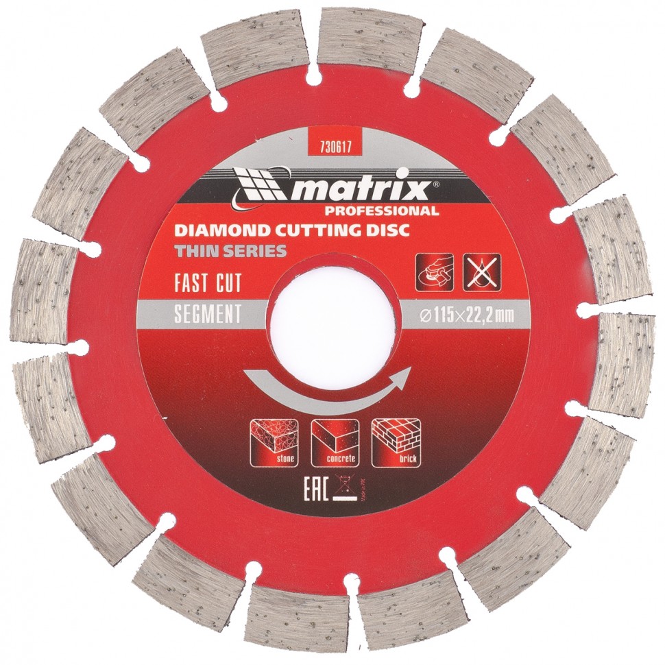 Отрезной сегментный алмазный диск Matrix Professional 730617 диаметром 115 х 22,2 мм, с тонким корпусом, позволяет проводить сухую резку свежего и старого бетона, камня, гранита, шлакоблока, тротуарной плитки, песчаника и кирпича с помощью УШМ. Подходит для частного и профессионального использования. Благодаря тонкому корпусу диска нагрузка на инструмент снижена, что позволяет ускорить рабочий процесс на 20%.