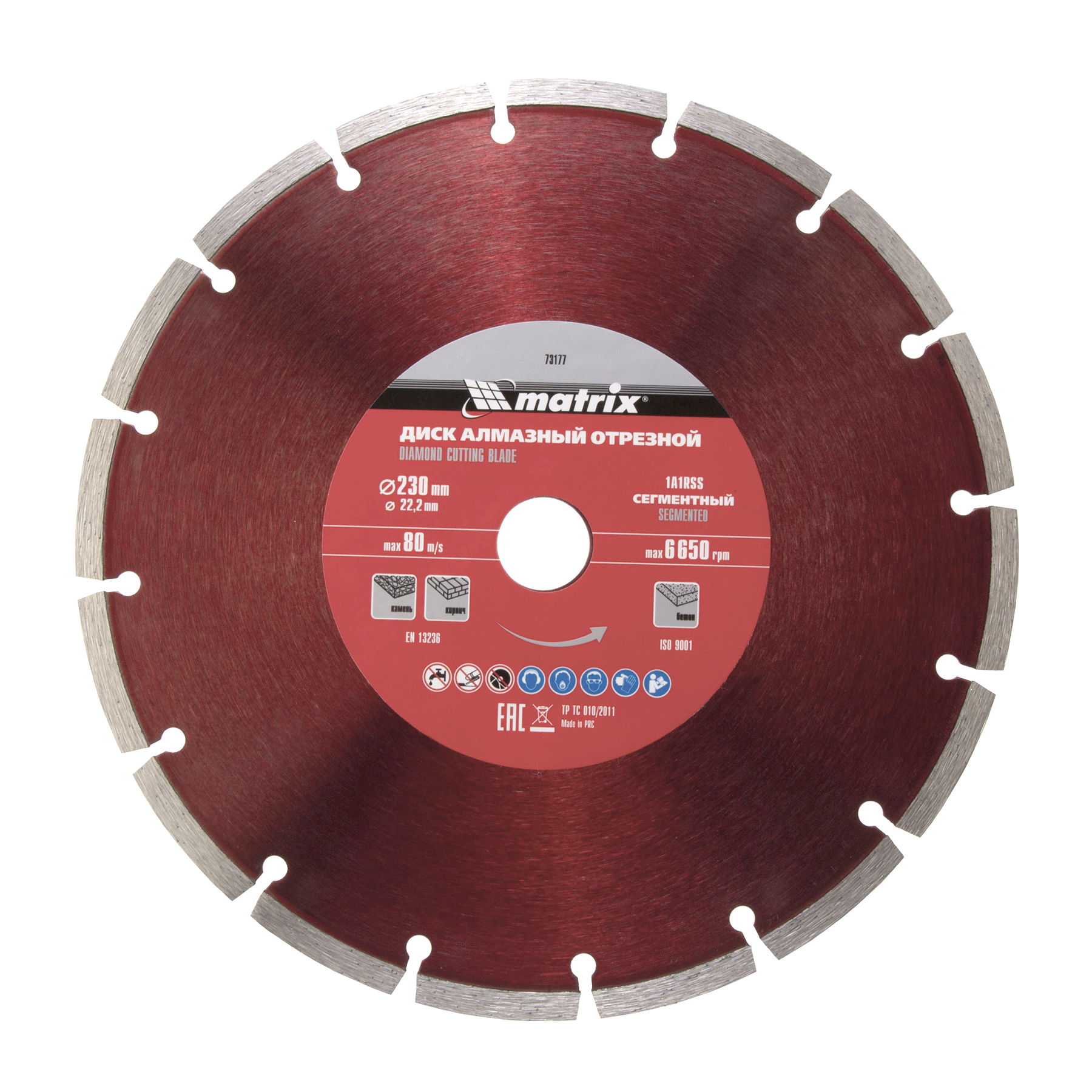 Алмазный отрезной сегментный диск Matrix 73177 диаметром 230 х 22,2 мм предназначен для сухой резки натурального и искусственного камня, кирпича, свежего и твердого бетона. Применяется с углошлифовальными машинами соответствующего типоразмера. Благодаря высокой скорости реза диск позволяет выполнять работы большого объема. Он пригодится на небольших строительных площадках и будет идеальным помощником при решении бытовых задач.