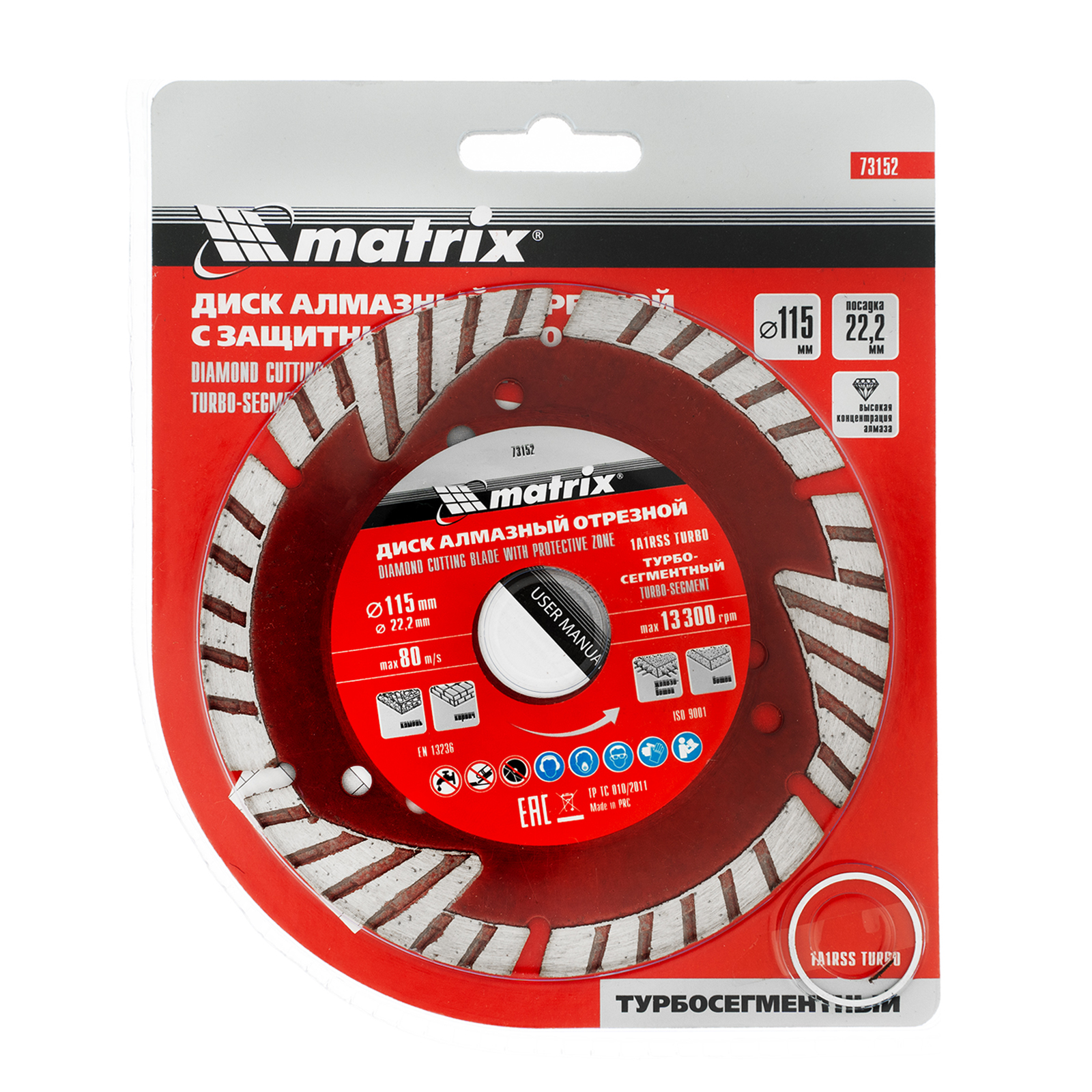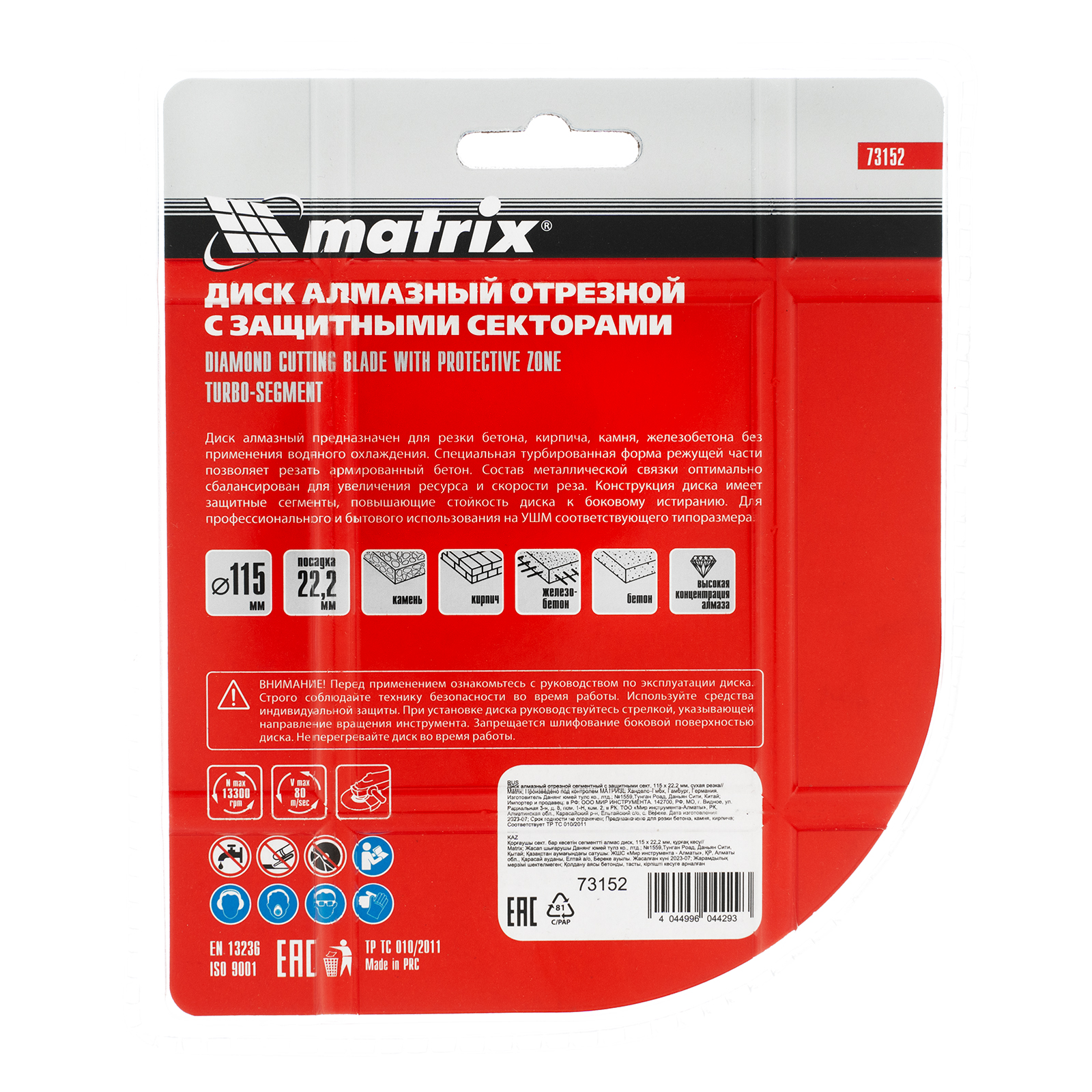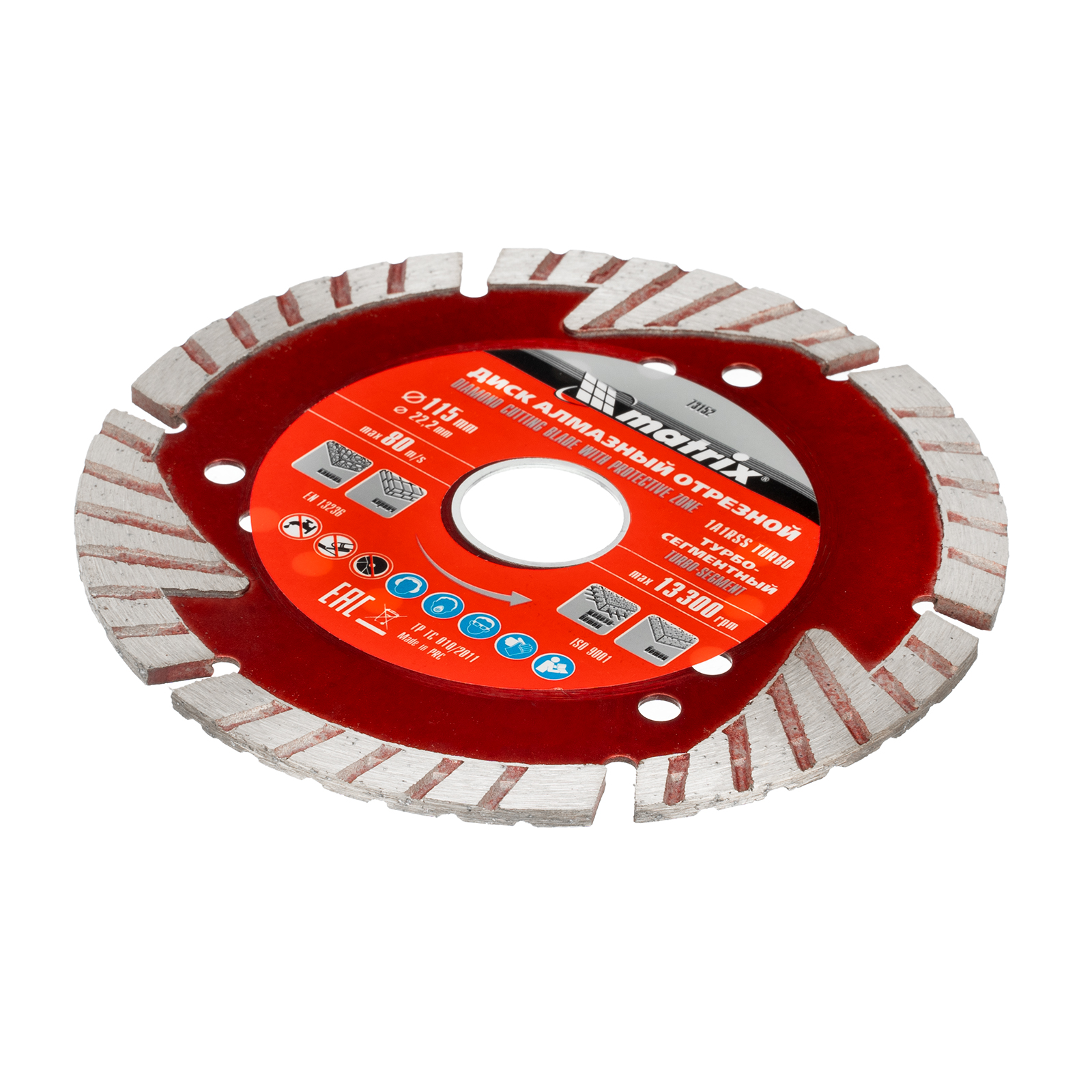 Алмазный отрезной сегментный диск Matrix 73152 с защитными секторами, диаметром 115 х 22,2 мм, применяется для сухой резки бетона разной прочности, камня, кирпича, шлакоблока и тротуарной плитки. Используется как оснастка для углошлифовальных машин с соответствующим посадочным диаметром. Диск изготовлен методом холодного прессования и выдерживает повышенные нагрузки при прохождении арматуры в слабоармированном железобетоне.