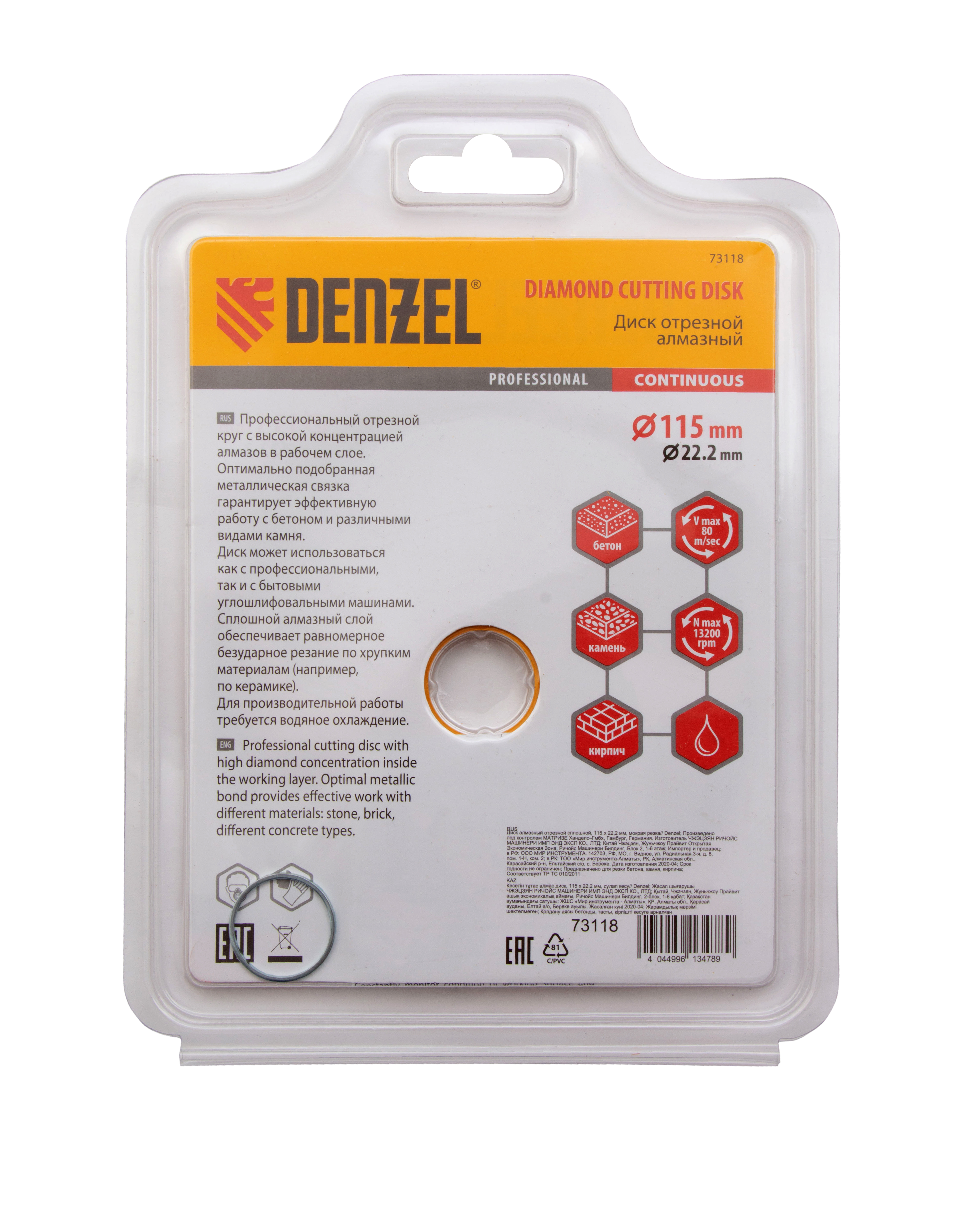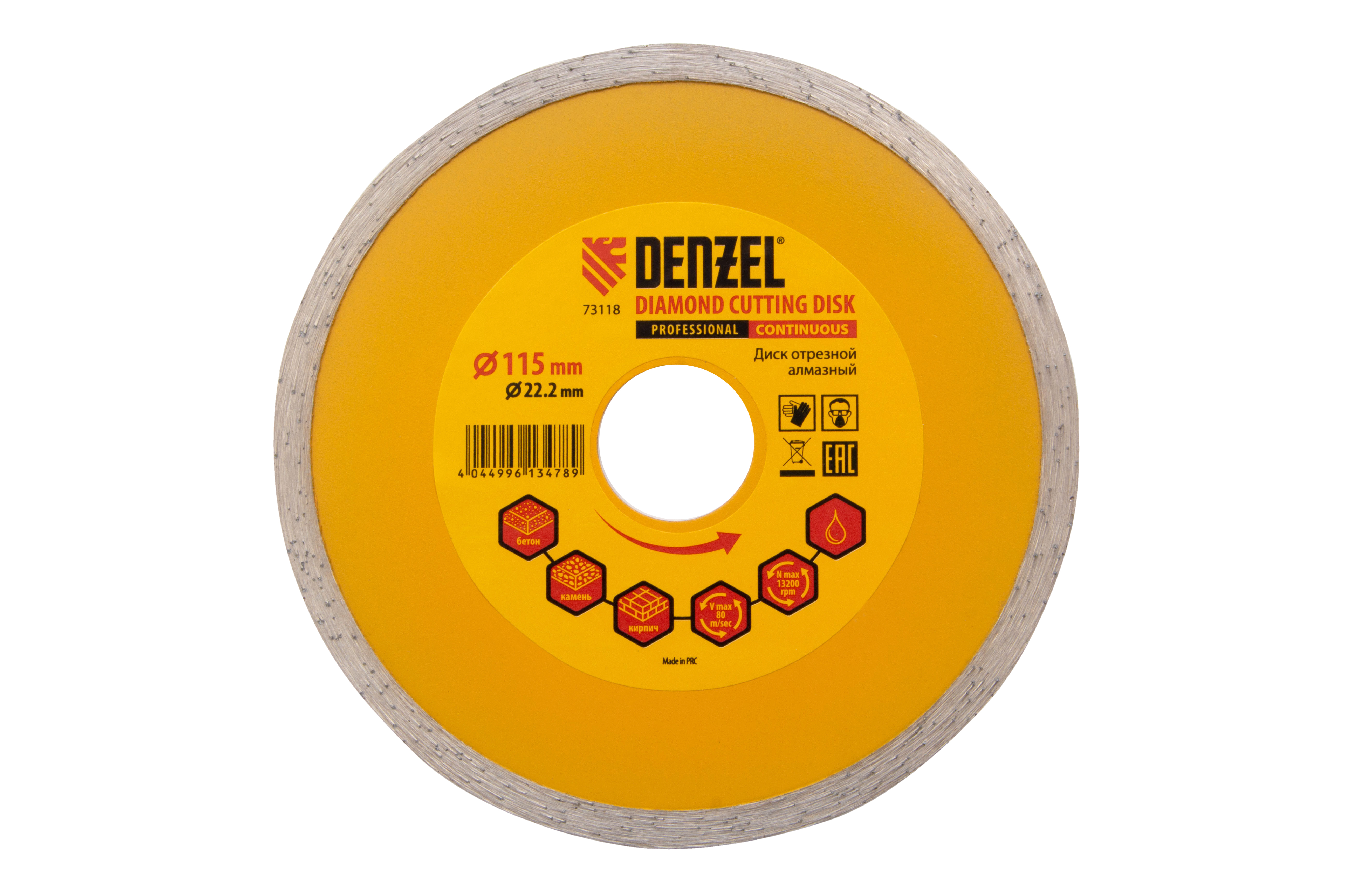 Отрезной алмазный диск Denzel «Сплошной» 73118 диаметром 115 х 22,2 мм используется для «мокрого» резания совместно с углошлифовальной машиной или плиткорезом с соответствующим посадочным диаметром. Режет камень, мрамор, керамогранитную и керамическую плитку. Диск отличается хорошей производительностью за счет высокой скорости реза, поэтому подходит для профессионального применения.