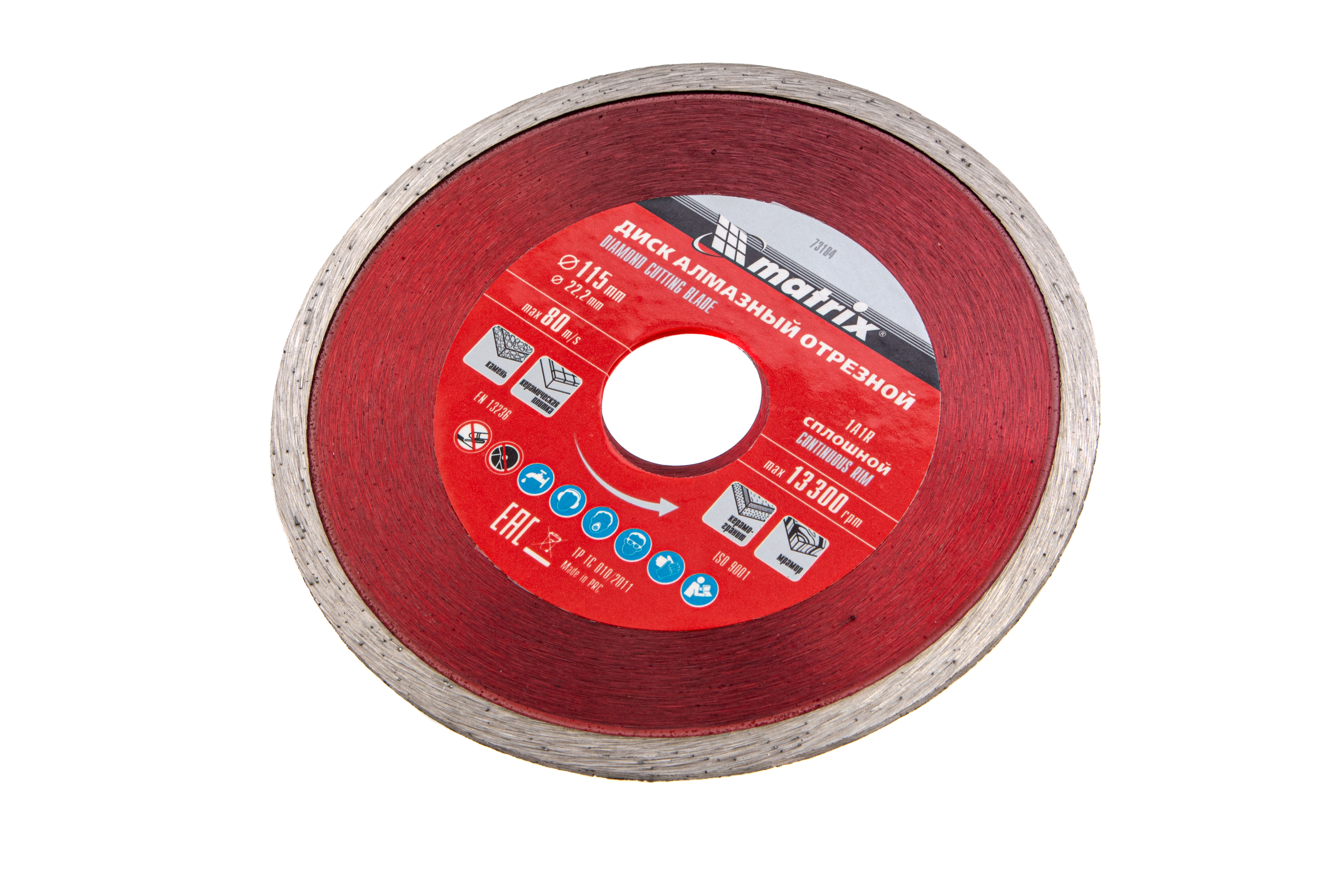 Отрезной алмазный сплошной диск Matrix 73184 диаметром 115 х 22,2 мм предназначен для мокрой резки мрамора, керамической плитки, керамогранита, натурального или искусственного камня. Устанавливается на углошлифовальную машину или плиткорез с посадочным диаметром 22,2 мм. Благодаря использованию водяного охлаждения улучшается качество реза, а также продлевается срок службы диска.