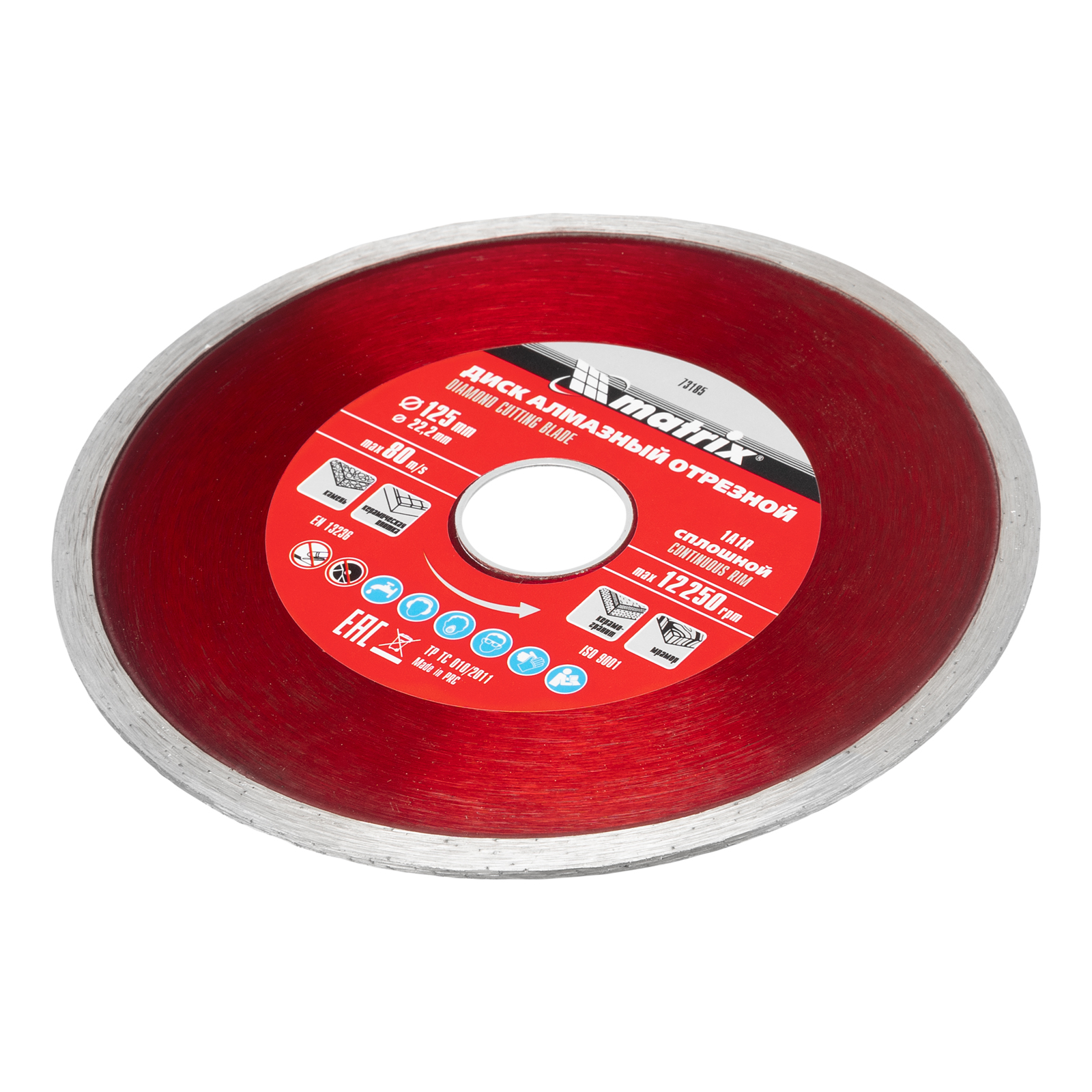 Отрезной алмазный сплошной диск Matrix 73185 диаметром 125 х 22,2 мм предназначен для мокрой резки мрамора, керамической плитки, керамогранита, натурального или искусственного камня. Устанавливается на углошлифовальную машину или плиткорез с посадочным диаметром 22,2 мм. Благодаря использованию водяного охлаждения улучшается качество реза, а также продлевается срок службы диска.