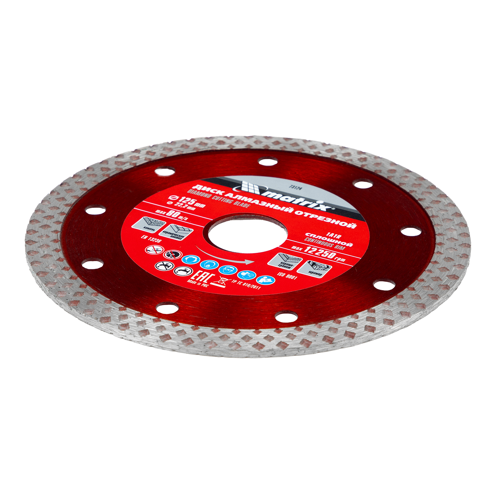 Сплошной отрезной алмазный диск Matrix 73124 диаметром 125 мм — оснастка для болгарок и плиткорезов с диаметром вала 22,2 мм. Применяется для сухого и мокрого резания мрамора, искусственного и натурального камня, керамогранитной и керамической плитки. Использование без подачи воды расширяет возможности инструмента, но для увеличения ресурса диска рекомендуется применять водяное охлаждение. Оснастка предназначена для решения бытовых задач.