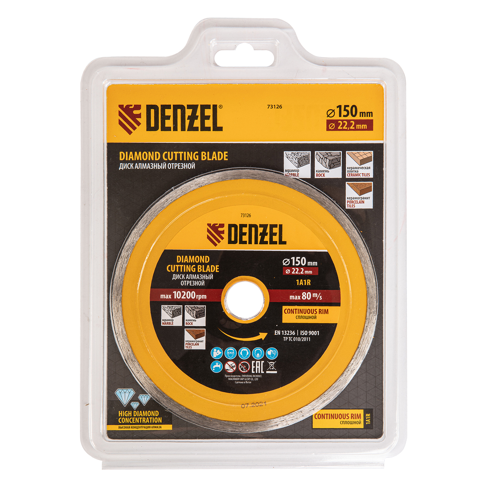 Отрезной алмазный диск Denzel «Сплошной» 73126 диаметром 150 х 22,2 мм используется для «мокрого» резания совместно с углошлифовальной машиной или плиткорезом с соответствующим посадочным диаметром. Режет камень, мрамор, керамогранитную и керамическую плитку. Диск отличается хорошей производительностью за счет высокой скорости реза, поэтому подходит для профессионального применения.