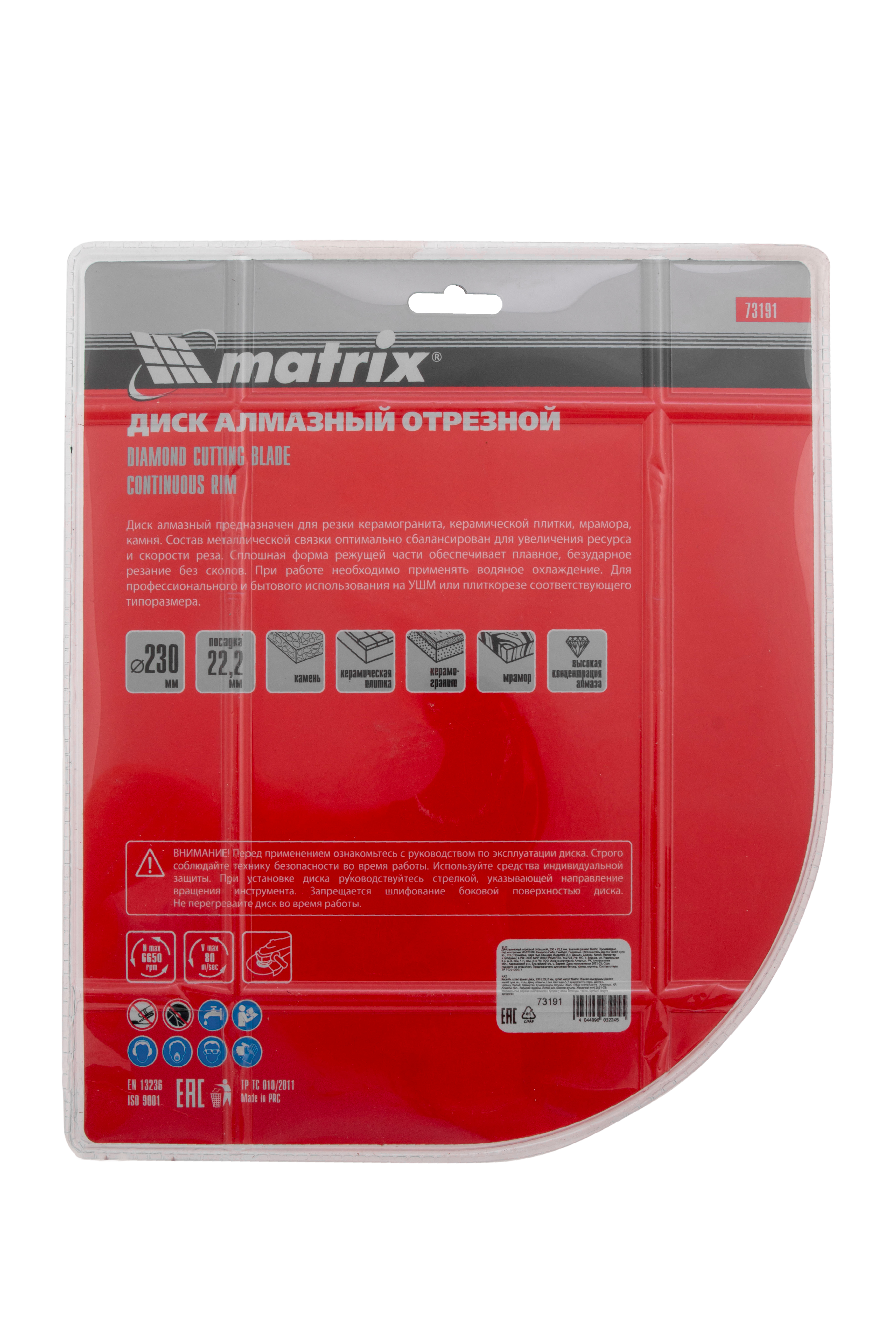 Отрезной алмазный сплошной диск Matrix 73191 диаметром 230 х 22,2 мм предназначен для мокрой резки мрамора, керамической плитки, керамогранита, натурального или искусственного камня. Устанавливается на углошлифовальную машину или плиткорез с посадочным диаметром 22,2 мм. Благодаря использованию водяного охлаждения улучшается качество реза, а также продлевается срок службы диска.