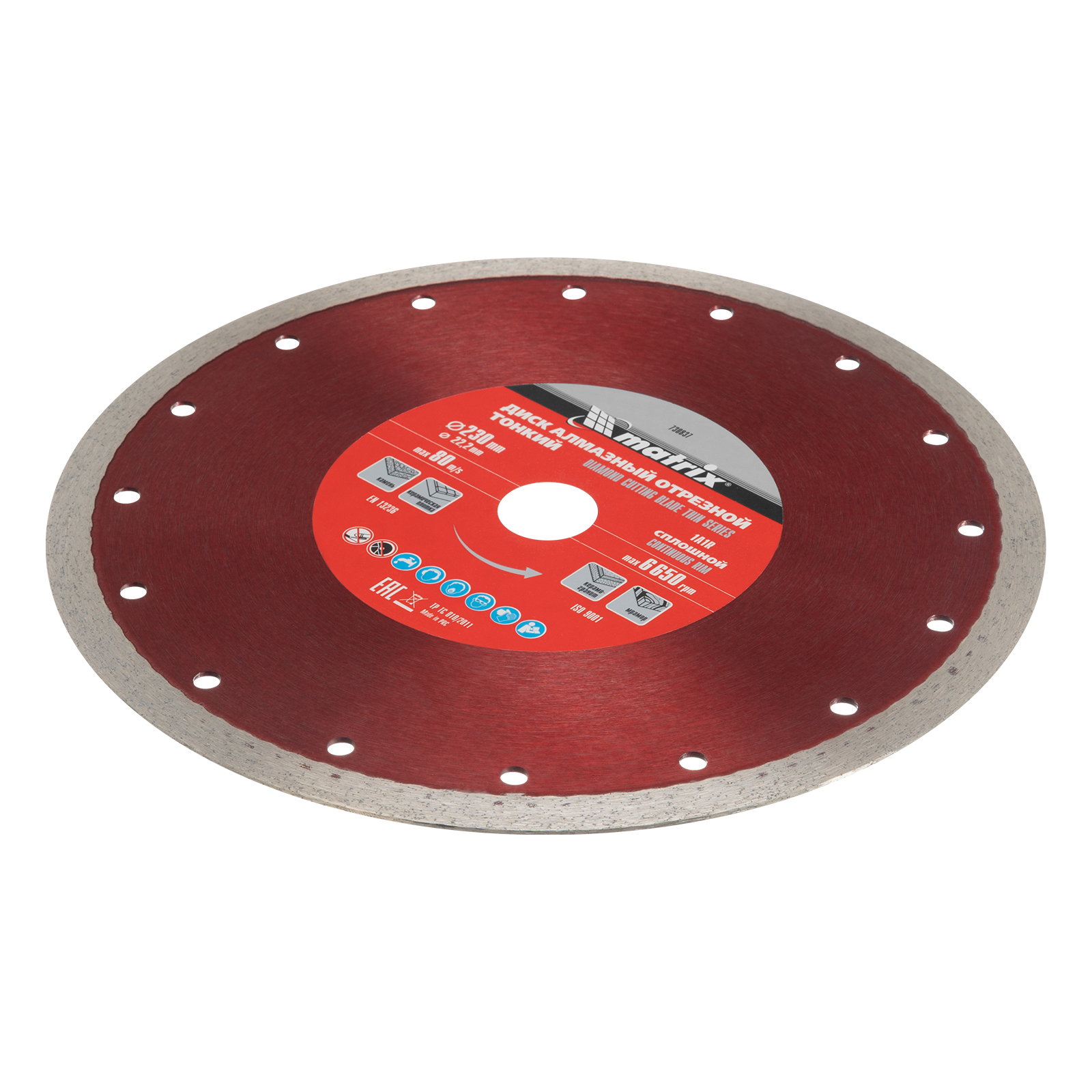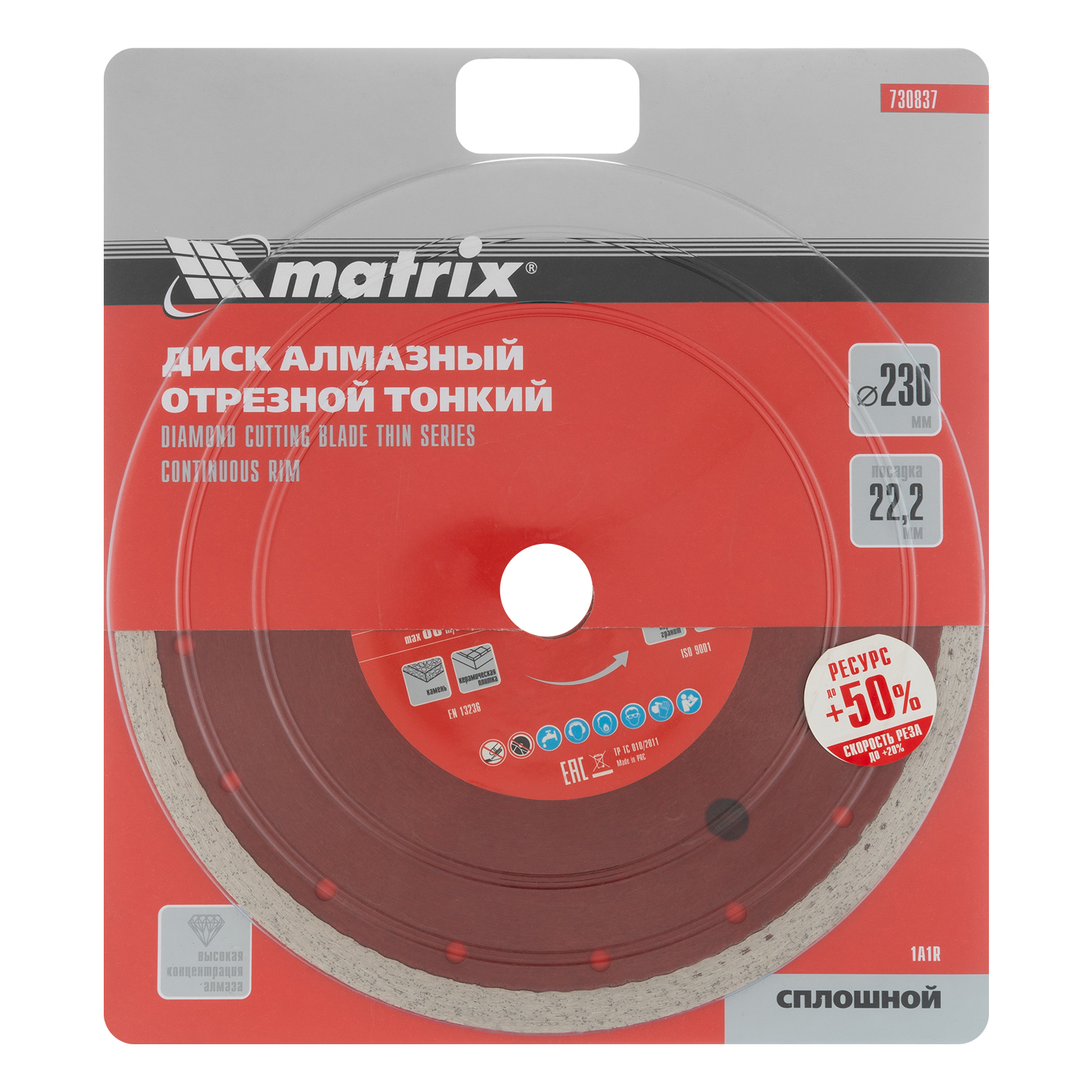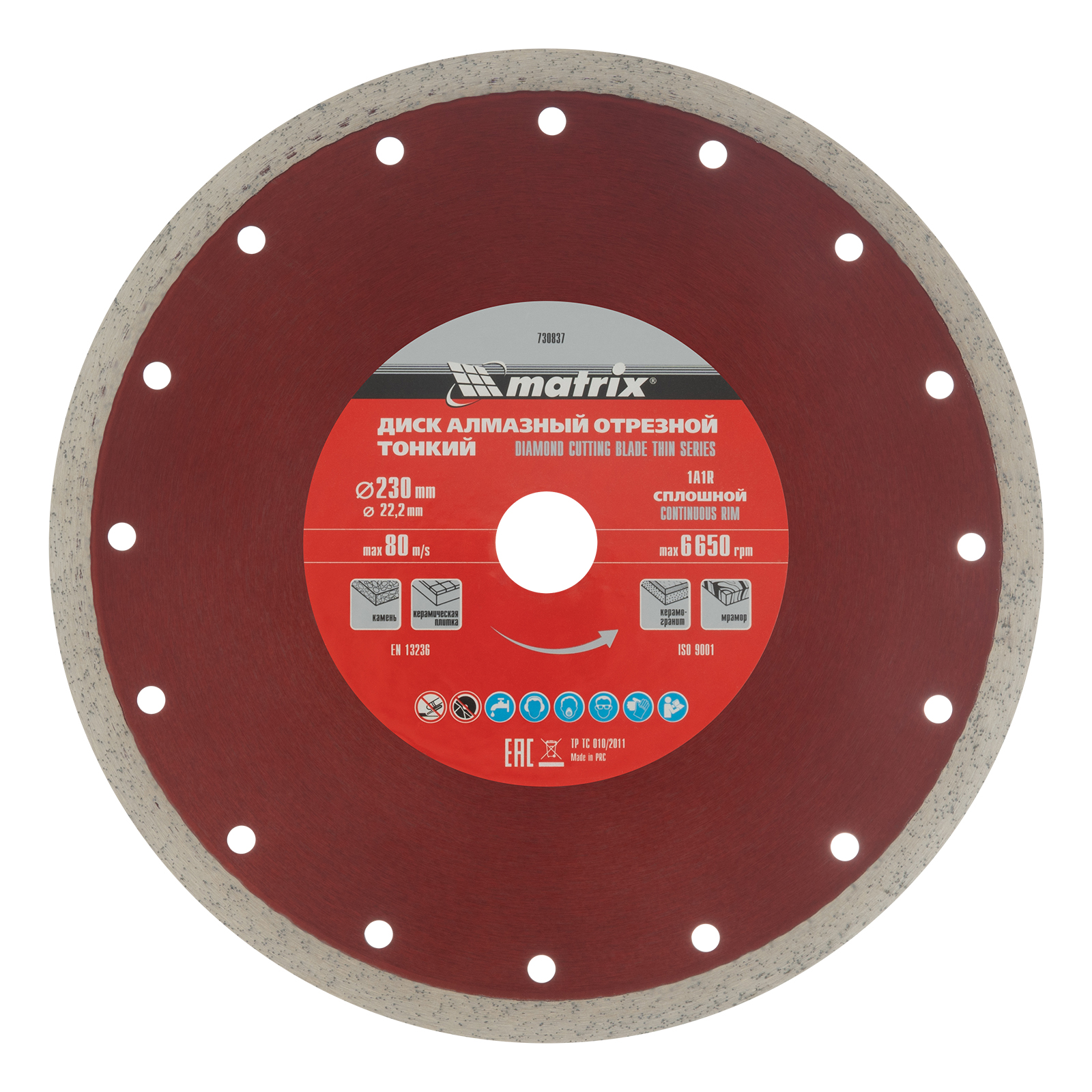 Отрезной сплошной алмазный диск Matrix ф230х22,2 мм 730837, тонкий, обеспечивает мокрое резание плотных материалов: керамогранита, керамической и кафельной плитки, мрамора, натурального и искусственного камня. Он устанавливается на УШМ или плиткорезы и используется с применением водяного охлаждения. Диск увеличивает производительность на 20% благодаря небольшой толщине 2,1 мм и снижению нагрузки на инструмент.