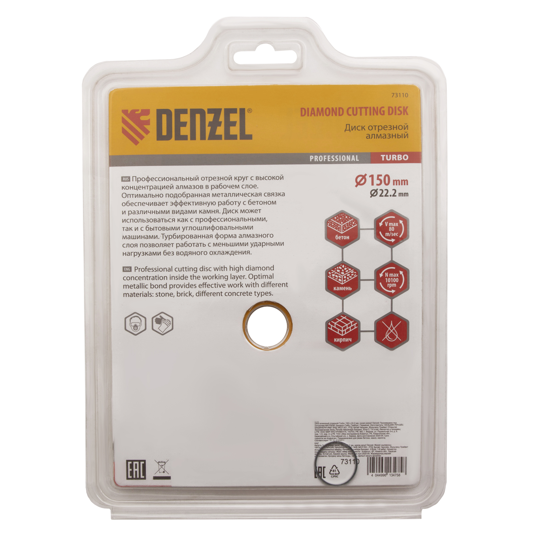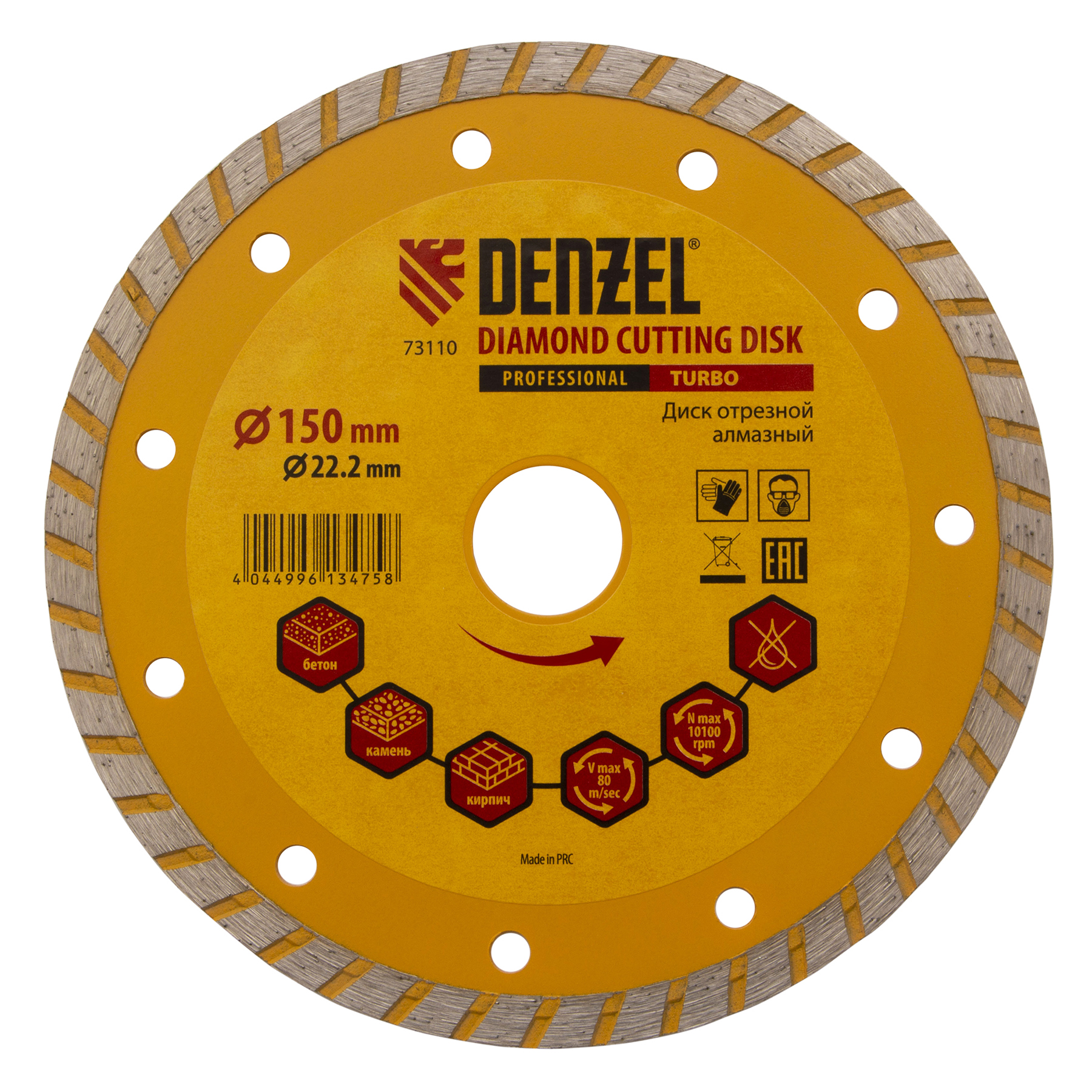 Отрезной алмазный диск Denzel Turbo 73110 диаметром 150 х 22,2 мм используется для сухой резки камня, кирпича, свежего и затвердевшего бетона, железобетона. Благодаря специальной форме испытывает уменьшенную нагрузку при резании материалов. Устанавливается на УШМ и применяется для проведения бытовых и профессиональных отрезных работ.