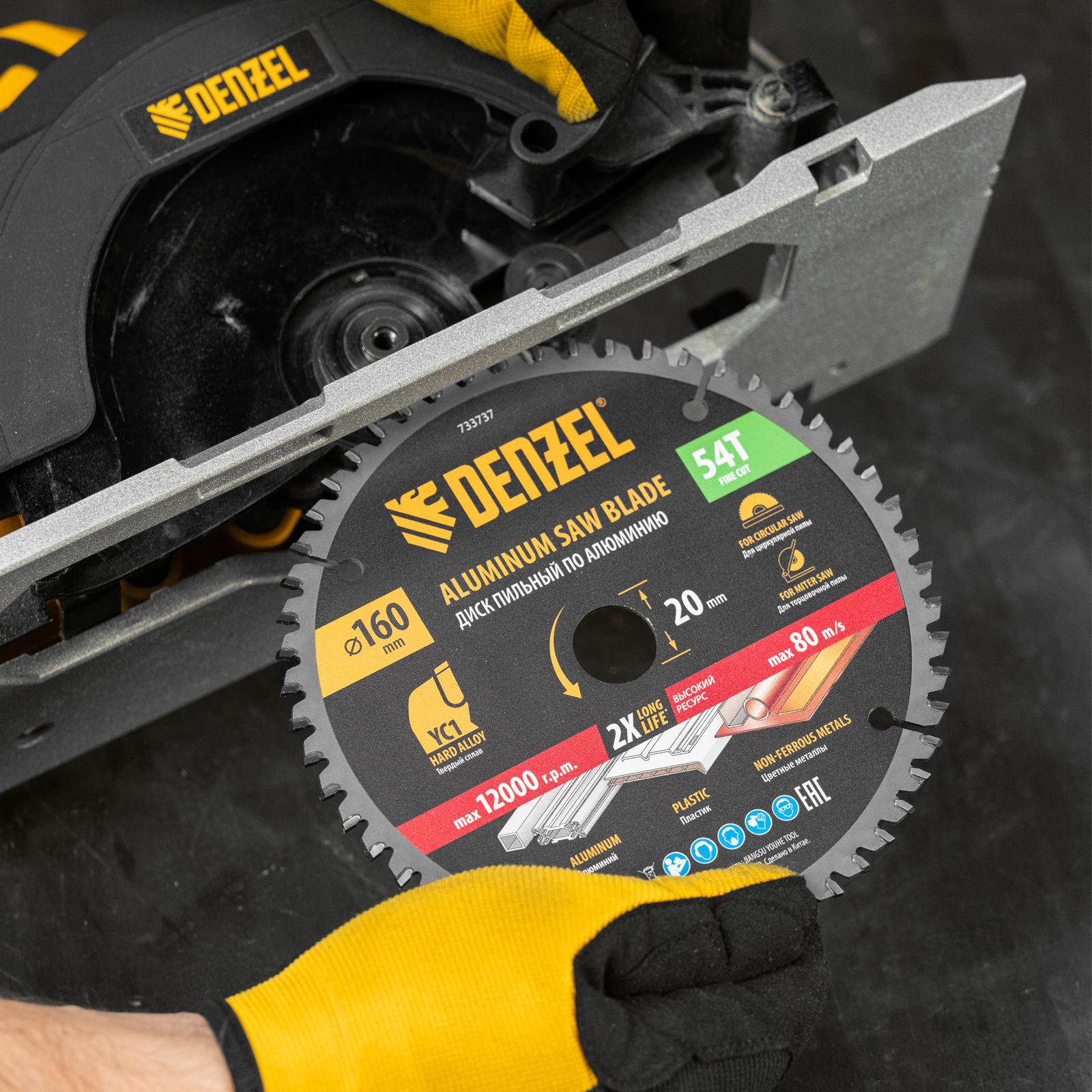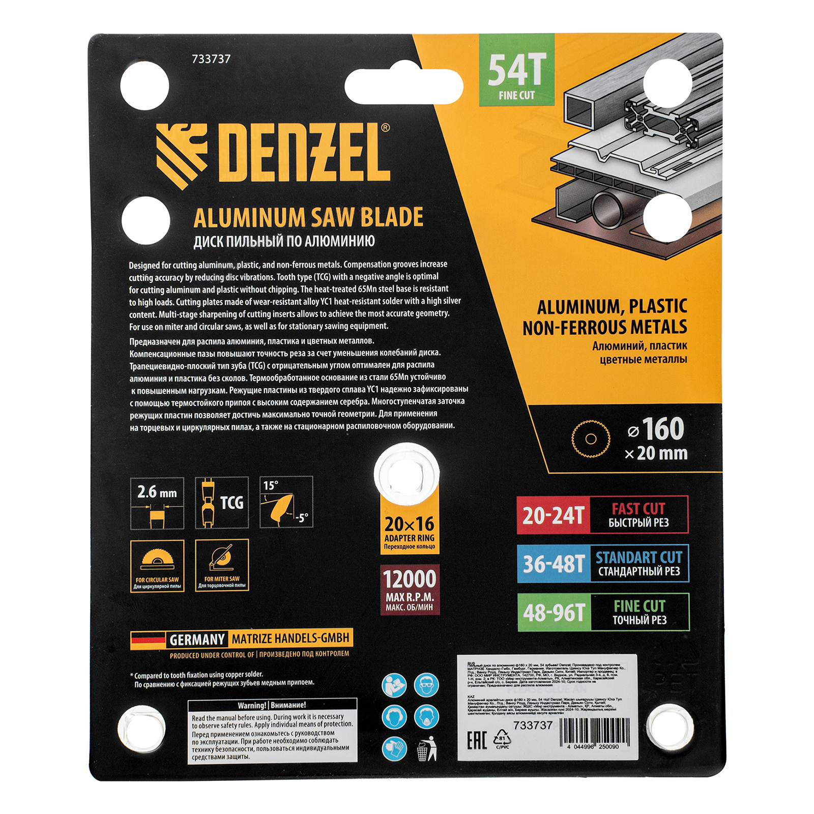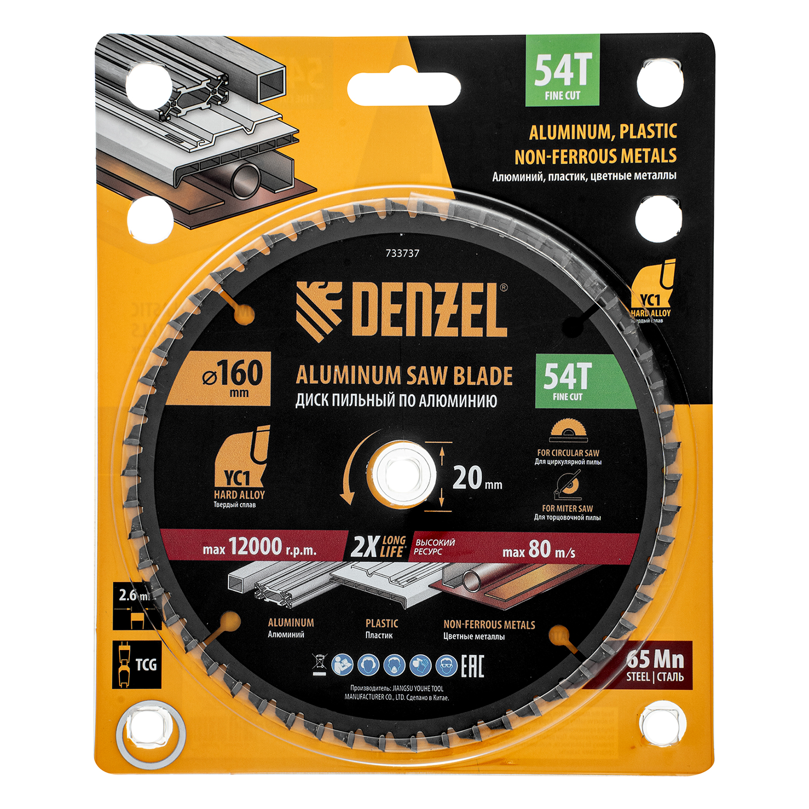 Пильный диск Denzel 733737 диаметром 160 x 20 мм, с 54 зубьями, предназначен для точного распиливания заготовок из алюминия, пластика, цветных металлов. Устанавливается на циркулярную или торцовочную пилу, поддерживающую максимальную частоту вращения 12000 об/мин, также возможно использование с распиловочным станком. Зубья трапециевидно-плоского типа (TCG) с отрицательным углом заточки обеспечивают ровный рез без сколов. В комплект поставки входит переходное кольцо 20/16 мм, позволяющее изменить посадочный диаметр при необходимости.