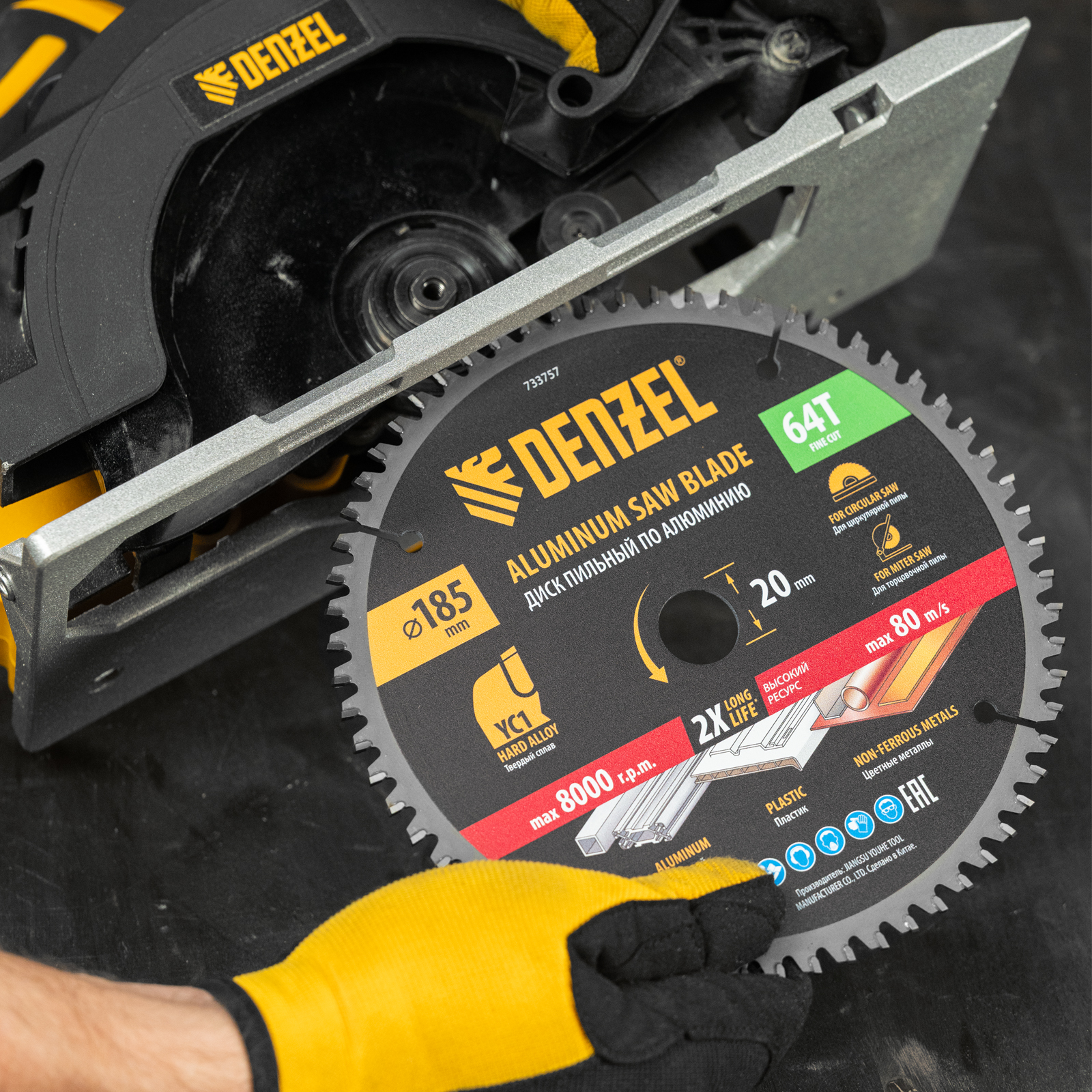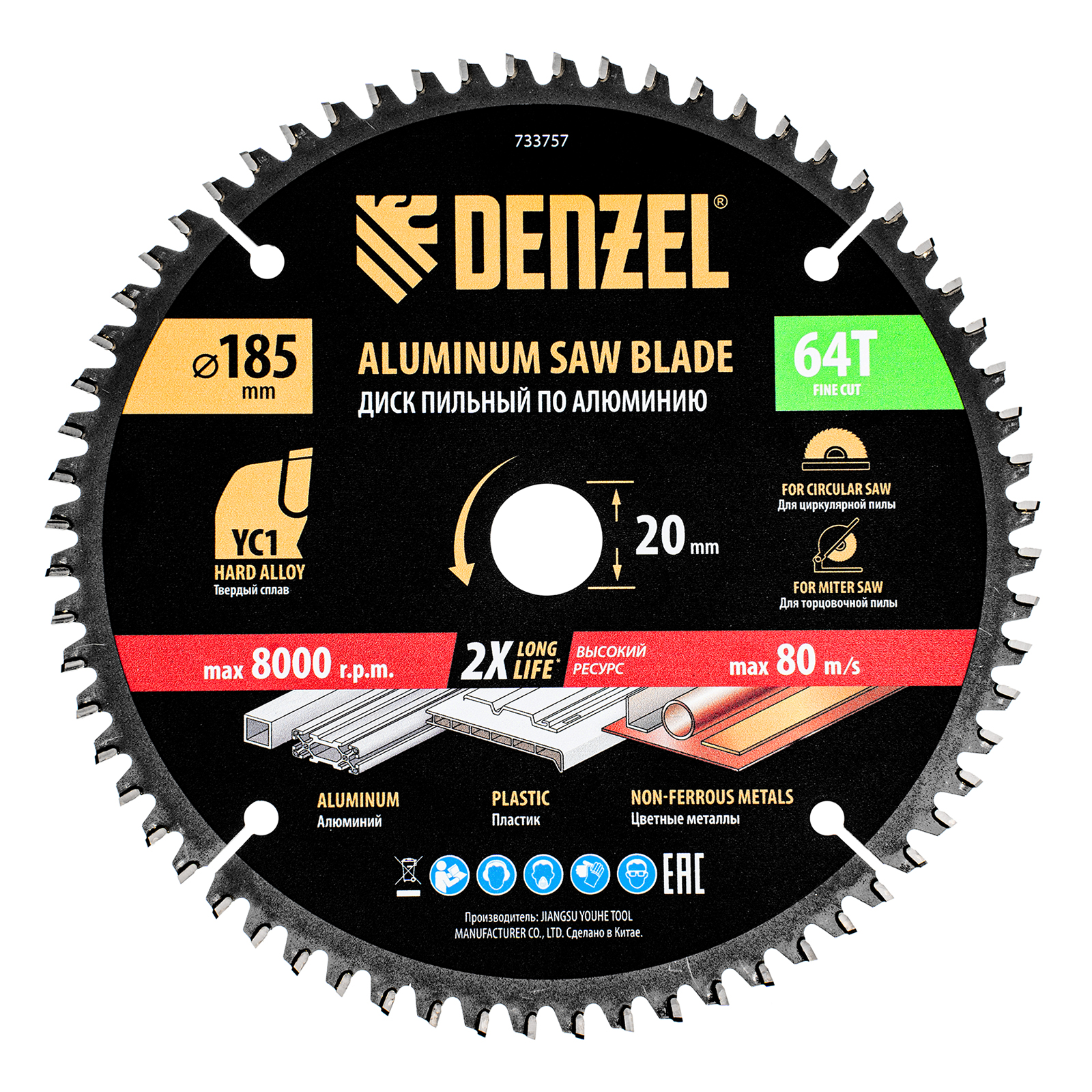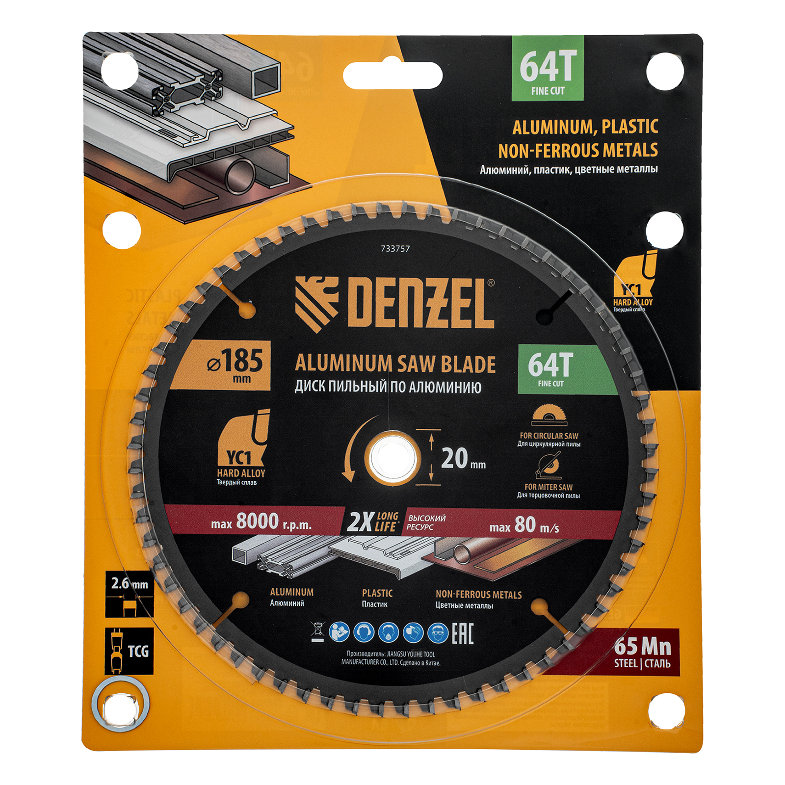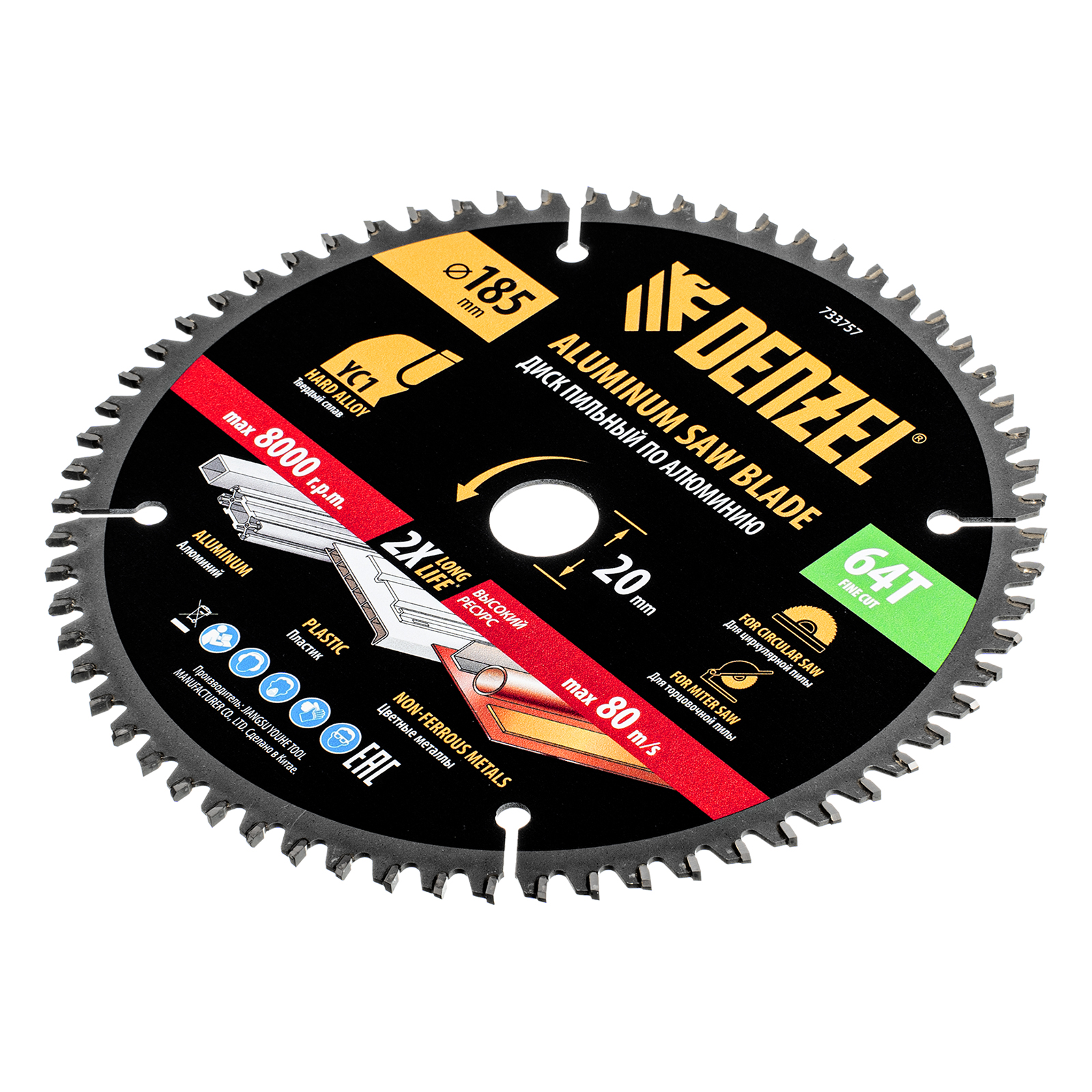 Пильный диск Denzel 733757 диаметром 185 x 20 мм, с 64 зубьями, предназначен для точного распиливания заготовок из алюминия, пластика, цветных металлов. Устанавливается на циркулярную или торцовочную пилу, также возможно использование с распиловочным станком. Зубья трапециевидно-плоского типа (TCG) с отрицательным углом заточки обеспечивают ровный рез без сколов. В комплект поставки входит переходное кольцо 20/16 мм, позволяющее изменить посадочный диаметр при необходимости.