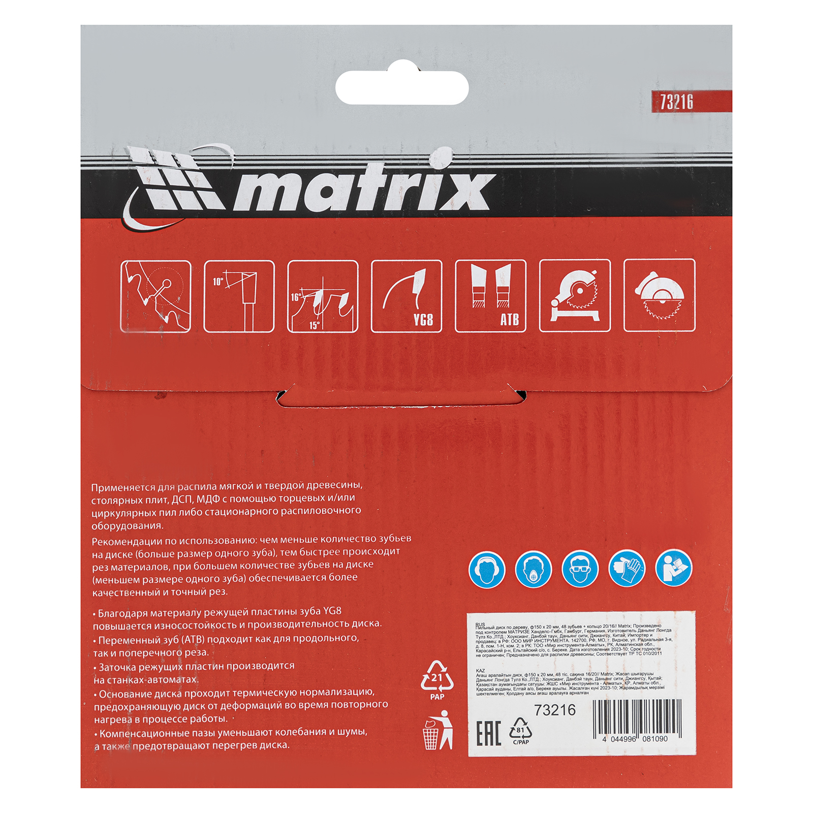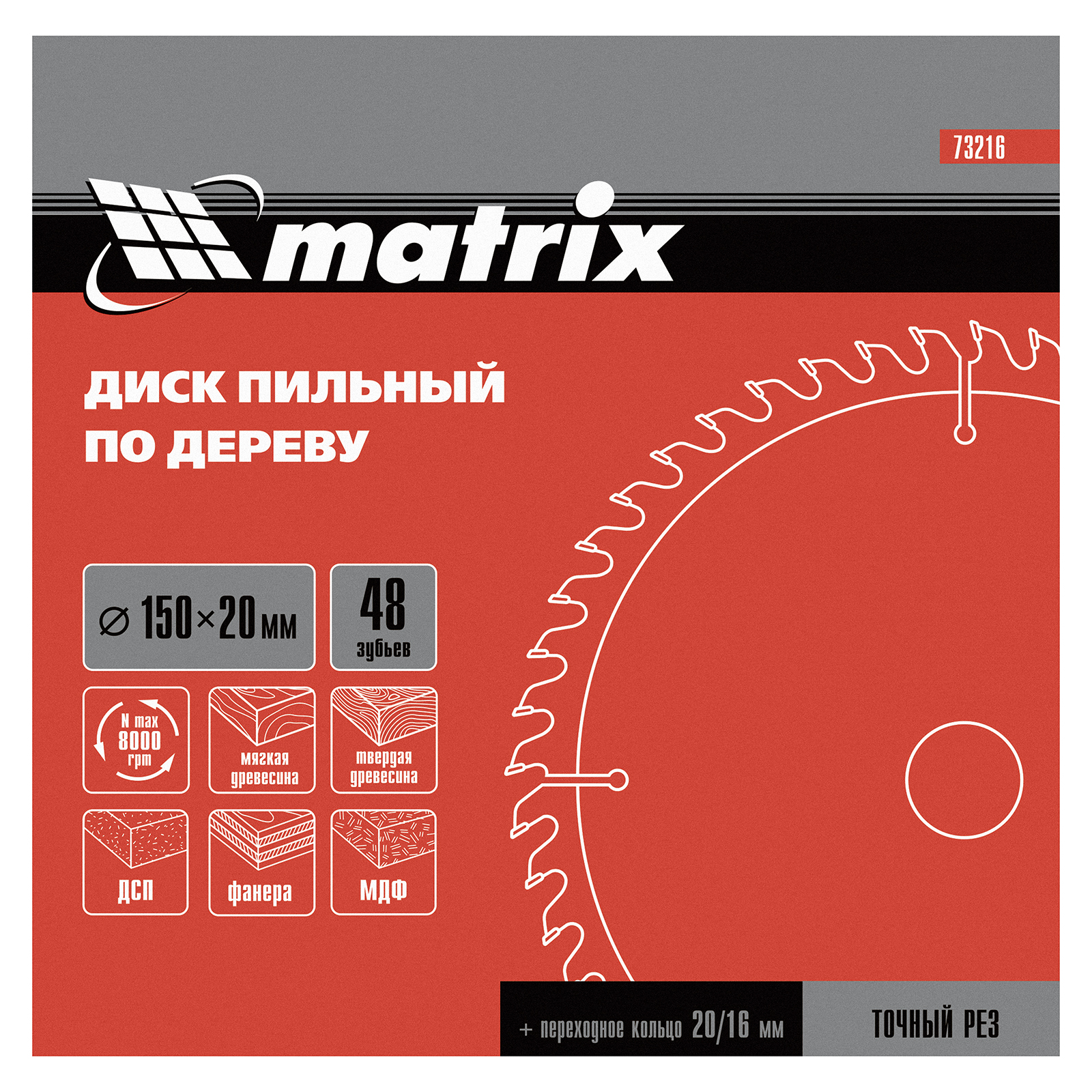 Пильный диск по дереву Matrix 73216 диаметром 150 х 20 мм, с 48 зубьями и переходным кольцом 20/16, — оснастка для циркулярных и торцовочных пил с соответствующим посадочным и внешним диаметром. Используется преимущественно для поперечного реза материалов из мягкой и твердой древесины, ДСП, ДВП, фанеры, столярных плит. В комплект поставки входит переходное кольцо 20/16, позволяющее самостоятельно изменить посадочный диаметр при необходимости. Диск подходит для бытового и профессионального применения.