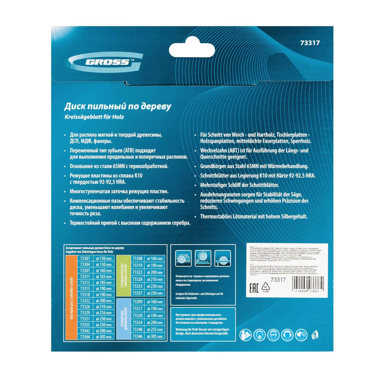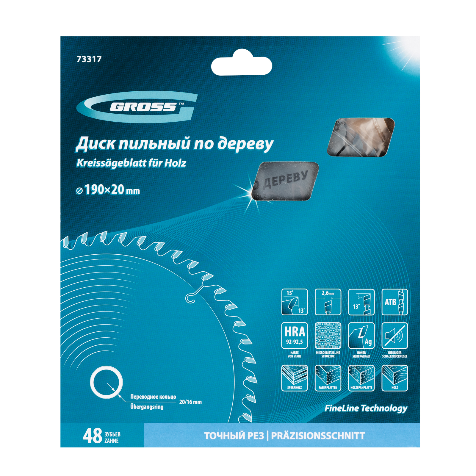 Пильный диск Gross 73317, ф190 х 20 мм, с 48 зубьями и переходным кольцом 20/16 мм, предназначен для распила древесины мягких и твердых пород, ДСП, МДФ и фанеры. Является оснасткой для циркулярных и торцовочных пил с посадочным диаметром 20 мм, благодаря универсальному типу зубьев АТВ подходит как для продольного, так и для поперечного реза материалов. Диск изготовлен на высококачественном оборудовании, специально рассчитан на профессиональное применение и выполнение большого объема работ.