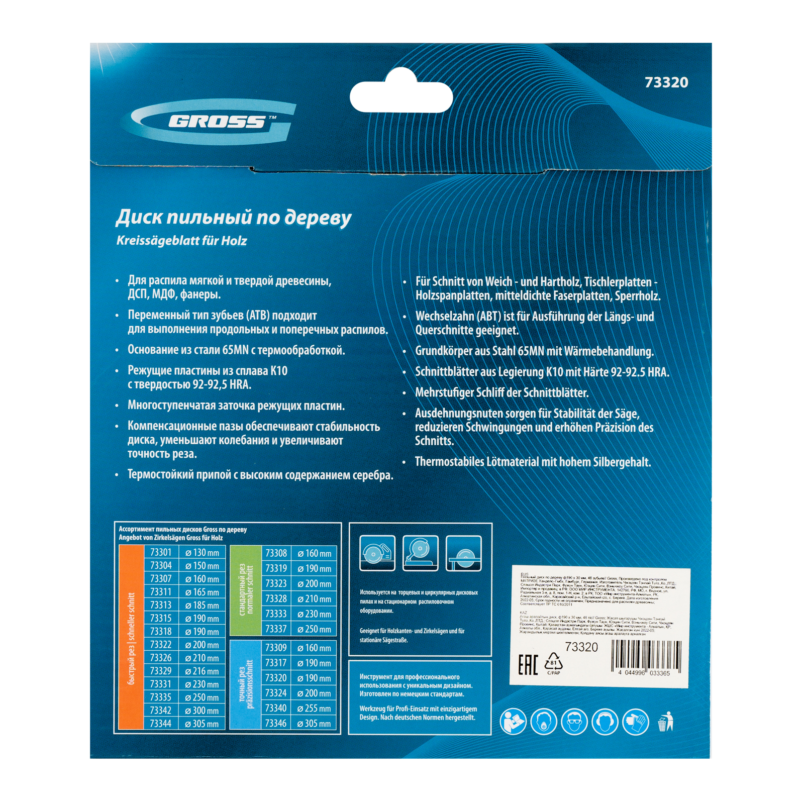 Пильный диск Gross 73320, ф190 х 30 мм, с 48 зубьями, предназначен для распила древесины мягких и твердых пород, ДСП, МДФ и фанеры. Является оснасткой для циркулярных и торцовочных пил с посадочным диаметром 20 мм, благодаря универсальному типу зубьев АТВ подходит как для продольного, так и для поперечного реза материалов. Диск изготовлен на высококачественном оборудовании, специально рассчитан на профессиональное применение и выполнение большого объема работ.