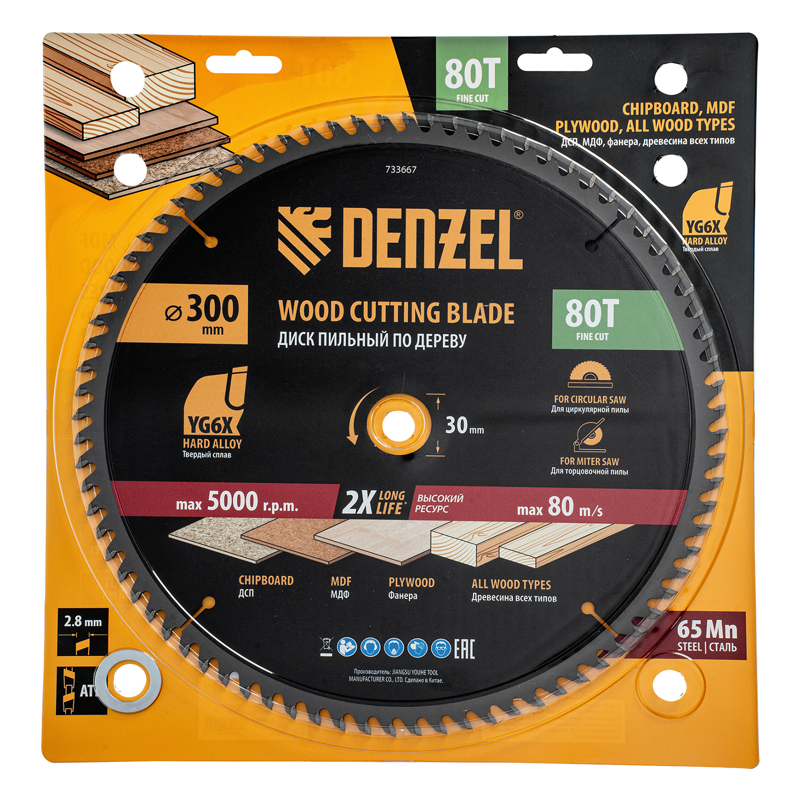 Пильный диск Denzel 733667 диаметром 300 x 30 мм, с 80 зубьями, предназначен для точного продольного и поперечного распила твердой и мягкой древесины, фанеры, МДФ, ДСП. 80 зубьев типа ATB с режущими пластинами оптимальной геометрии обеспечивают максимально чистый рез. Режущие пластины из твердого сплава YG6X сохраняют рабочие свойства при интенсивном использовании. Диск устанавливается на циркулярную, торцовочную пилу или на распиловочный станок. В комплект поставки входит переходное кольцо с 30 на 20 мм, что позволяет изменить посадочный размер и расширяет возможности использования диска.