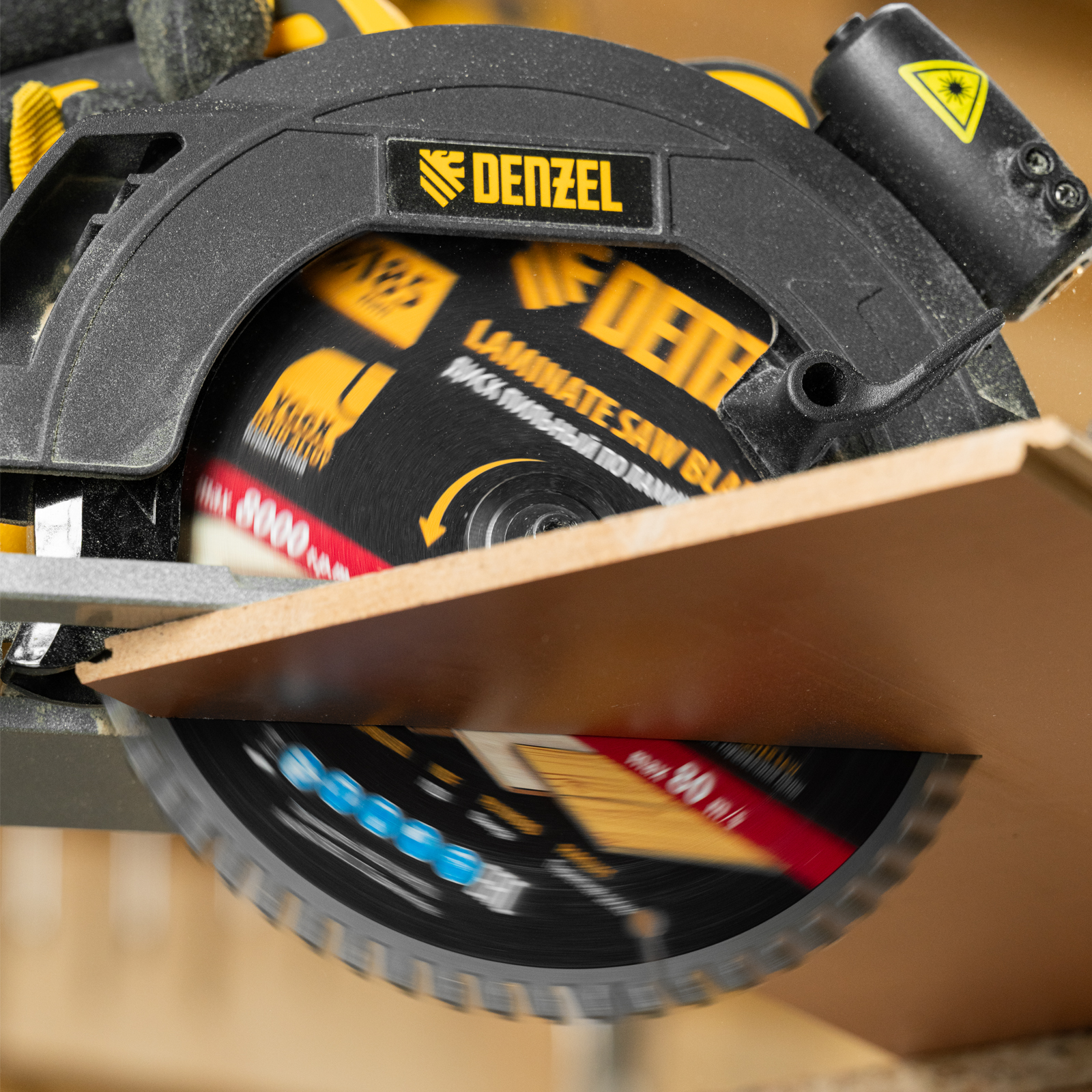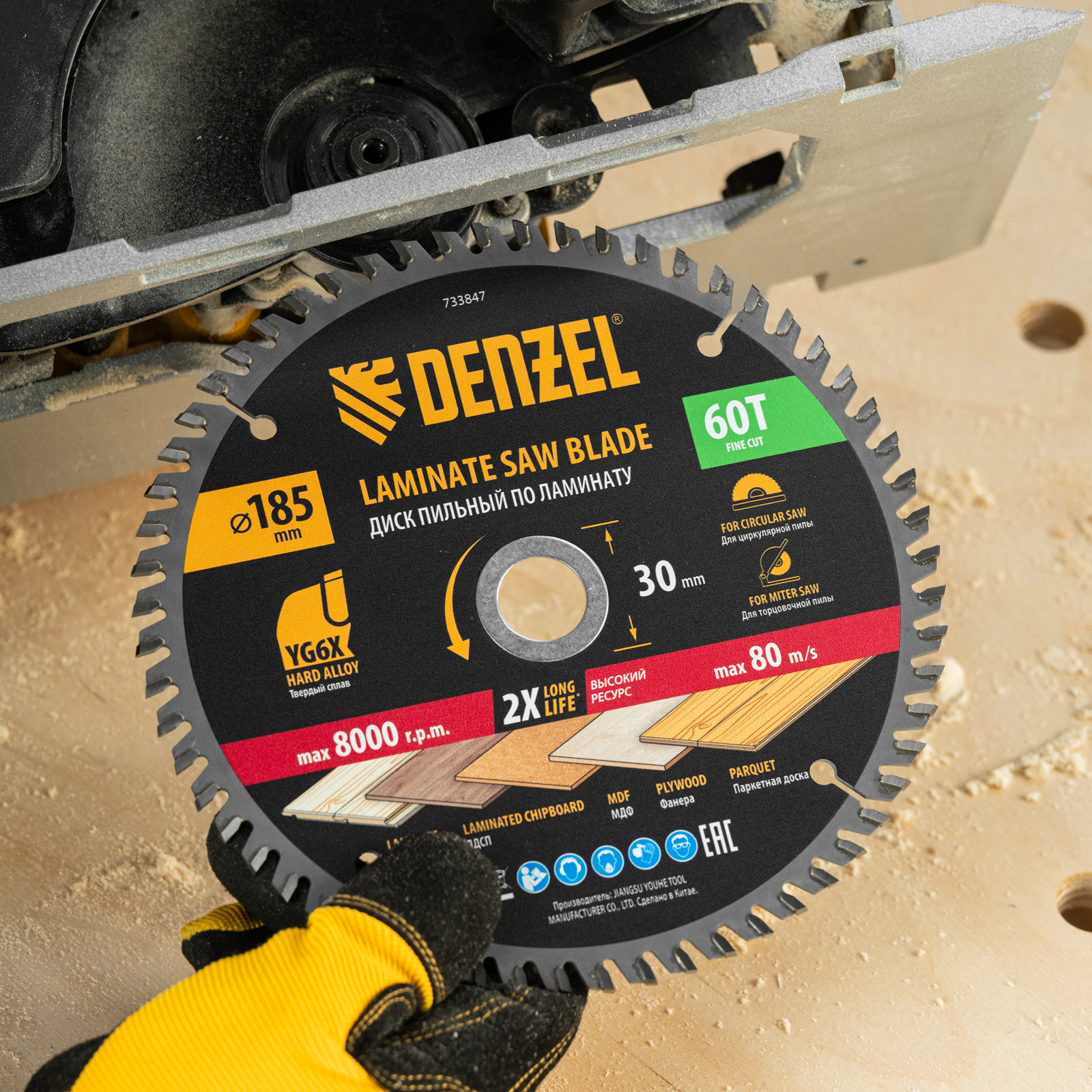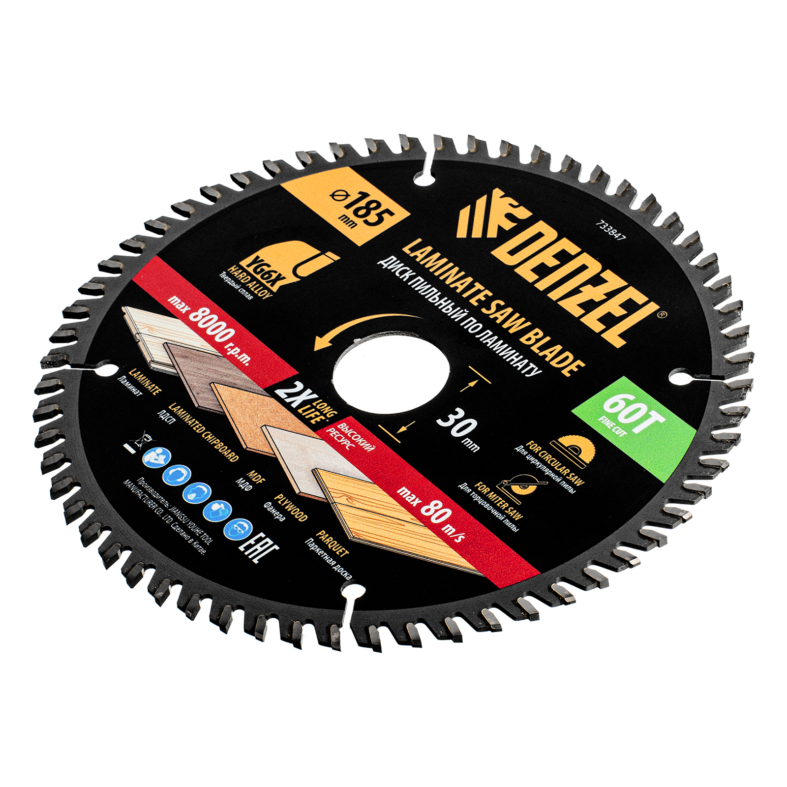 Пильный диск Denzel 733847 диаметром 185 x 30 мм, с 60 зубьями, используется для точного распиливания ламината, ЛДСП, МДФ, фанеры, паркетной доски. 60 мелких трапециевидно-плоских зубьев с положительным углом заточки позволяют эффективно решать поставленные задачи, обеспечивая чистый рез. Диск устанавливается на циркулярную или торцовочную пилу, а также на распиловочный станок. Можно установить оснастку на инструмент с другим посадочным диаметром — для этого предусмотрено переходное кольцо 30/20 мм.