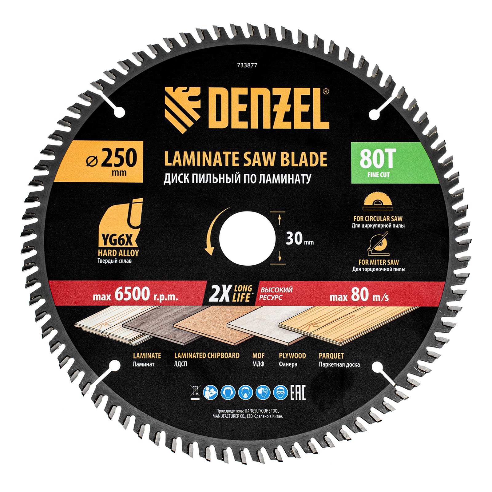 Пильный диск Denzel 733877 диаметром 250 x 30 мм, с 80 зубьями, используется для точного распиливания ламината, ЛДСП, МДФ, фанеры, паркетной доски. 80 мелких трапециевидно-плоских зубьев с положительным углом заточки позволяют эффективно решать поставленные задачи, обеспечивая максимально чистый рез. Диск устанавливается на циркулярную или торцовочную пилу, а также на распиловочный станок. Можно установить оснастку на инструмент с другим посадочным диаметром — для этого предусмотрено переходное кольцо 30/20 мм.