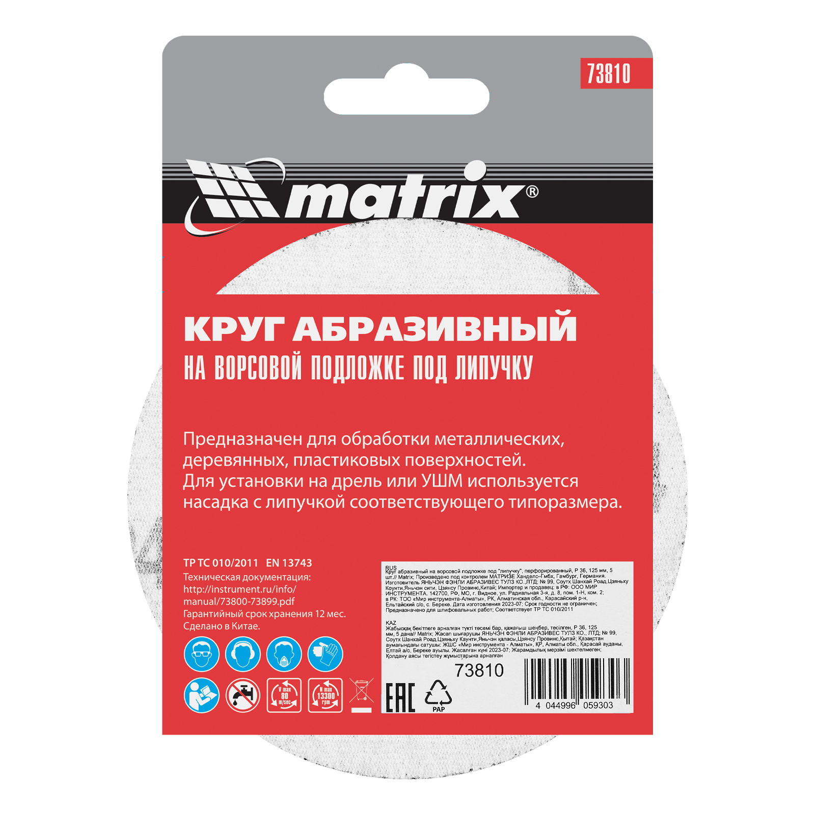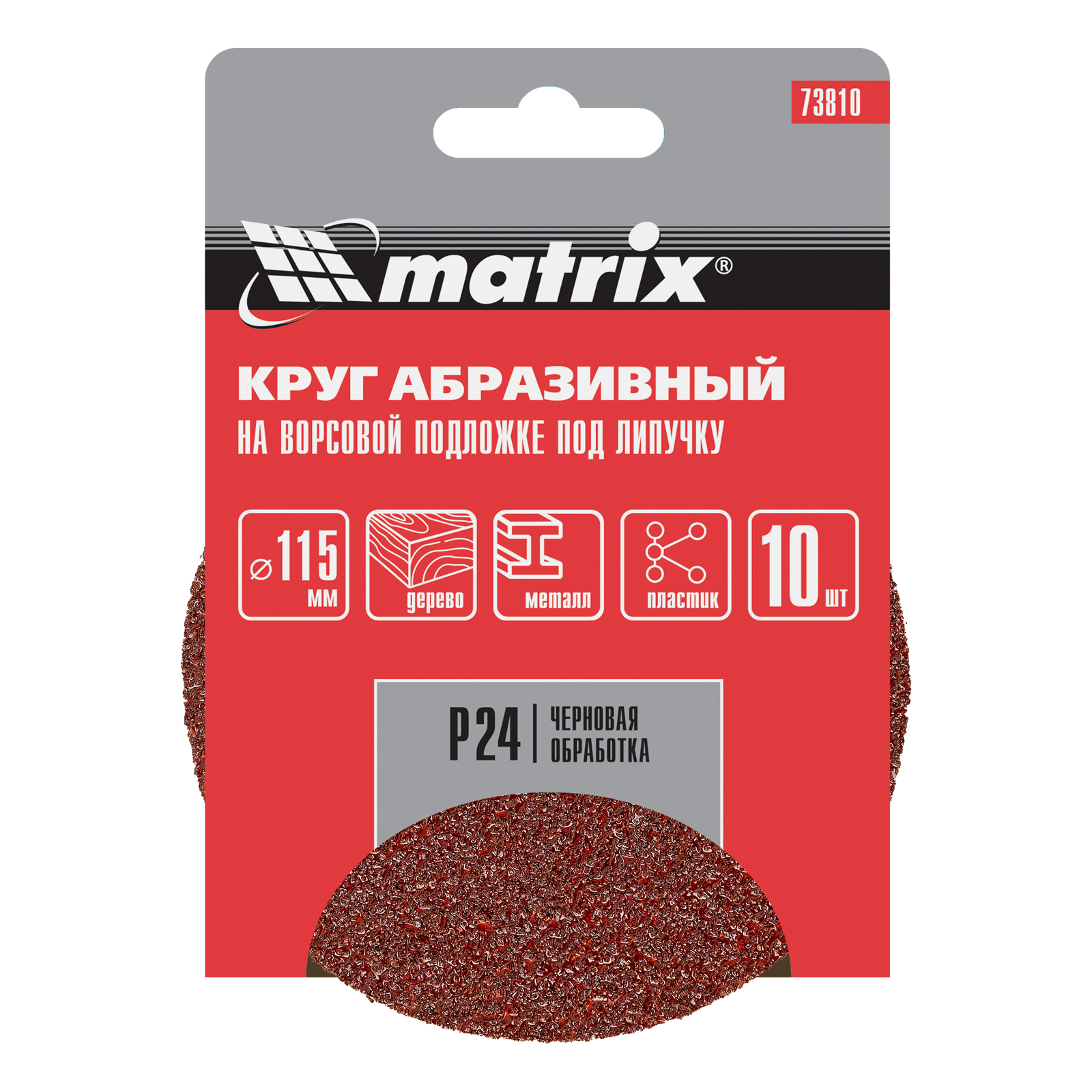 Абразивный круг на ворсовой подложке под «липучку» Matrix 73810 диаметром 115 мм, с абразивом Р 24, 10 шт. в упаковке, используется для сухого чернового шлифования металла, древесины, пластика и других материалов. Круг устанавливается на эксцентриковую (орбитальную) шлифовальную машинку или на дрель с помощью опорной насадки Matrix.