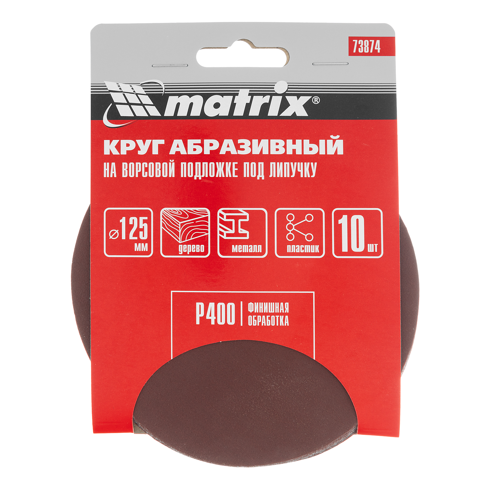 Абразивный круг на ворсовой подложке под «липучку» Matrix 73874 с зернистостью Р 400, диаметром 125 мм, используется для сухого финишного шлифования металла, древесины, пластика и других поверхностей. Круг устанавливается на эксцентриковую (орбитальную) шлифовальную машинку или на дрель с помощью опорной насадки Matrix соответствующего диаметра.