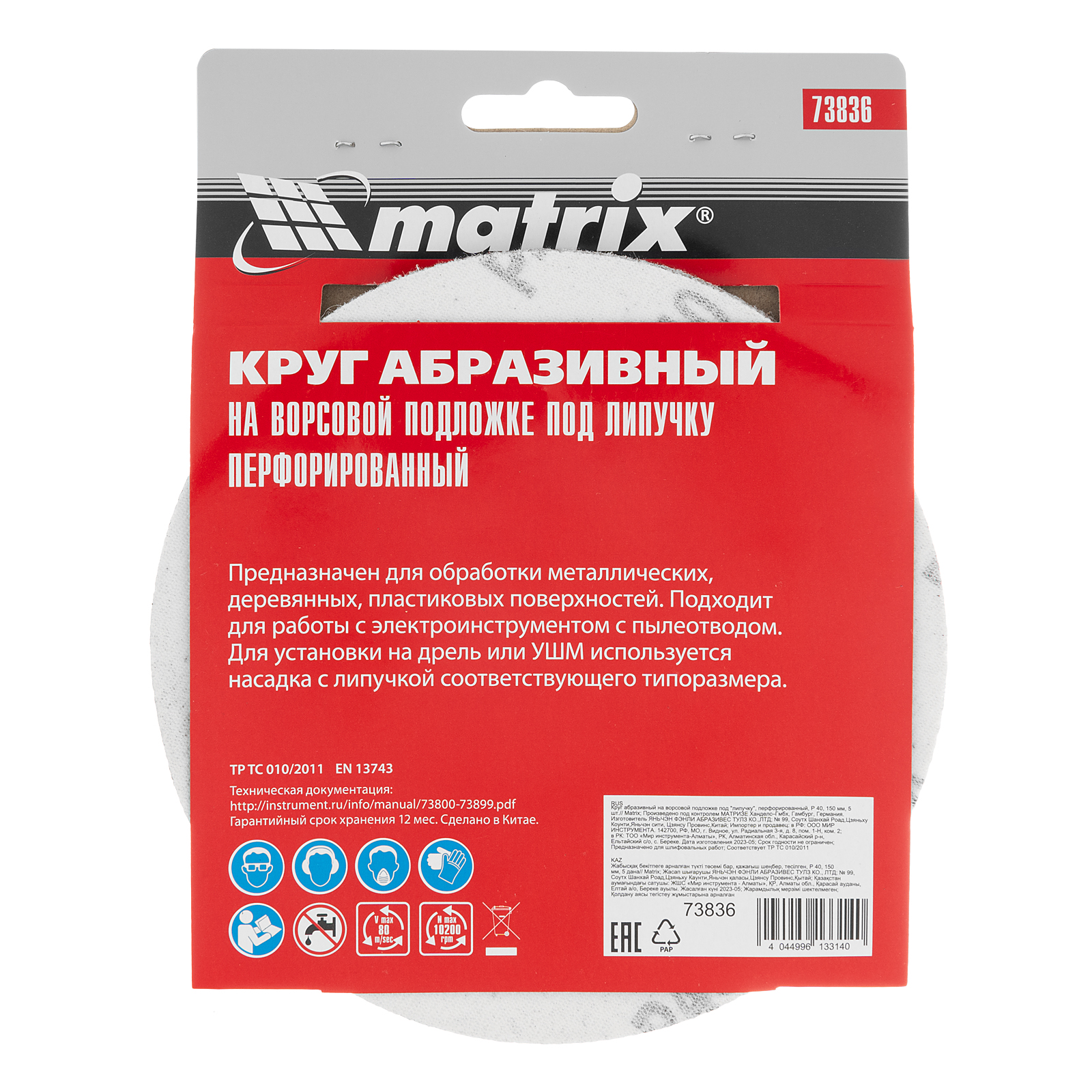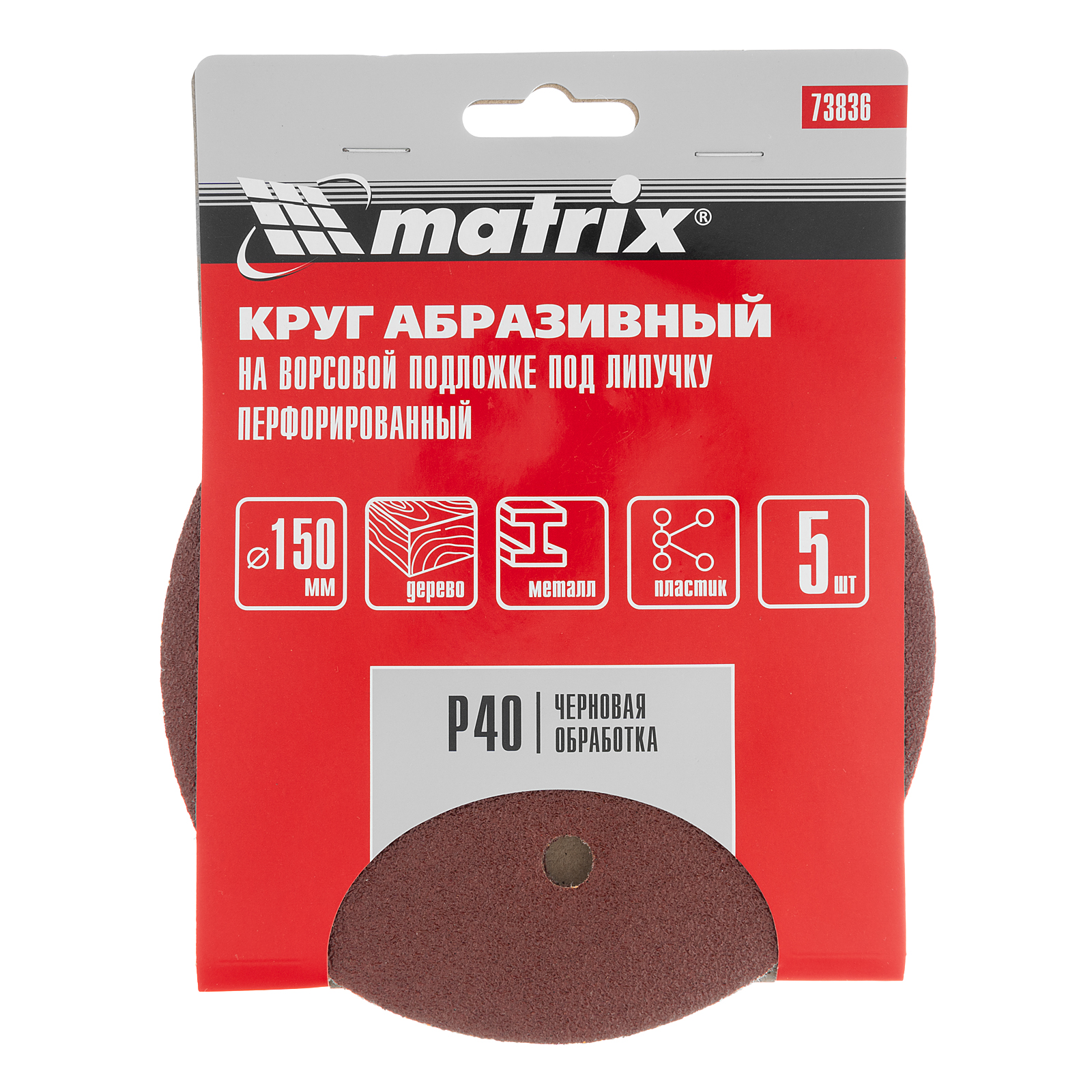 Перфорированный абразивный круг на ворсовой подложке под «липучку» Matrix 73836 с зернистостью Р 40, диаметром 150 мм, используется для сухого чернового шлифования металла, древесины, пластика и других поверхностей. Круг устанавливается на эксцентриковую (орбитальную) шлифовальную машинку с возможностью отвода воздуха или на дрель с помощью опорной насадки Matrix соответствующего диаметра. Крупнозернистый абразив Р 40 позволяет избавиться от заусенцев, подходит для зачистки старого покрытия (краски/лака), удаления ржавчины, снятия слоя материала.