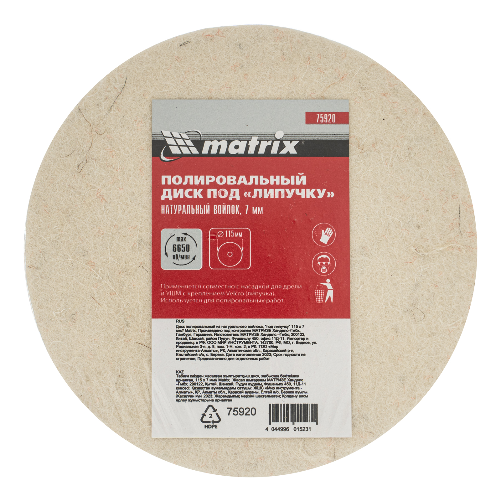 Полировальный диск под «липучку» Matrix арт. 75920 предназначен для тонких работ по металлу, стеклу, камню, пластмассе. Он устанавливается на полировальные машины, углошлифовальные машинки или дрели совместно с опорной тарелкой (насадкой) диаметром 115 мм. Диск изготовлен из натурального войлока, оптимального для полировки материалов, сглаживания микротрещин, придания поверхности блеска, в том числе после обработки мелкозернистым абразивом.