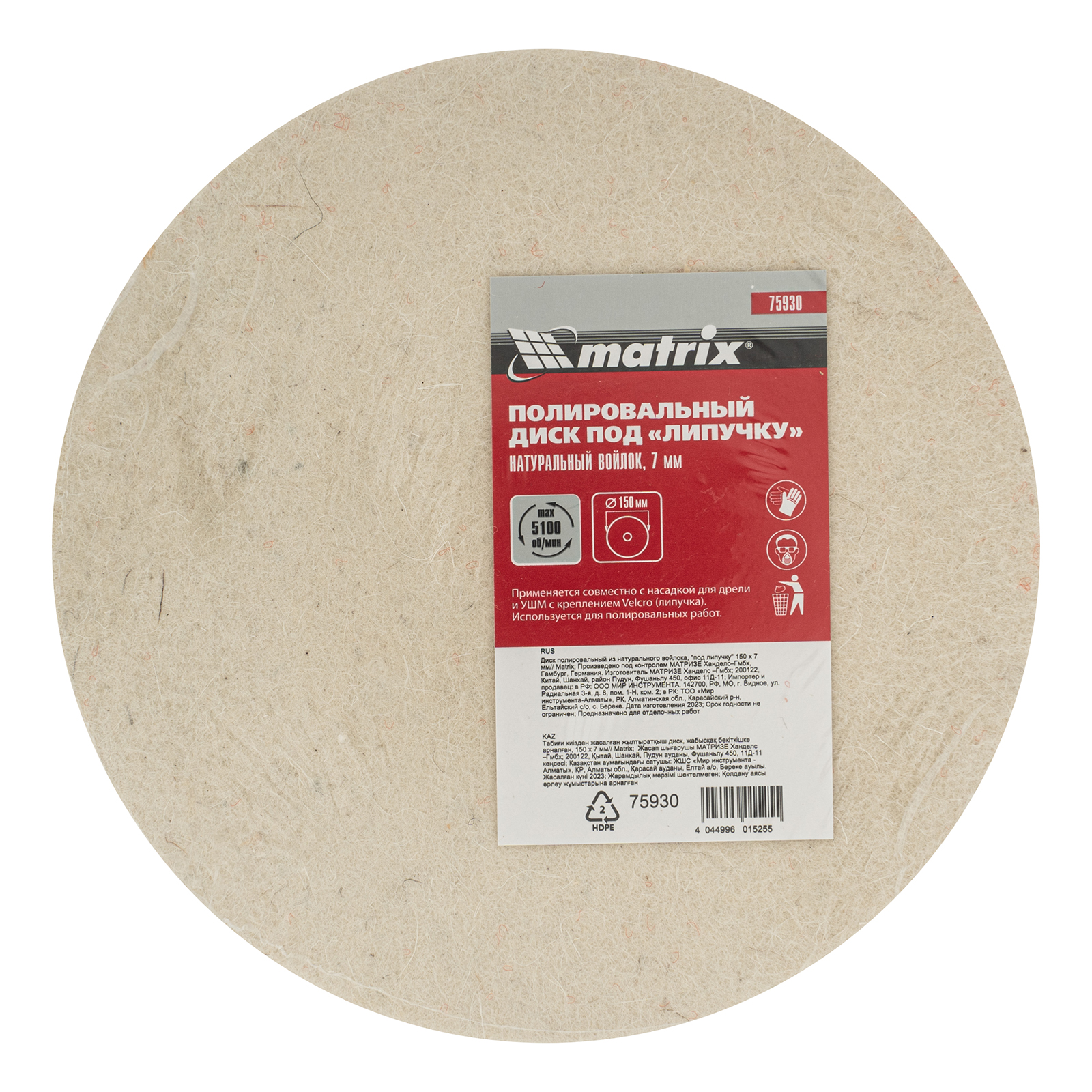 Полировальный диск под «липучку» Matrix арт. 75930 предназначен для тонких работ по металлу, стеклу, камню, пластмассе. Он устанавливается на полировальные машины, углошлифовальные машинки или дрели совместно с опорной тарелкой (насадкой) диаметром 150 мм. Диск изготовлен из натурального войлока, оптимального для полировки материалов, сглаживания микротрещин, придания поверхности блеска, в том числе после обработки мелкозернистым абразивом.