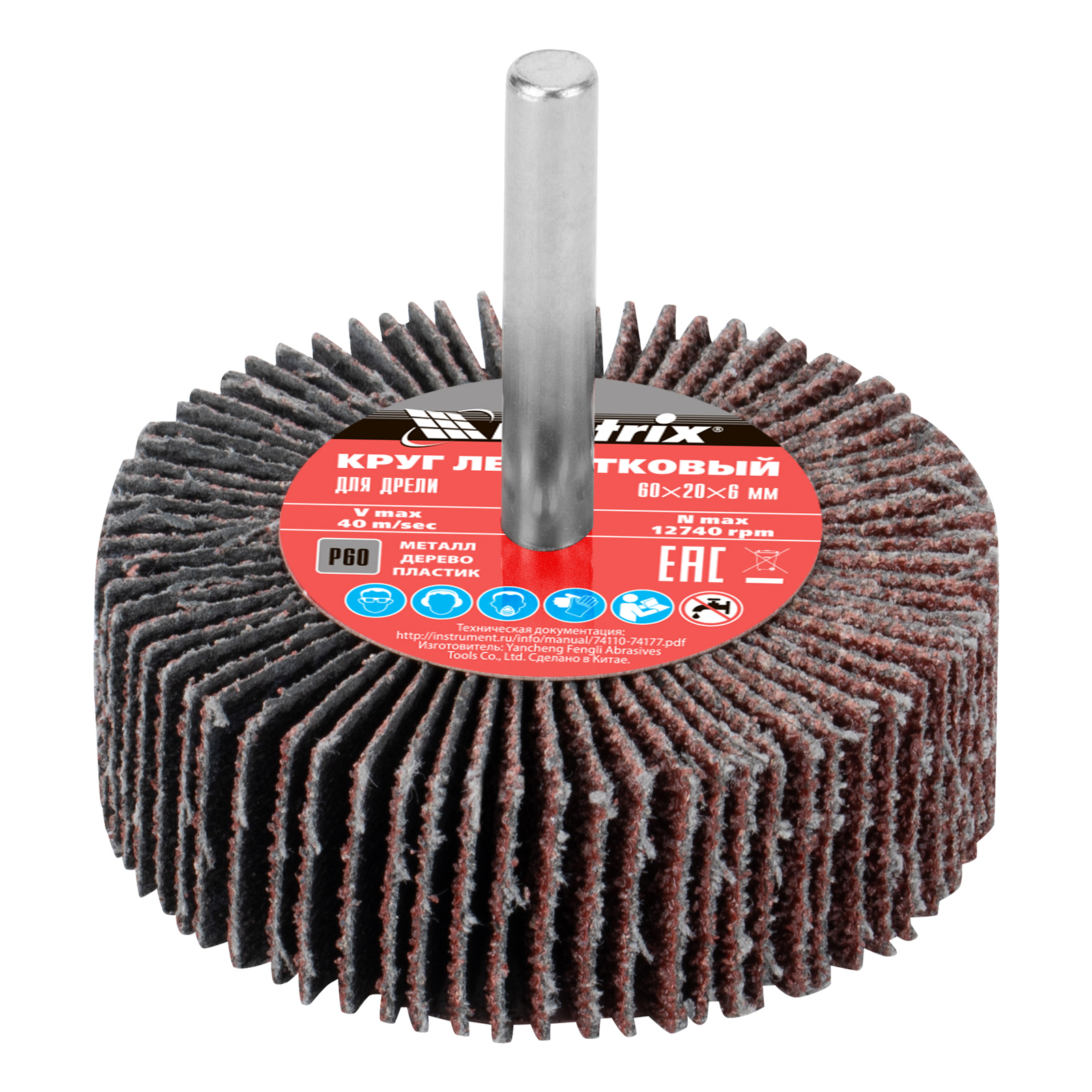 Лепестковый круг для дрели Matrix 74112 размером 60 х 20 х 6 мм, с зернистостью P 60, используется для черновой обработки металлических и деревянных поверхностей. Имеет стальной хвостовик диаметром 6 мм, при помощи которого устанавливается в патрон дрели или прямой шлифовальной машины с максимальной скоростью вращения 8000 об/мин. Крупнозернистый абразив P 60 легко удаляет слои ржавчины, краски и лака, обрабатывает сварные швы, удаляет заусенцы.