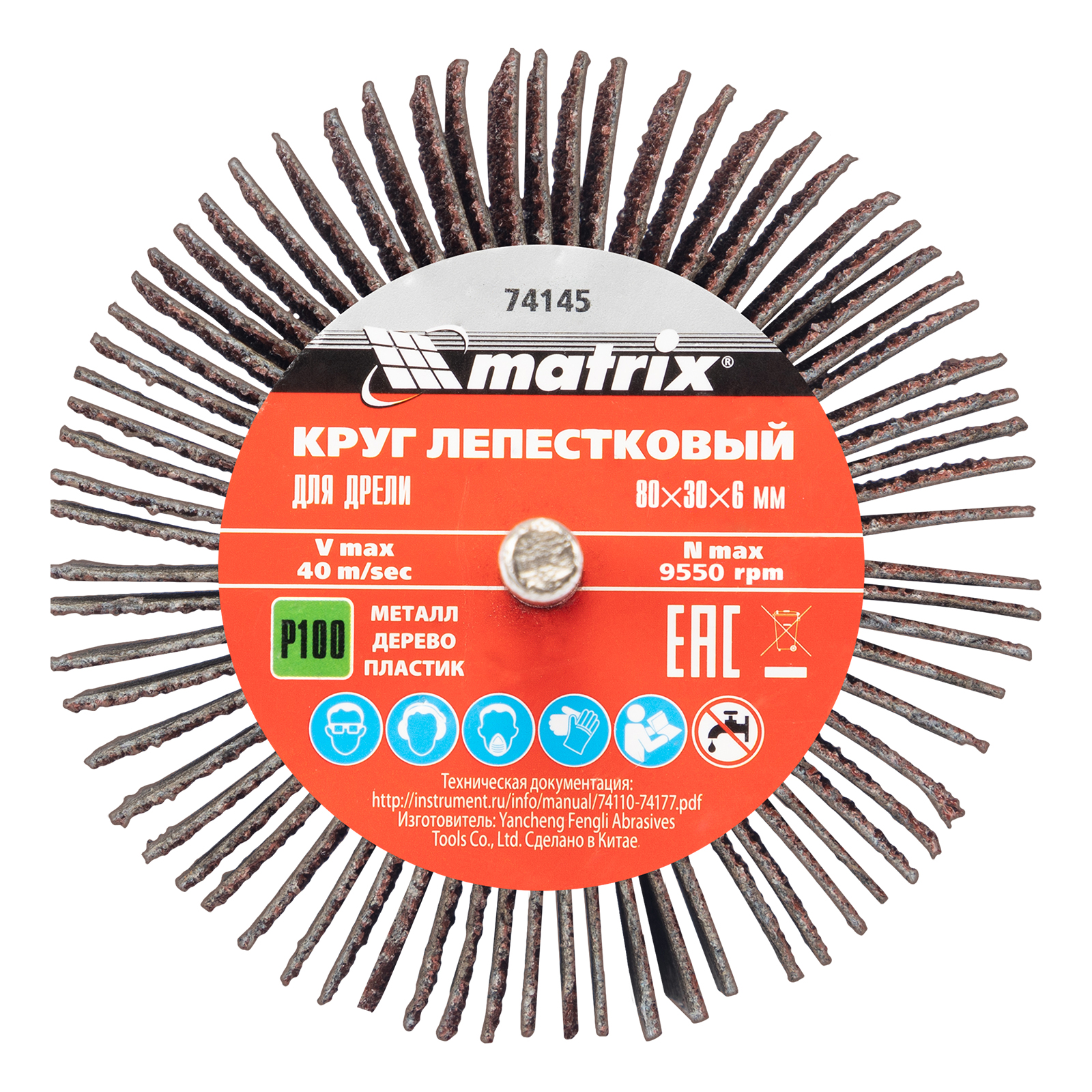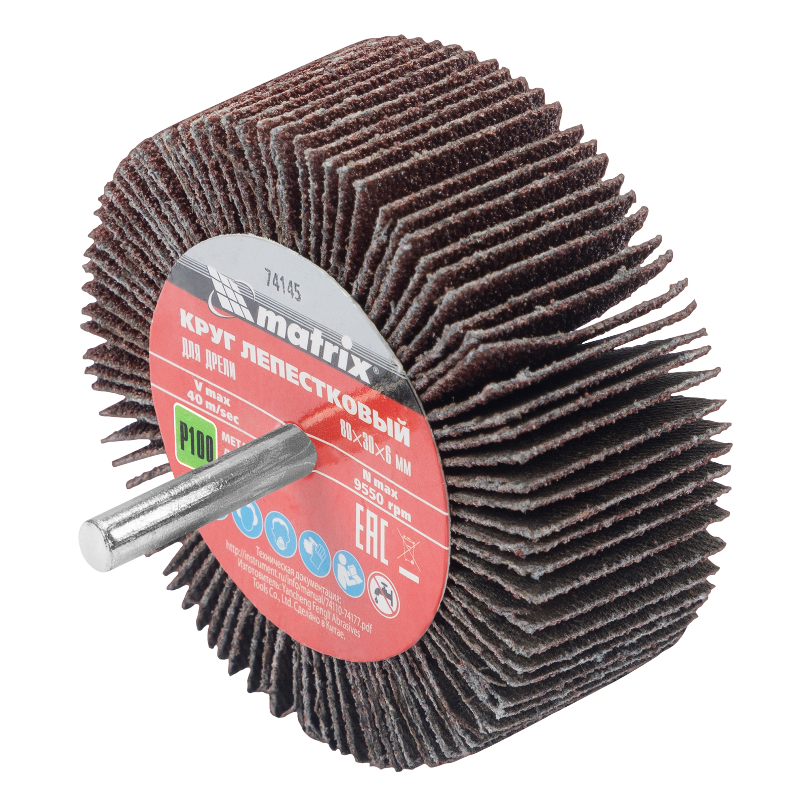 Лепестковый круг Matrix 74145 размером 80 х 30 х 6 мм, с зернистостью P 100, устанавливается в патрон дрели или прямой шлифовальной машины с посадочным диаметром 6 мм и максимальной скоростью вращения 6000 об/мин. Оснастка применяется для радиальной шлифовки внутренних и наружных поверхностей. Среднезернистый абразив P 100 успешно справляется с промежуточной обработкой металла и древесины — снятием тонкого слоя лака, краски, ржавчины и заусенцев.