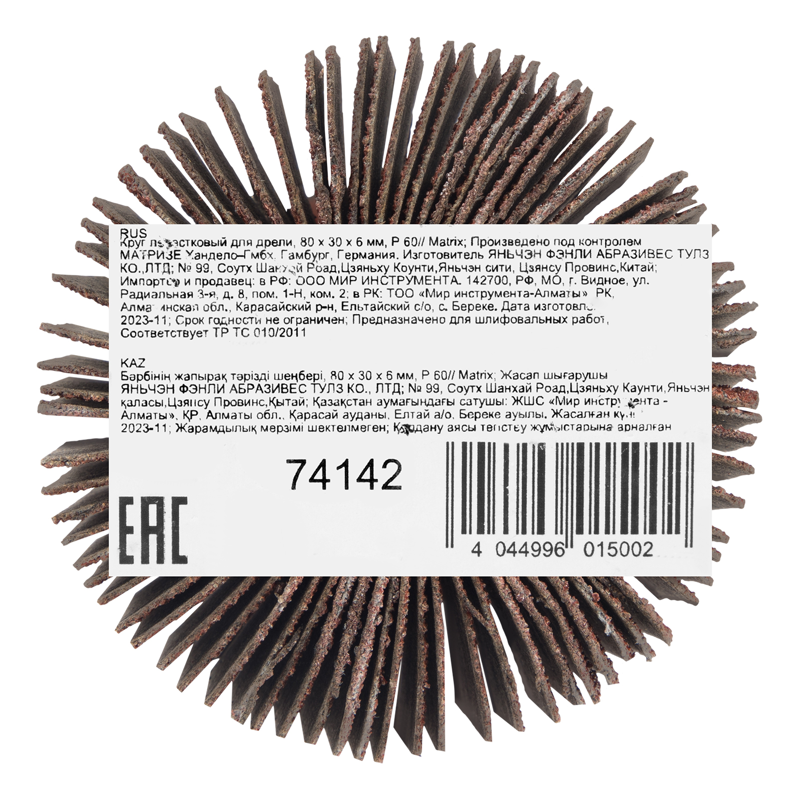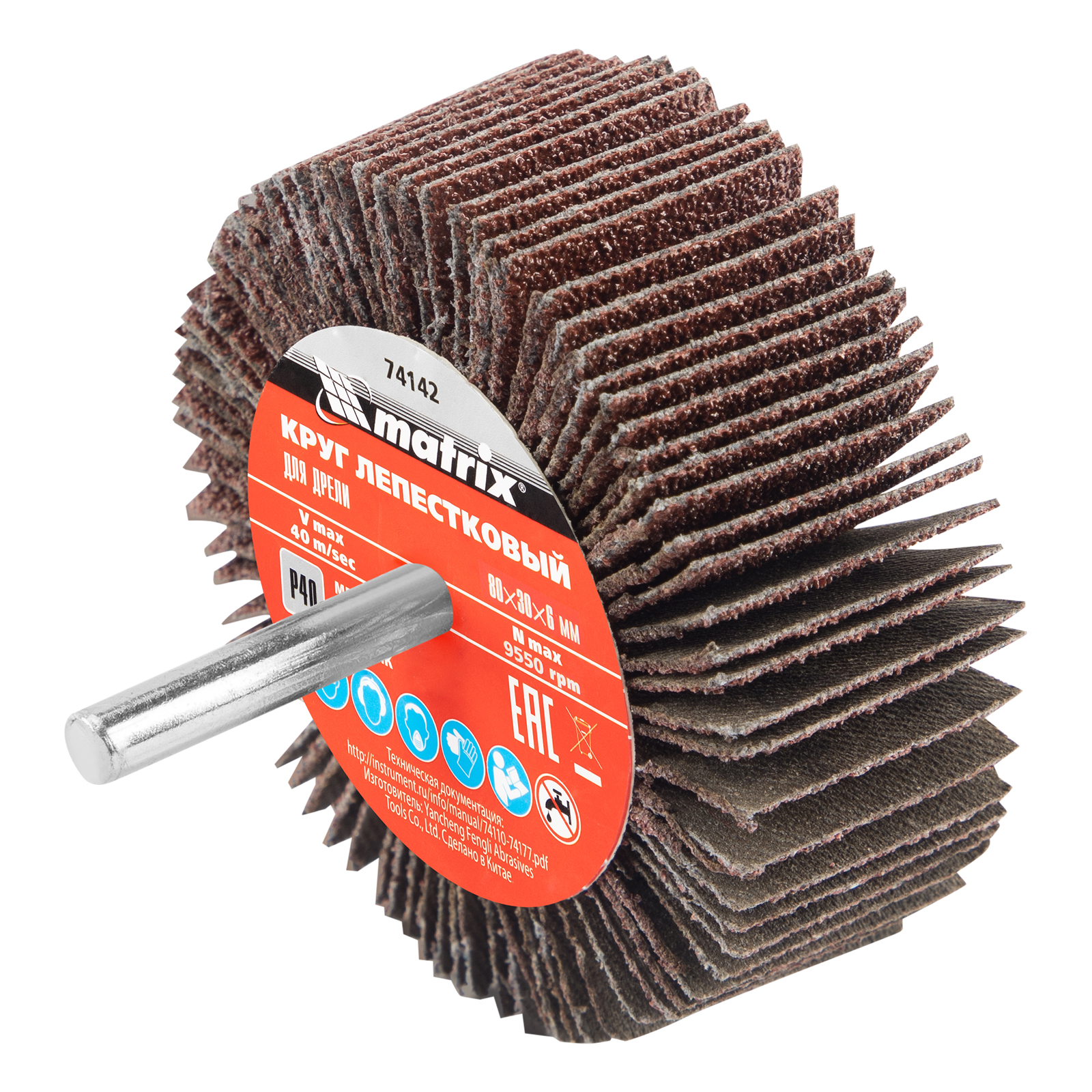 Лепестковый круг для дрели Matrix 74142 размером 80 х 30 х 6 мм, с зернистостью P 60, используется для черновой обработки металлических и деревянных поверхностей. Имеет стальной хвостовик диаметром 6 мм, при помощи которого устанавливается в патрон дрели или прямой шлифовальной машины с максимальной скоростью вращения 6000 об/мин. Крупнозернистый абразив P 60 легко удаляет слои ржавчины, краски и лака, обрабатывает сварные швы, удаляет заусенцы.