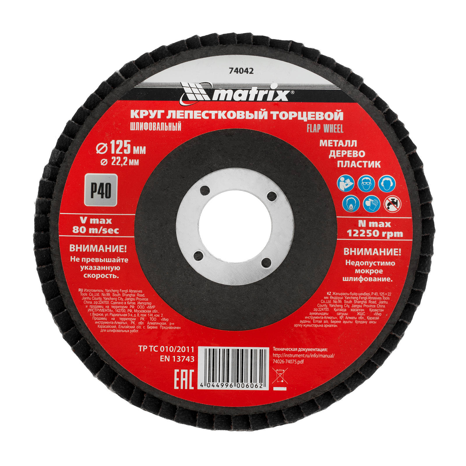 Круг лепестковый торцевой Matrix 74042 зернистостью Р40 и диаметром 125 мм за счет своей универсальности может использоваться для грубой (черновой) обработки практически любых поверхностей: деревянных, металлических, пластмассовых. Устанавливается на углошлифовальную машину с посадочным диаметром 22,2 мм. Эффективно удаляет дефекты с поверхностей, зачищает сварные швы, снимает толстый слой ЛКМ, ржавчины и т.д.
