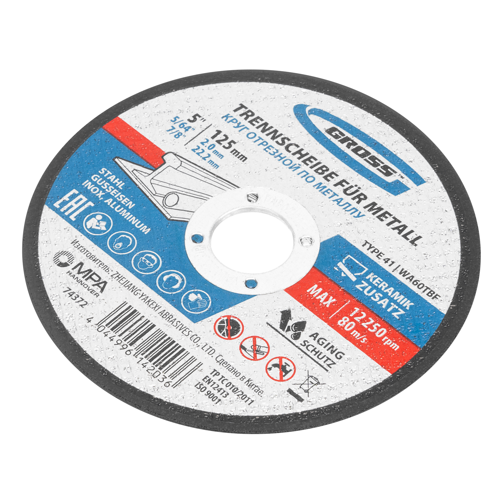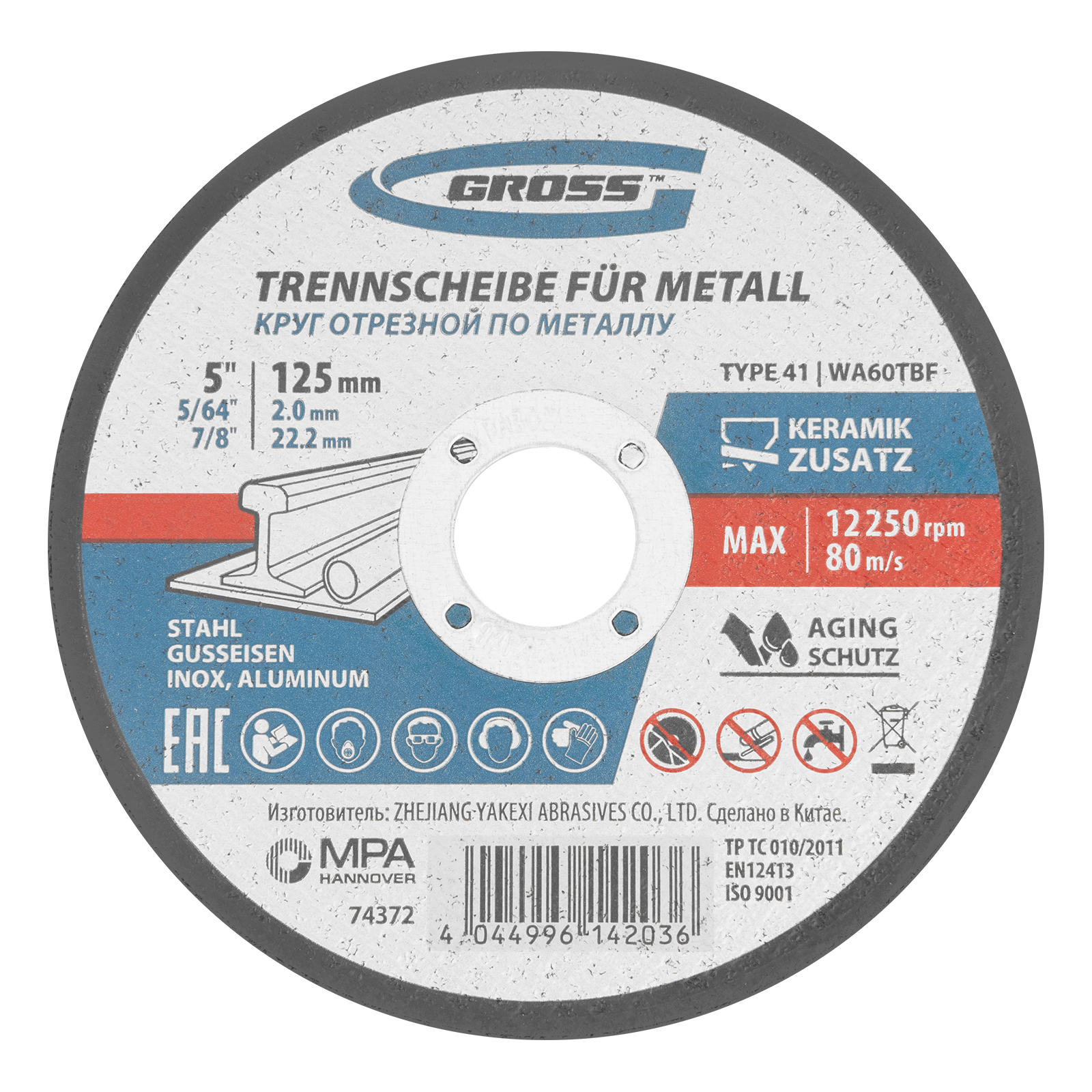 Отрезной круг по металлу Gross WA60TBF 74372 диаметром 125 мм и толщиной 2,0 мм устанавливается на фланец углошлифовальной машины с посадочным размером 22,2 мм. Предназначен для сухого резания углеродистых и нержавеющих сталей, а также алюминия и чугуна. Рекомендованная максимальная частота вращения составляет 12250 об/мин. Круг выдерживает высокие нагрузки и подходит для профессионального использования.